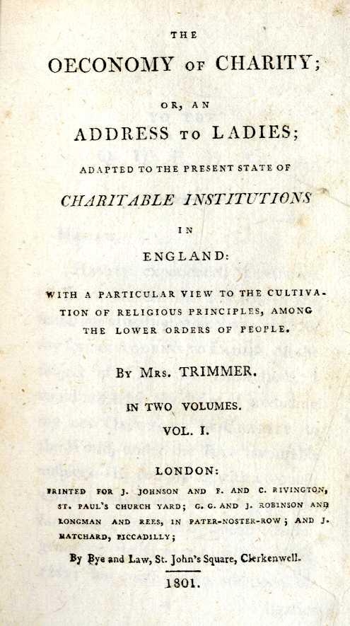 Trimmor (Mrs. Sarah) The Oeconomy of Charity; or, an Address to Ladies; Adapted to the Present State of Charitable Institutions in England. Sm. 8vo L. 1801. First Edn., cont. sheep, gilt lined spine,mor. labels. Good. (2)