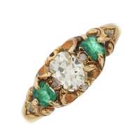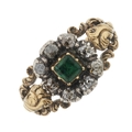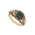 A late Georgian emerald and old-cut diamond cluster ring, with scrolling shoulders and band, emerald measures approximately 3.7 by 3.5mm, estimated total diamond weight 0.15ct, ring size K, 3.5g