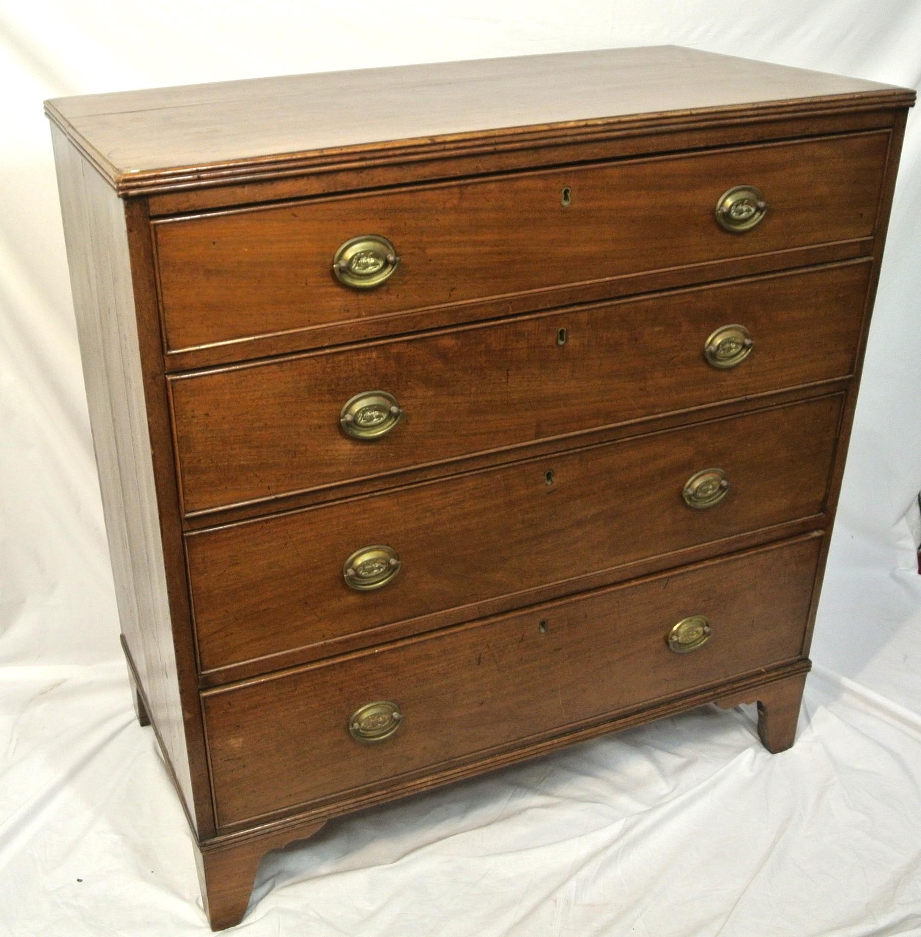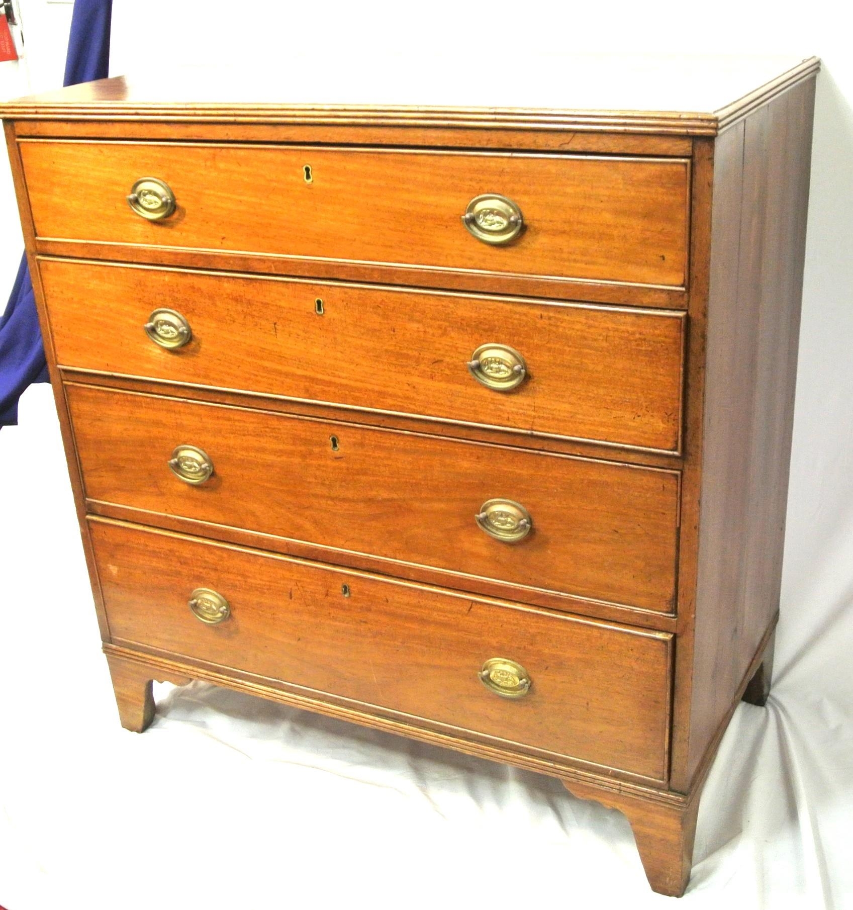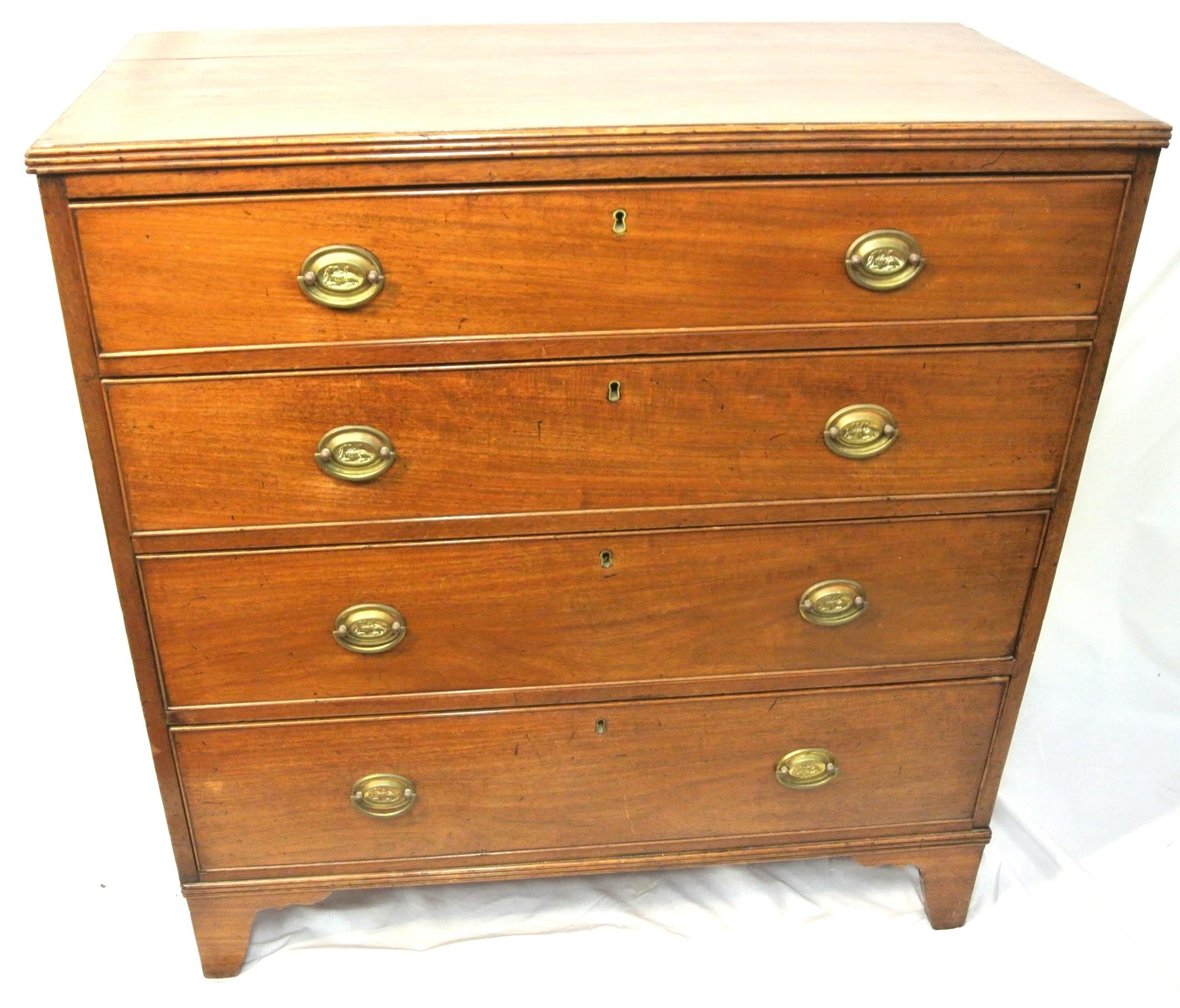 Edwardian mahogany chest of four drawers with oval brass drop handles, reeded borders, on bracket feet
