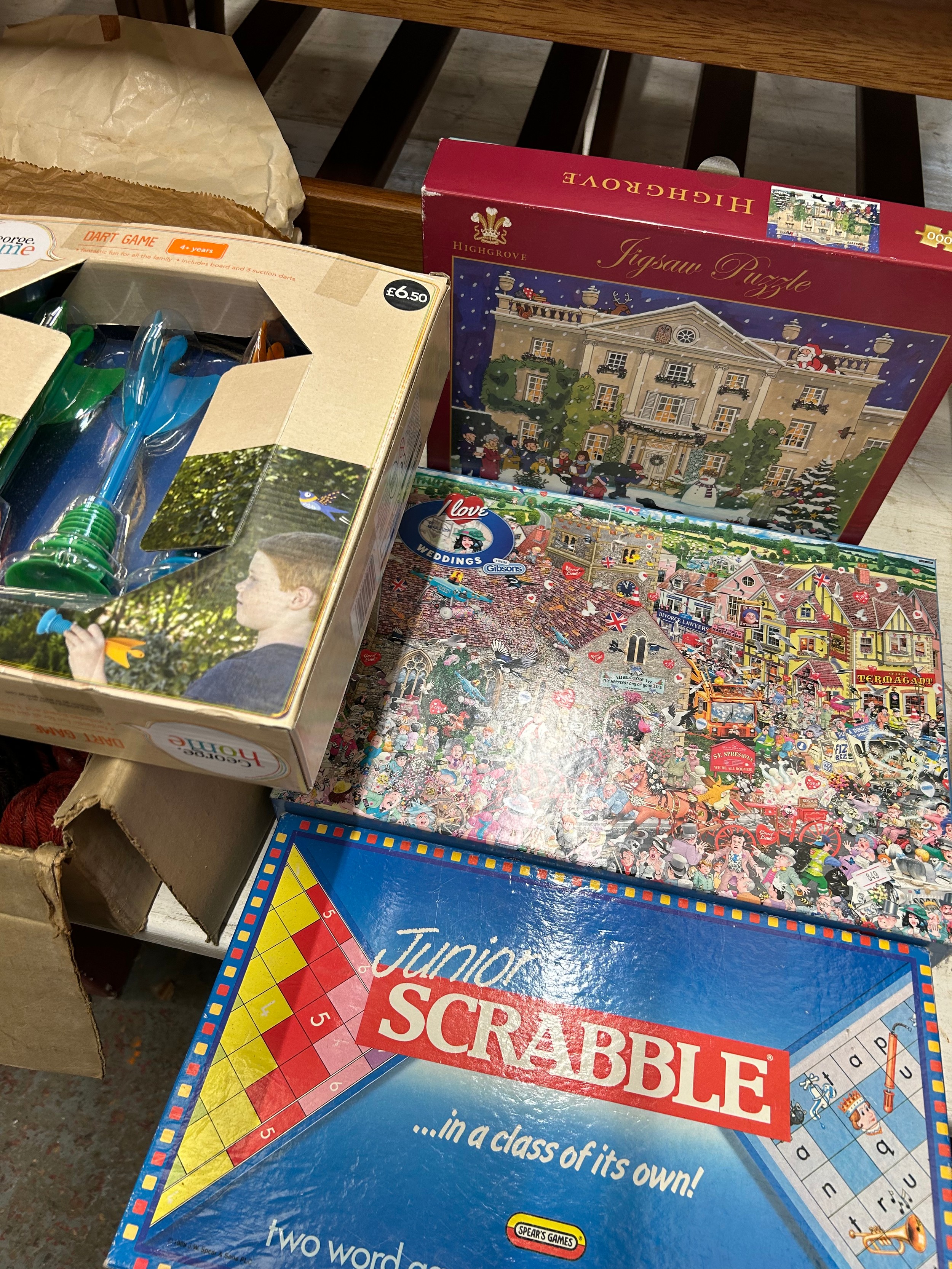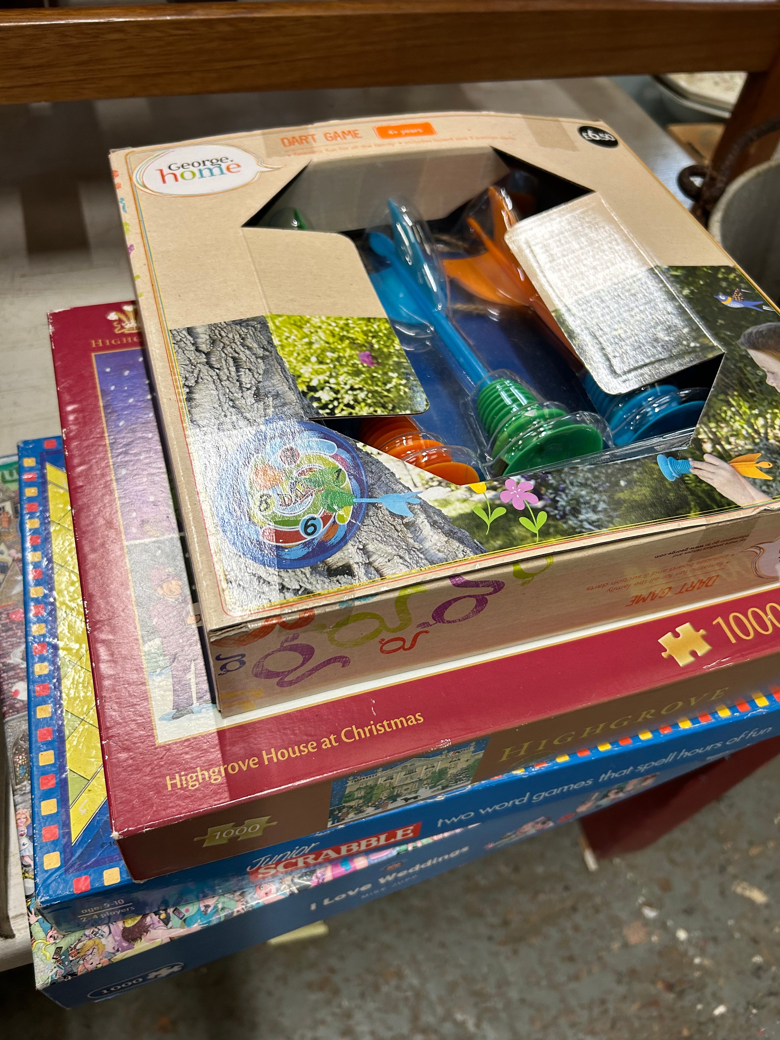4 boxed board games :- I Love Weddings, Junior Scrabble, Highgrove & Dart Game