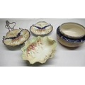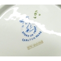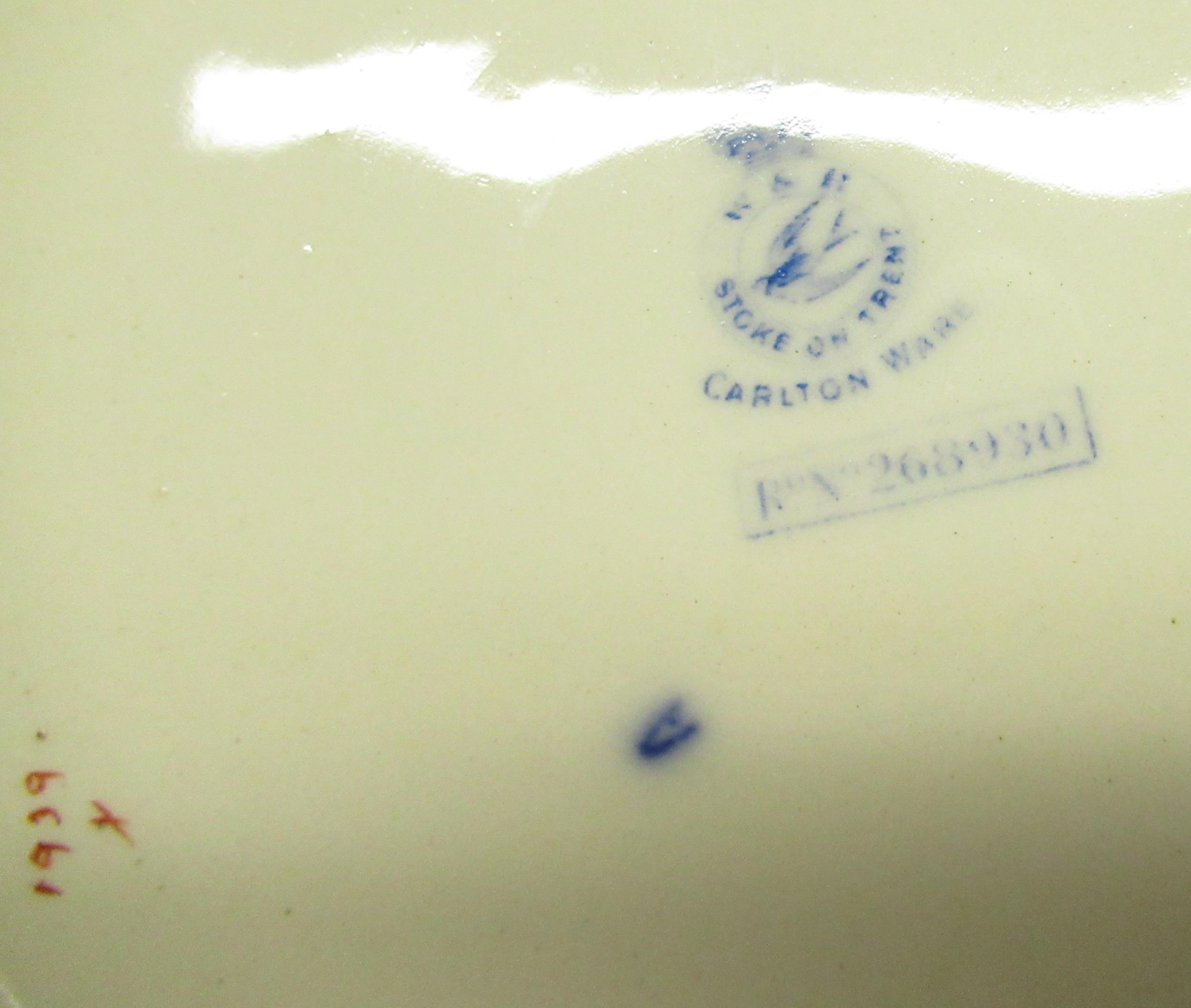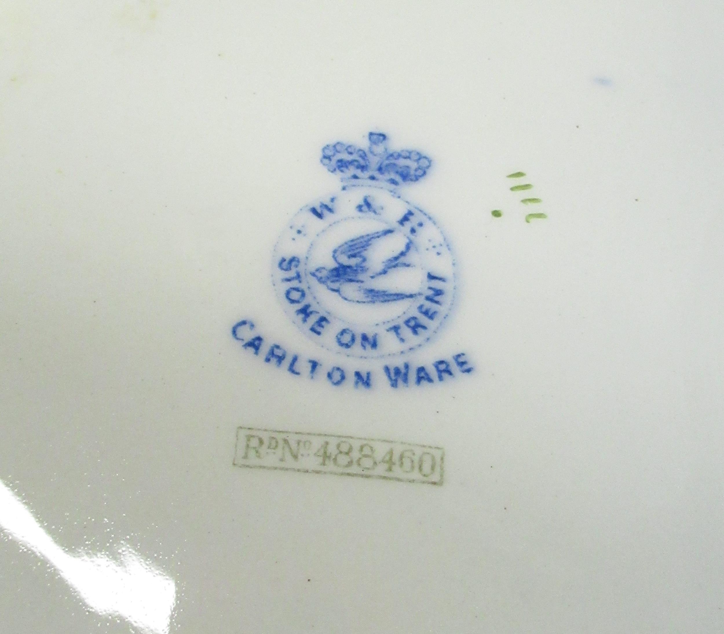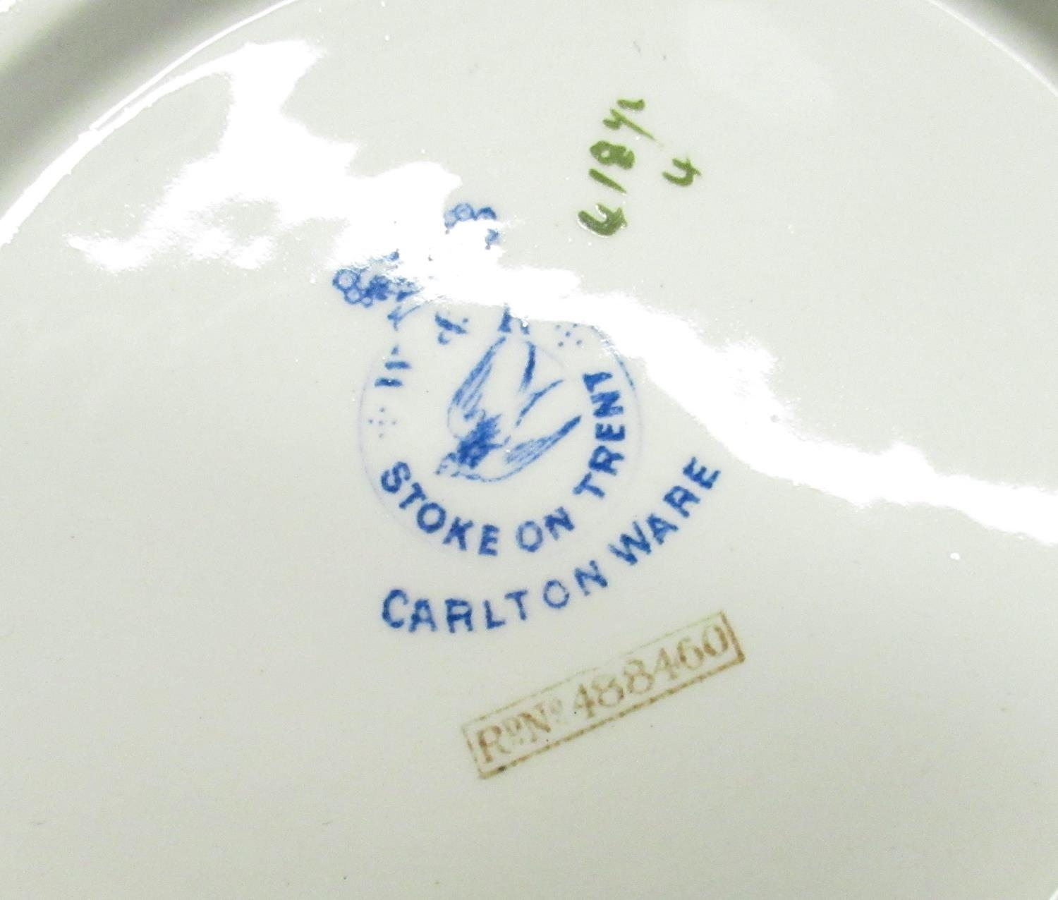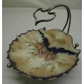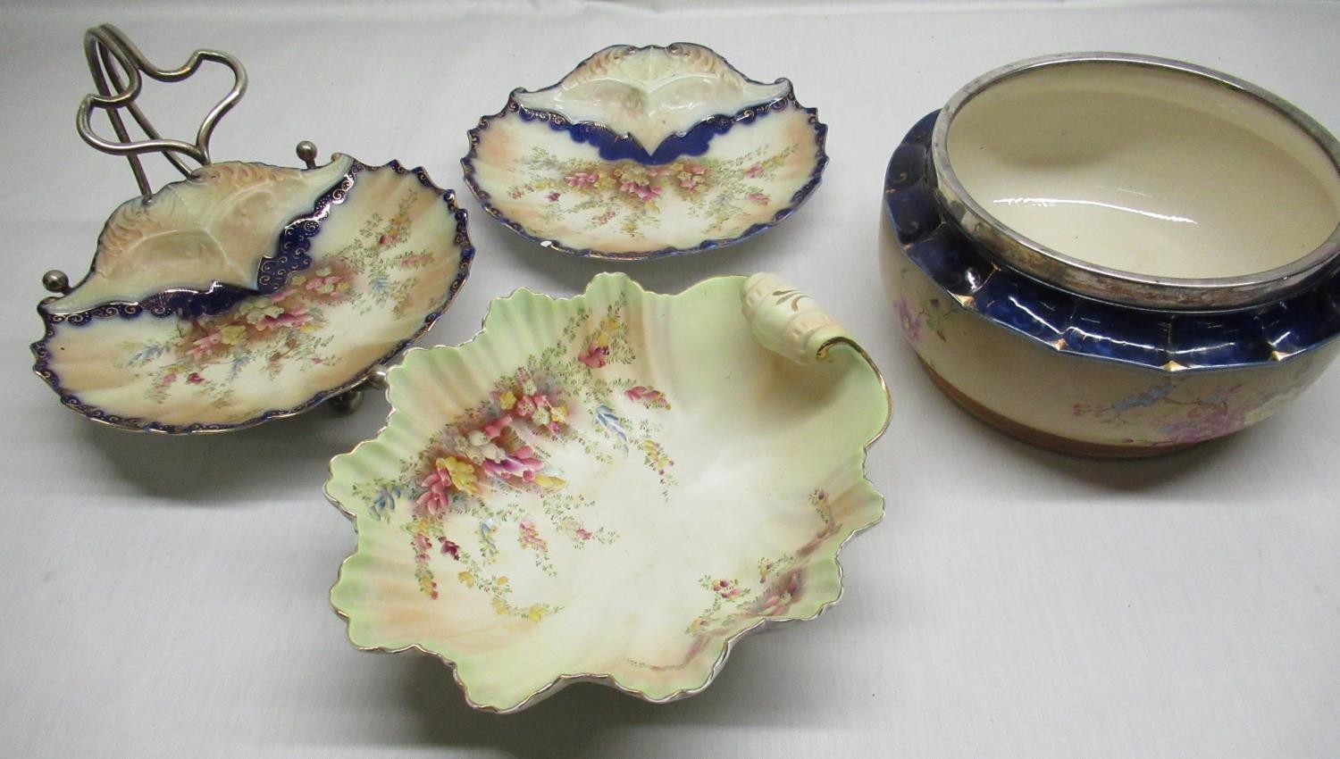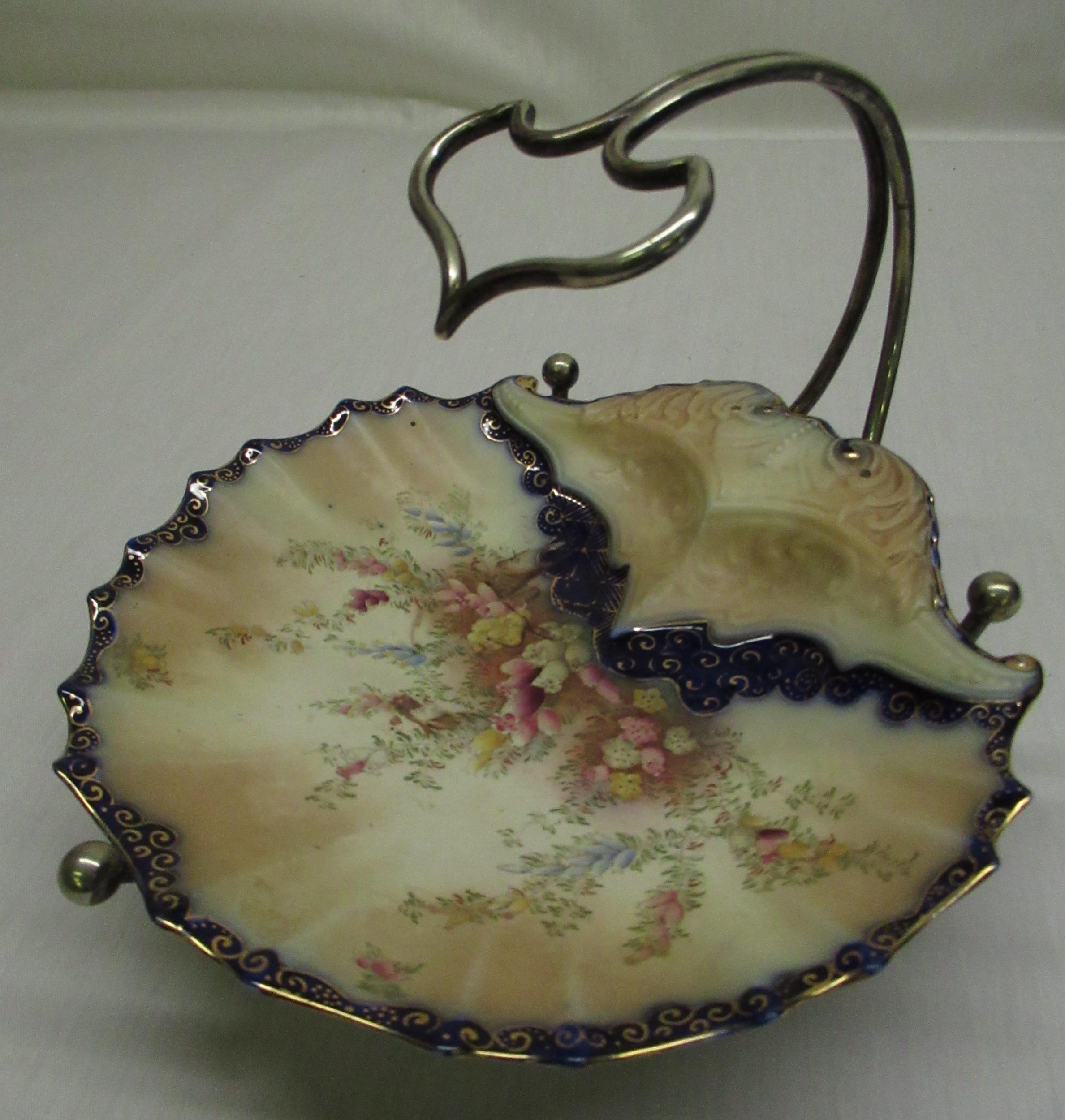 W & R Carlton Ware cake plate, blush ground hand painted with flowers on silver plated stand bearing Rd. No. 488460, matching plate, W & R Carlton Ware shell shaped fruit bowl, blush ground hand painted floral decoration Rd. No. 488460, W & R Carlton Ware fruit bowl with silver plated mounts, Rd. No. 268930 (4)