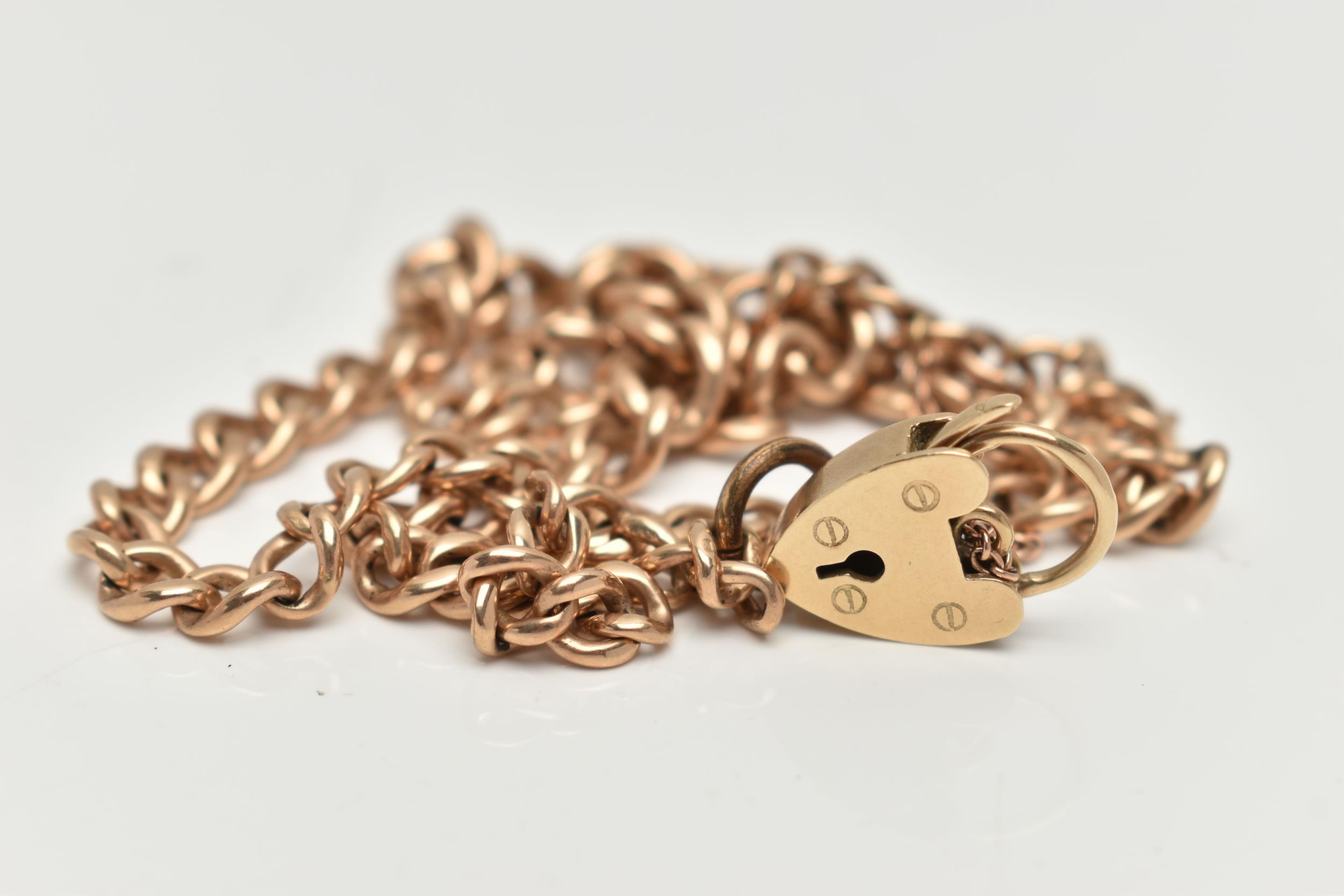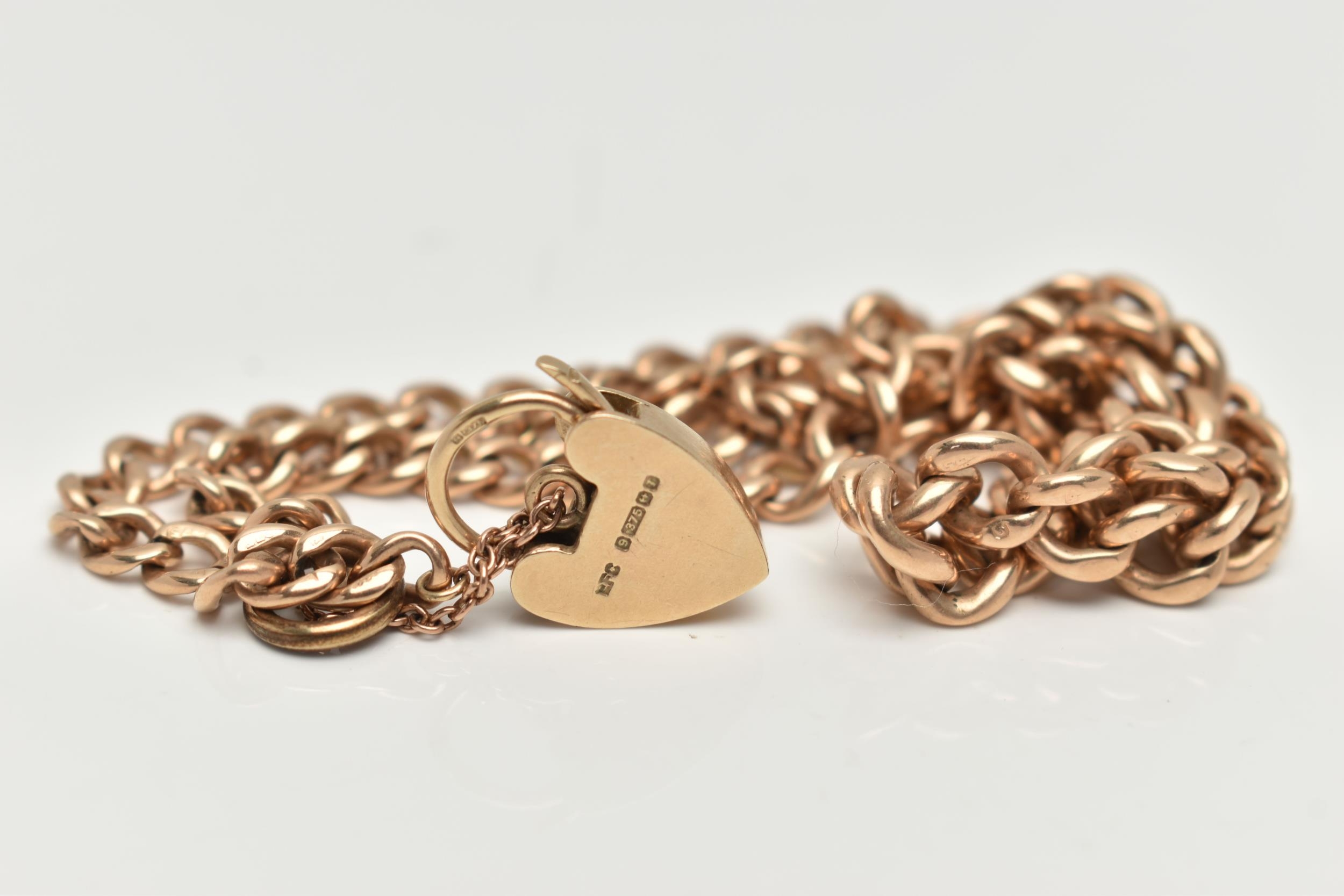 A 9CT GOLD BRACELET, two curb link bracelets fitted together with a heart padlock clasp, clasp hallmarked 9ct Birmingham, links stamped 375, approximate gross weight 26.2 grams (condition report: general moderate wear, some rubbing to links and stamps, clasp very stiff, overall condition good)