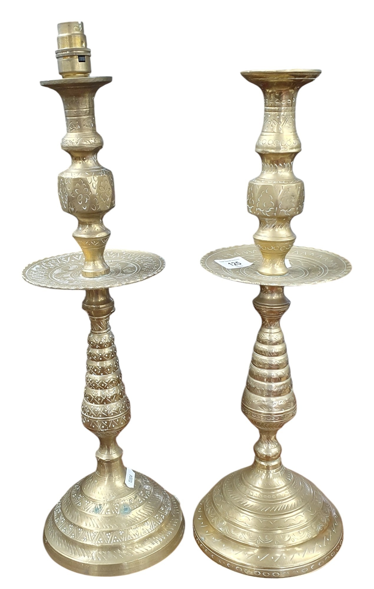 A good pair of early 20th Century Brass Candlesticks with one converted. TB 52 cm approx.