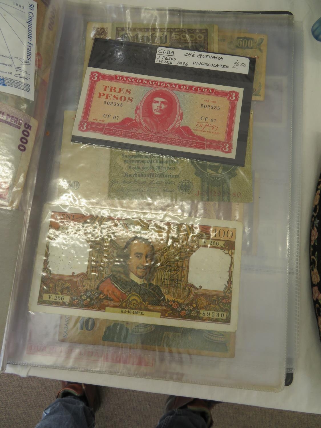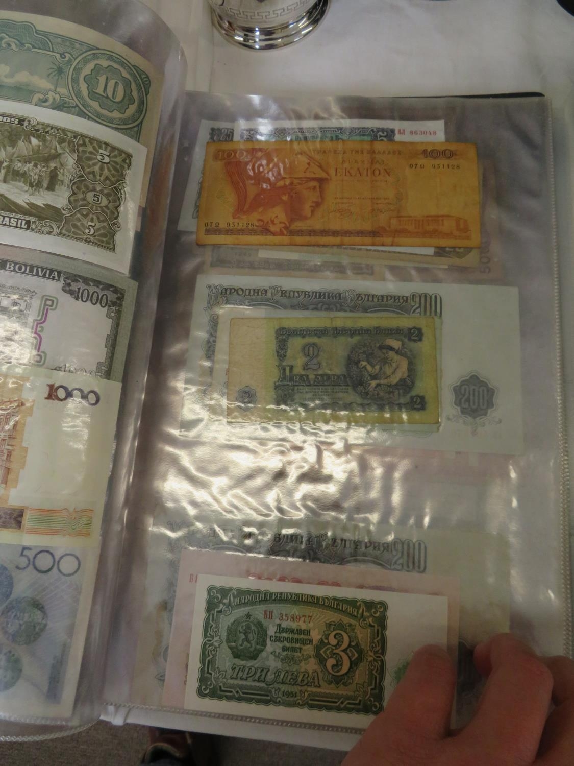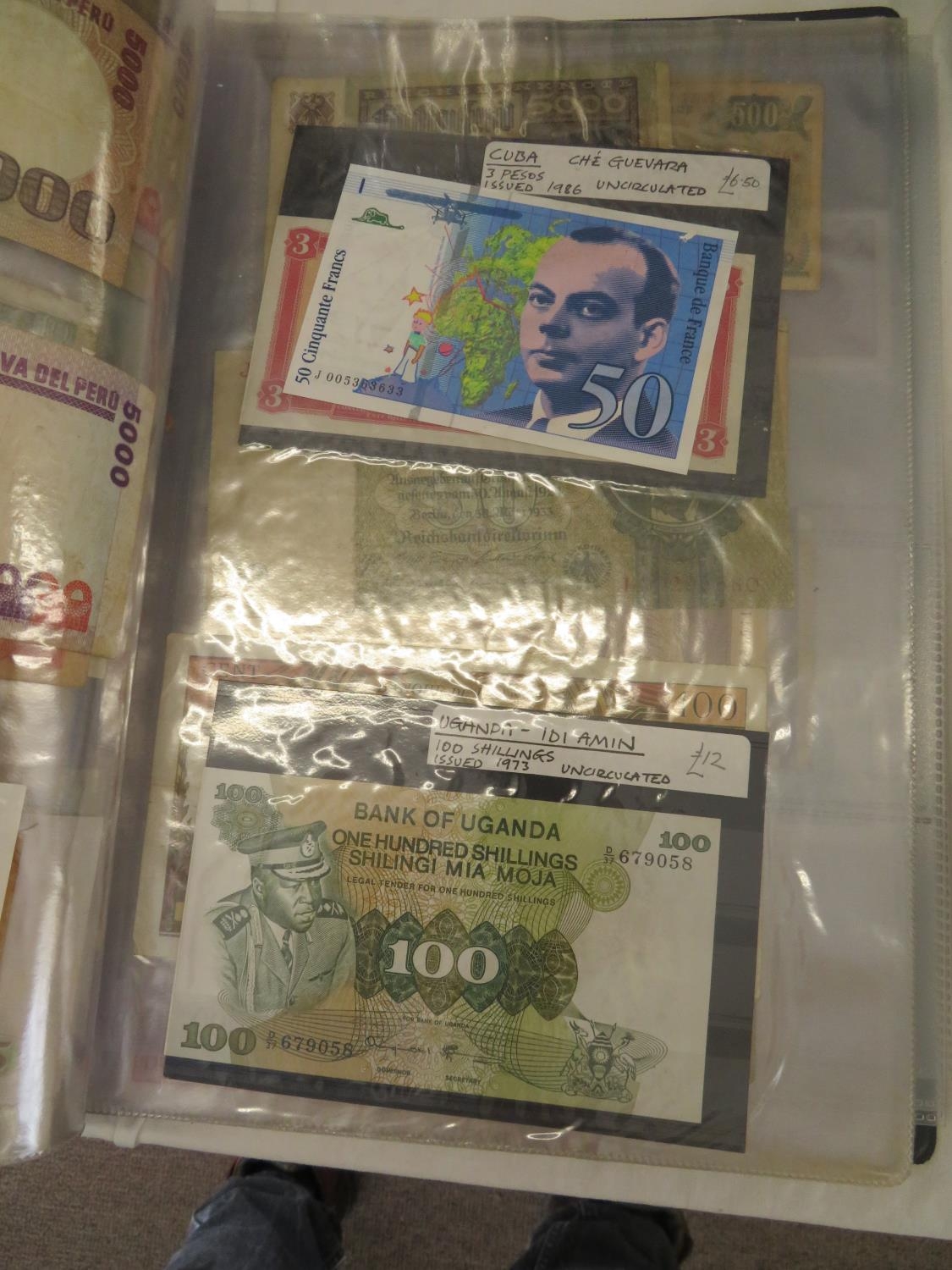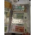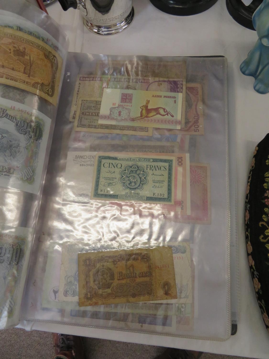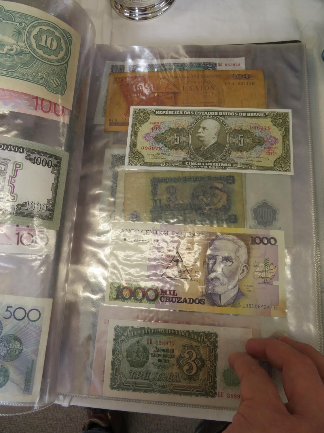 A folder full of numerous world wide bank notes