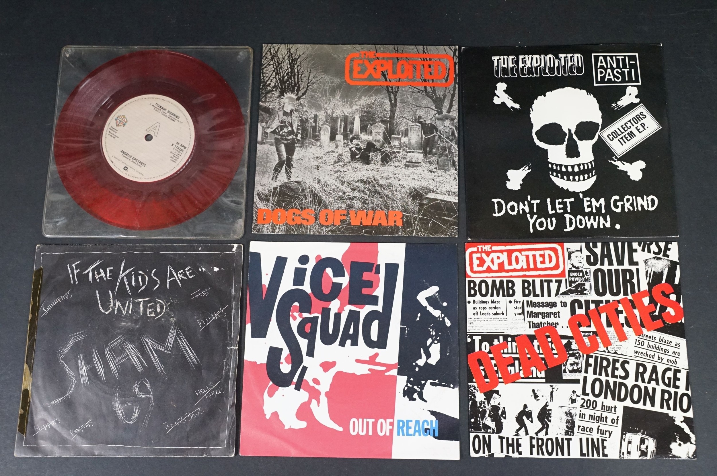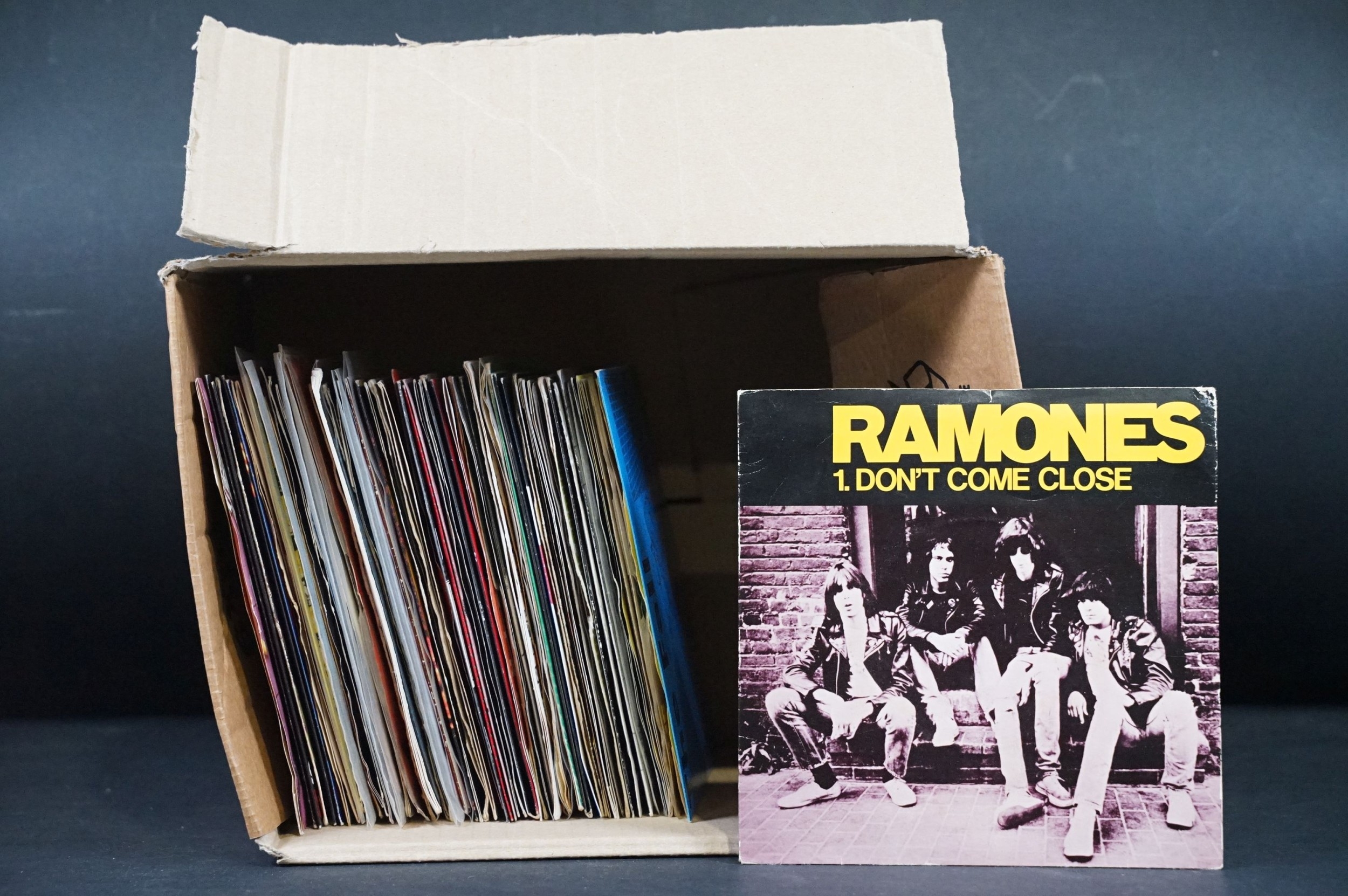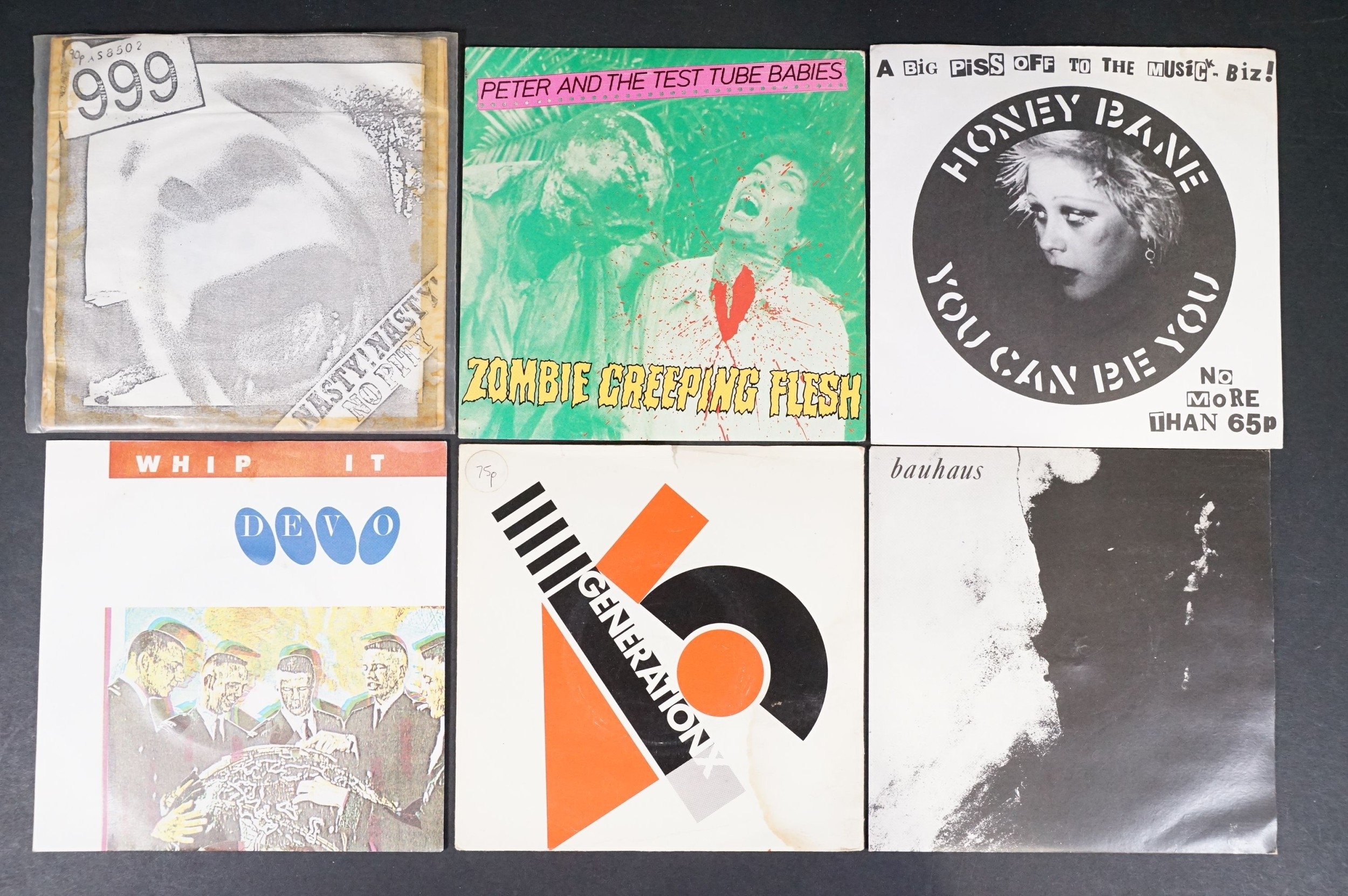 Vinyl - 66 Punk & New Wave 7" singles to include Ramones (yellow vinyl), The Fall, The Undertones x 4 (inc green vinyl), Anti Nowhere League x 3 (inc pic disc), The Jam, Dead Kennedys, Cash Pussies, The Members (clear vinyl), Angelic Upstarts (red vinyl), The Exploited x 3, Sham 69 x 2, Vice Squad, Captain Sensible (Crass Records), Peter & The Test Tube Babies, 999, The Vibrators, Honey Bane (Crass Records), Crass, Bauhaus x 2, Generation X, Devo, The Lurkers (double), The Dickies x 2 (inc coloured), The Ruts x 3, Siouxsie & The Banshees x 2, Buzzcocks x 2, Stiff Little Fingers, XTC x 2 and others. Vg+ overall