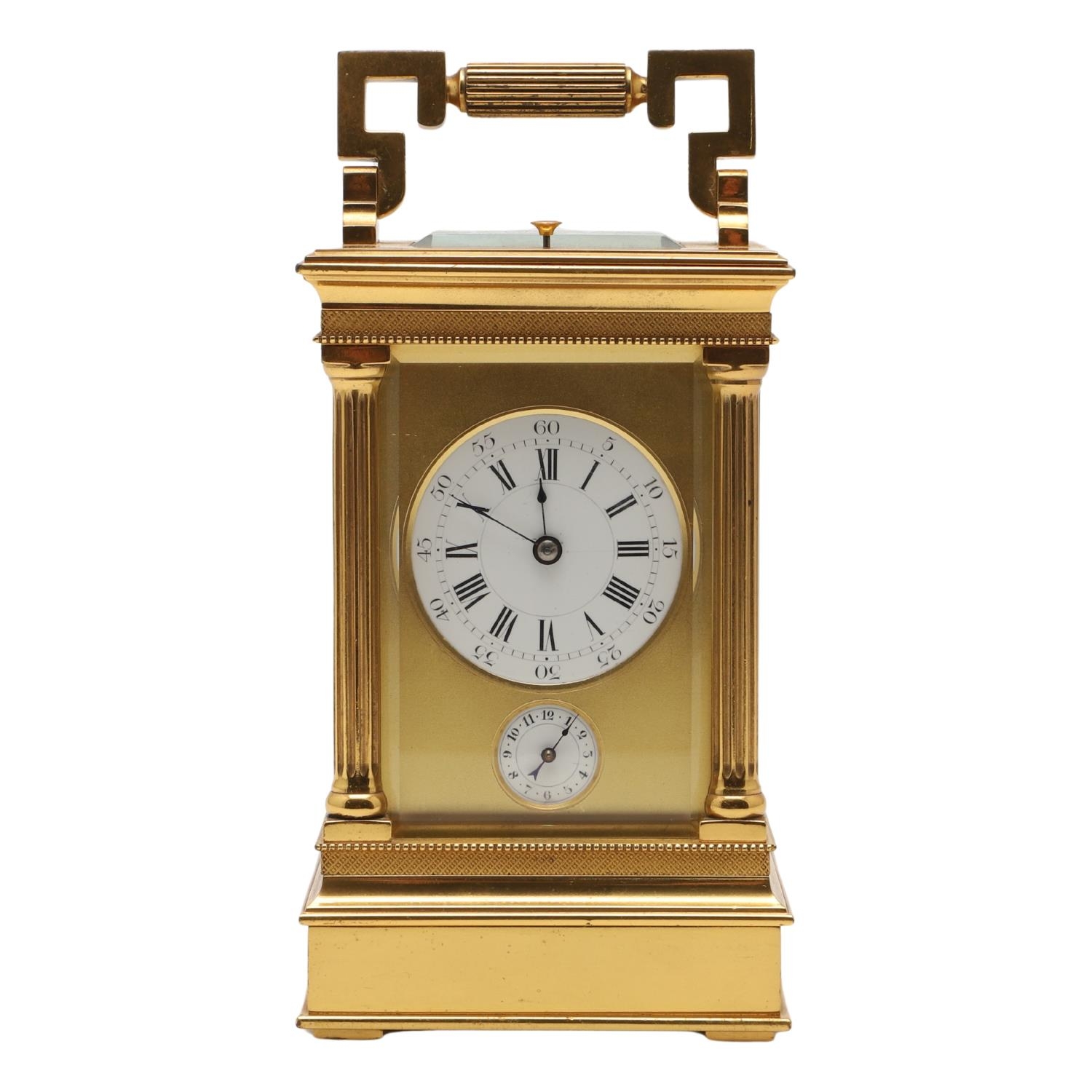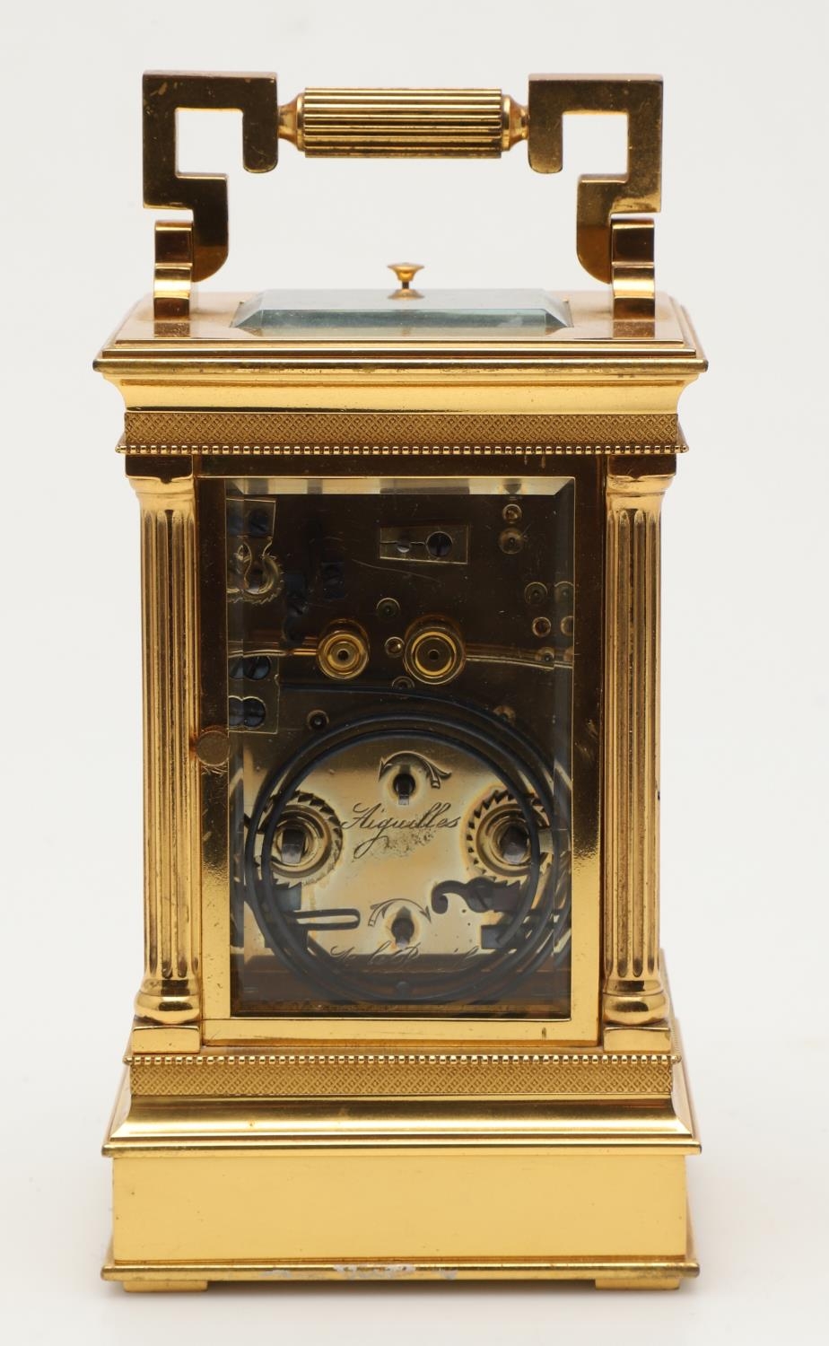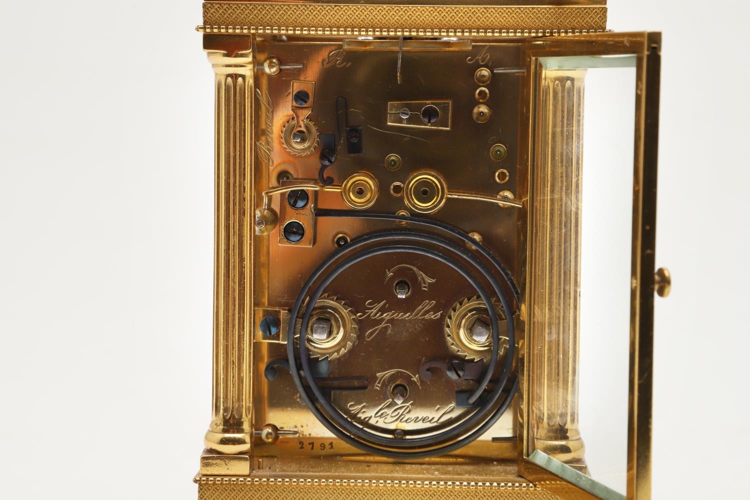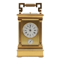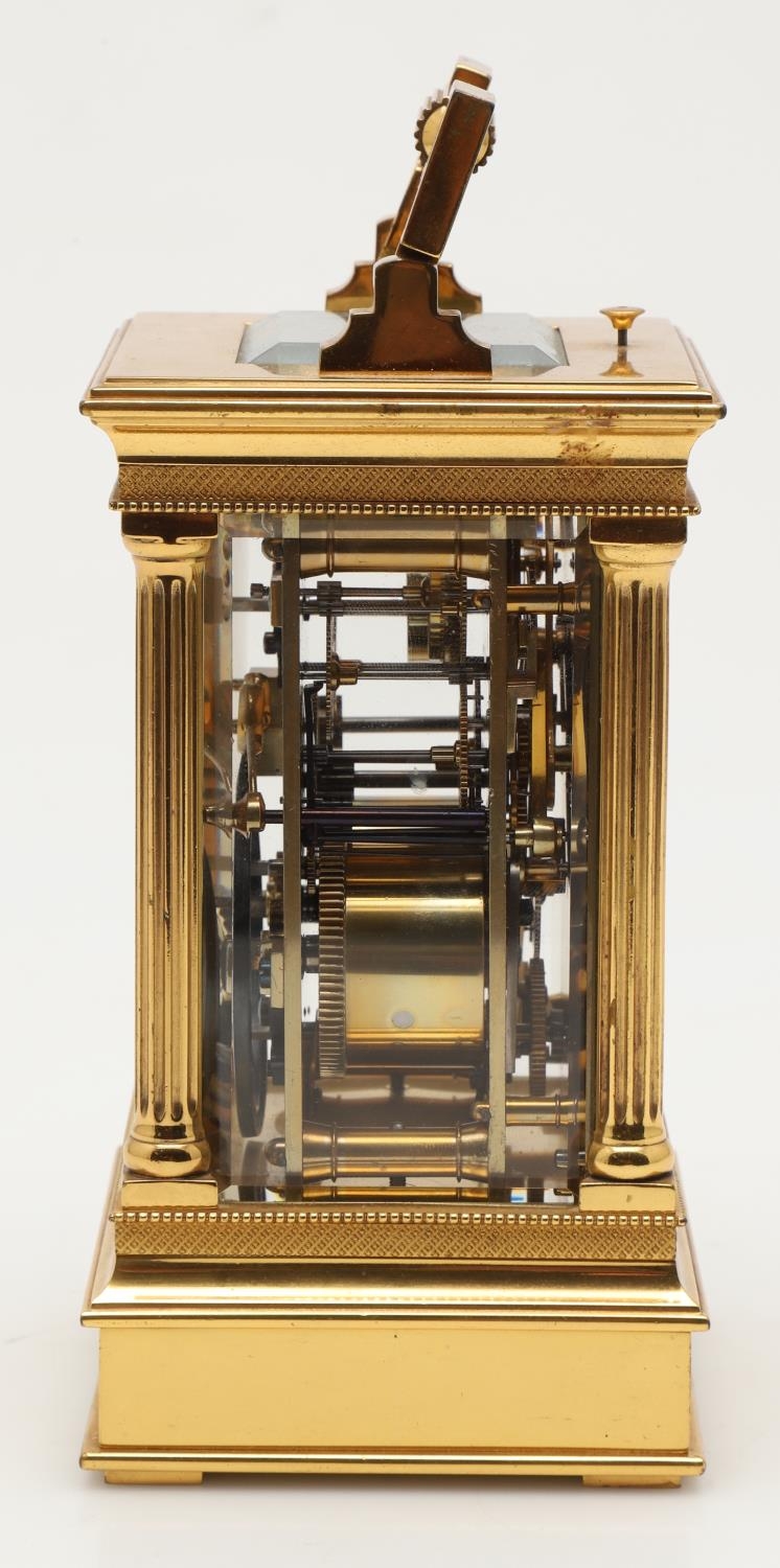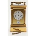 A 19TH CENTURY FRENCH STRIKE REPEATER BRASS CARRIAGE CLOCK. the circular enamel dial with Roman numerals and subsidiary alarm dial to an eight day movement striking to a gong, the gilt case with Corinthian columns and finely chased diamond pattern detail, height 20cm.