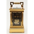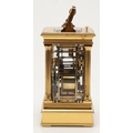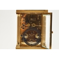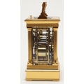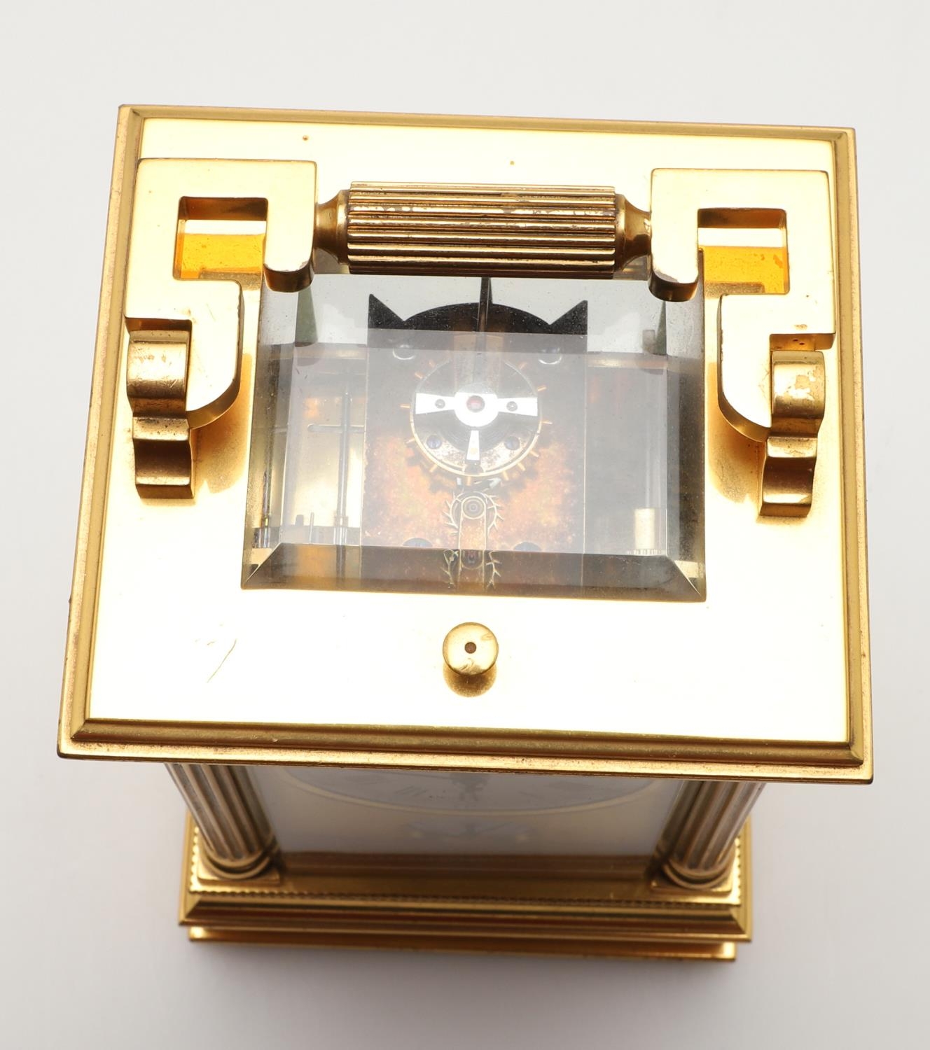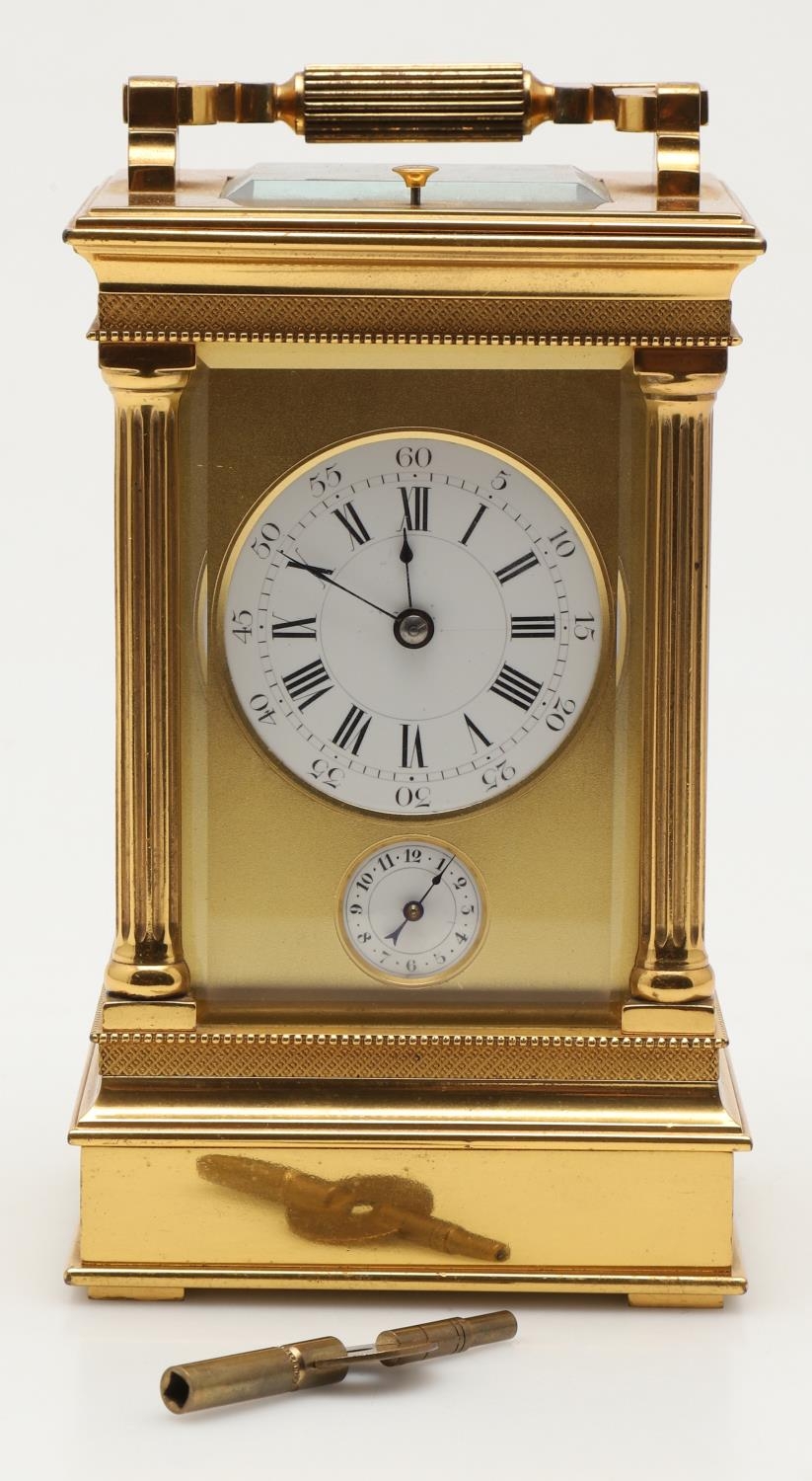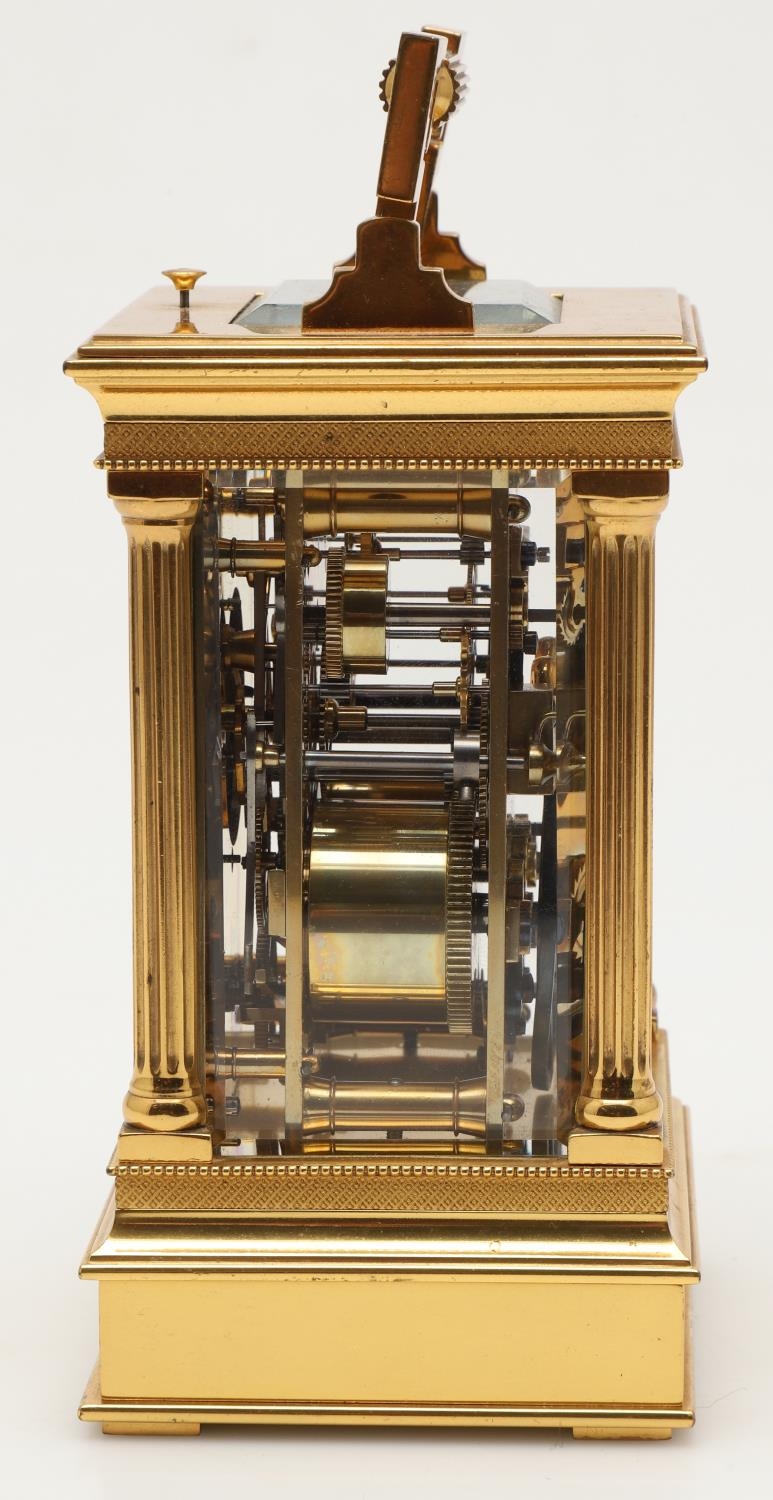 A 19TH CENTURY FRENCH STRIKE REPEATER BRASS CARRIAGE CLOCK. the circular enamel dial with Roman numerals and subsidiary alarm dial to an eight day movement striking to a gong, the gilt case with Corinthian columns and finely chased diamond pattern detail, height 20cm.
