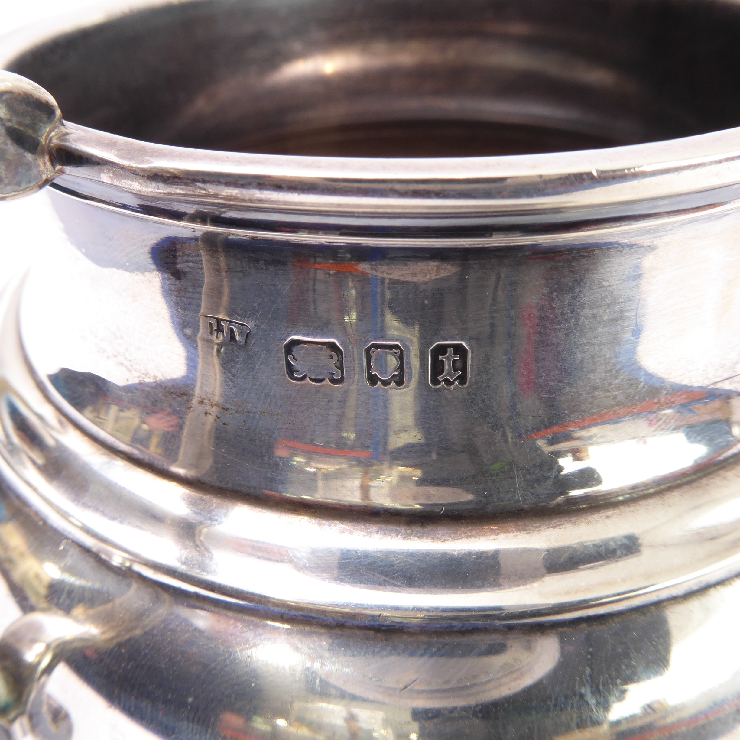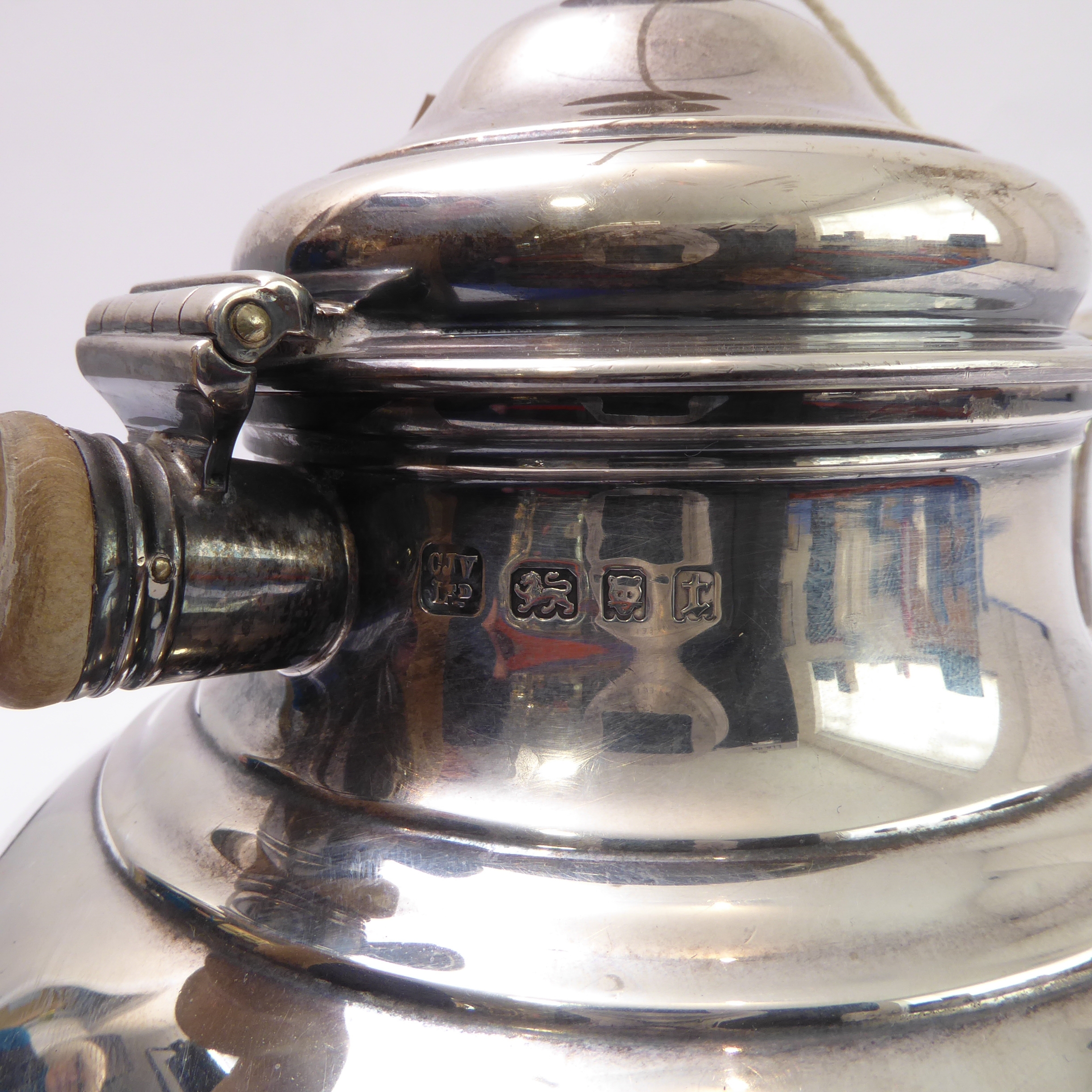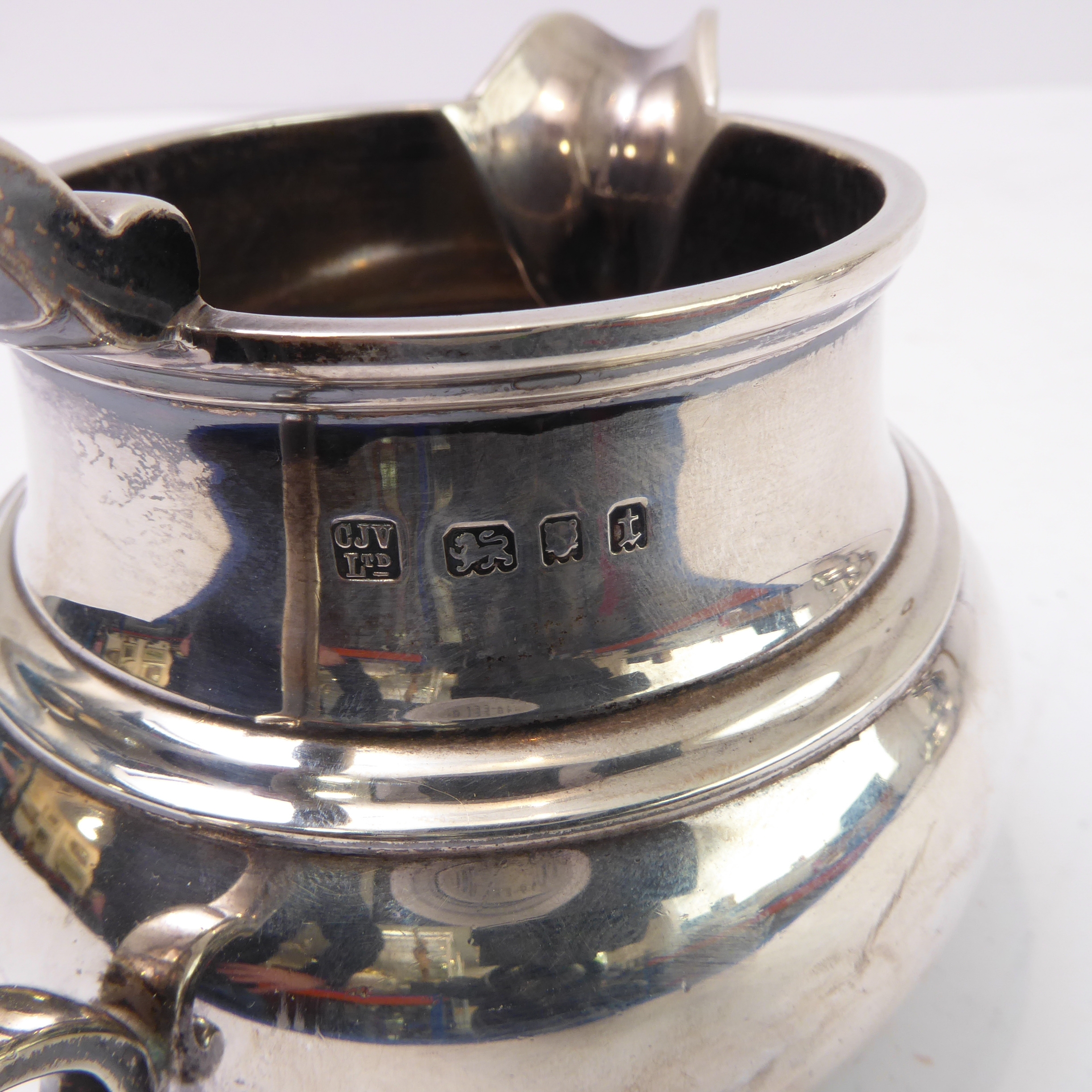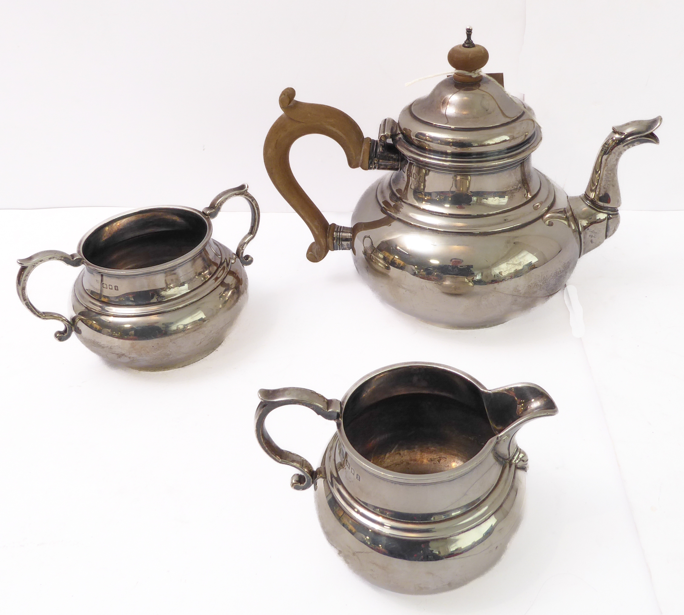 A heavy three-piece, hallmarked-silver tea service comprising teapot of squat globular form, two-handled sugar and milk/cream jug, each raised on circular foot, maker's mark CJV Ltd, London assay marks for 1934 (total approx. weight including wooden finial and carved handle approx. 1235g)