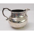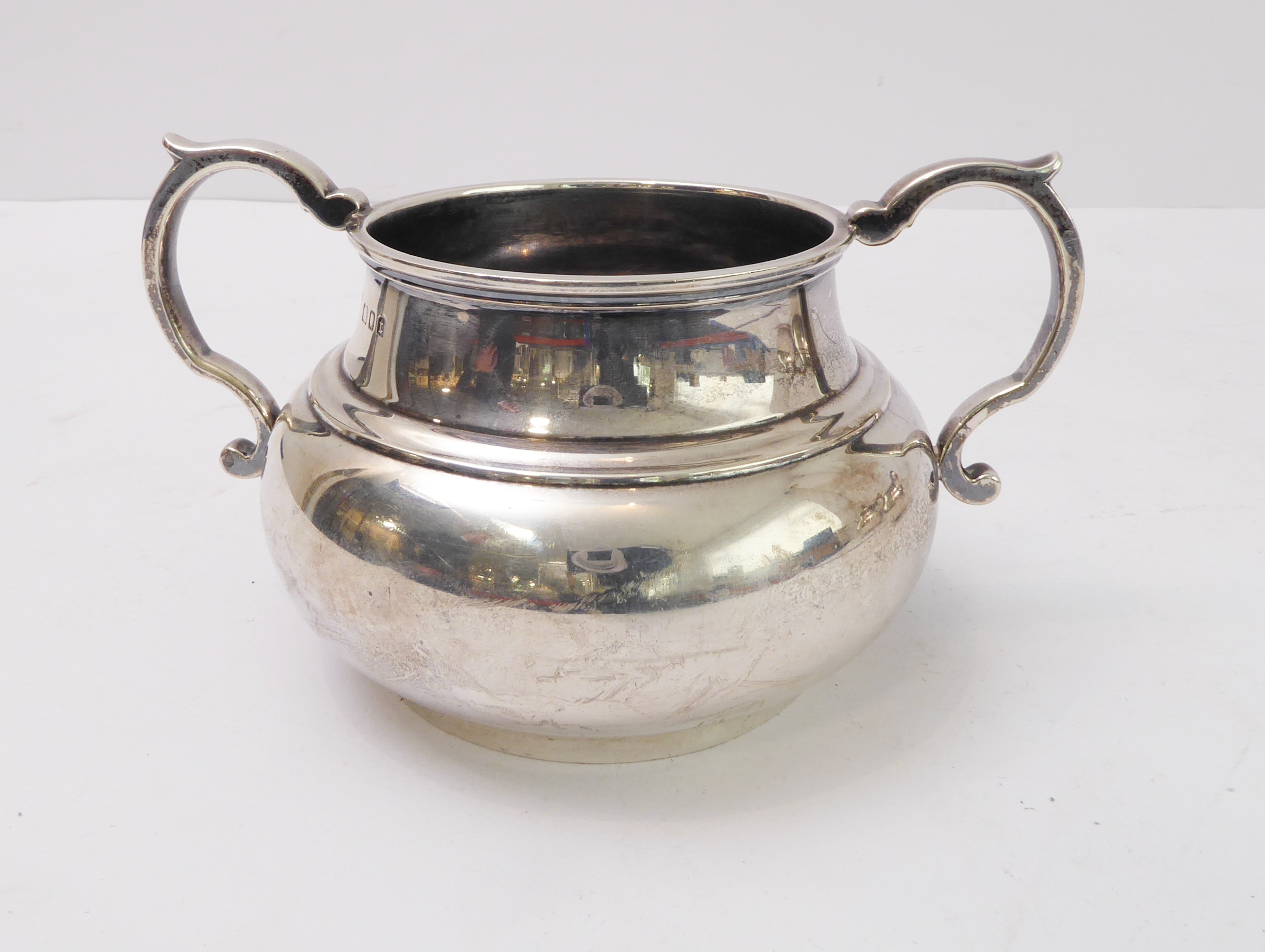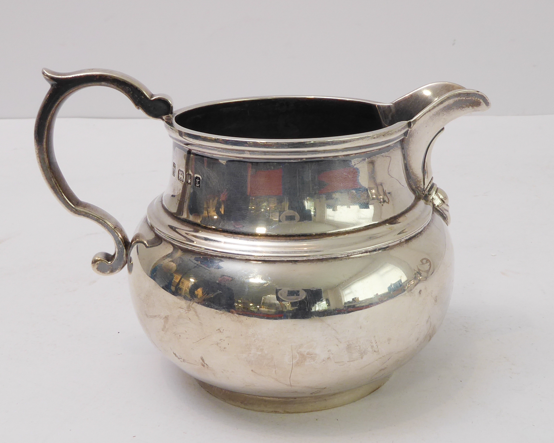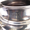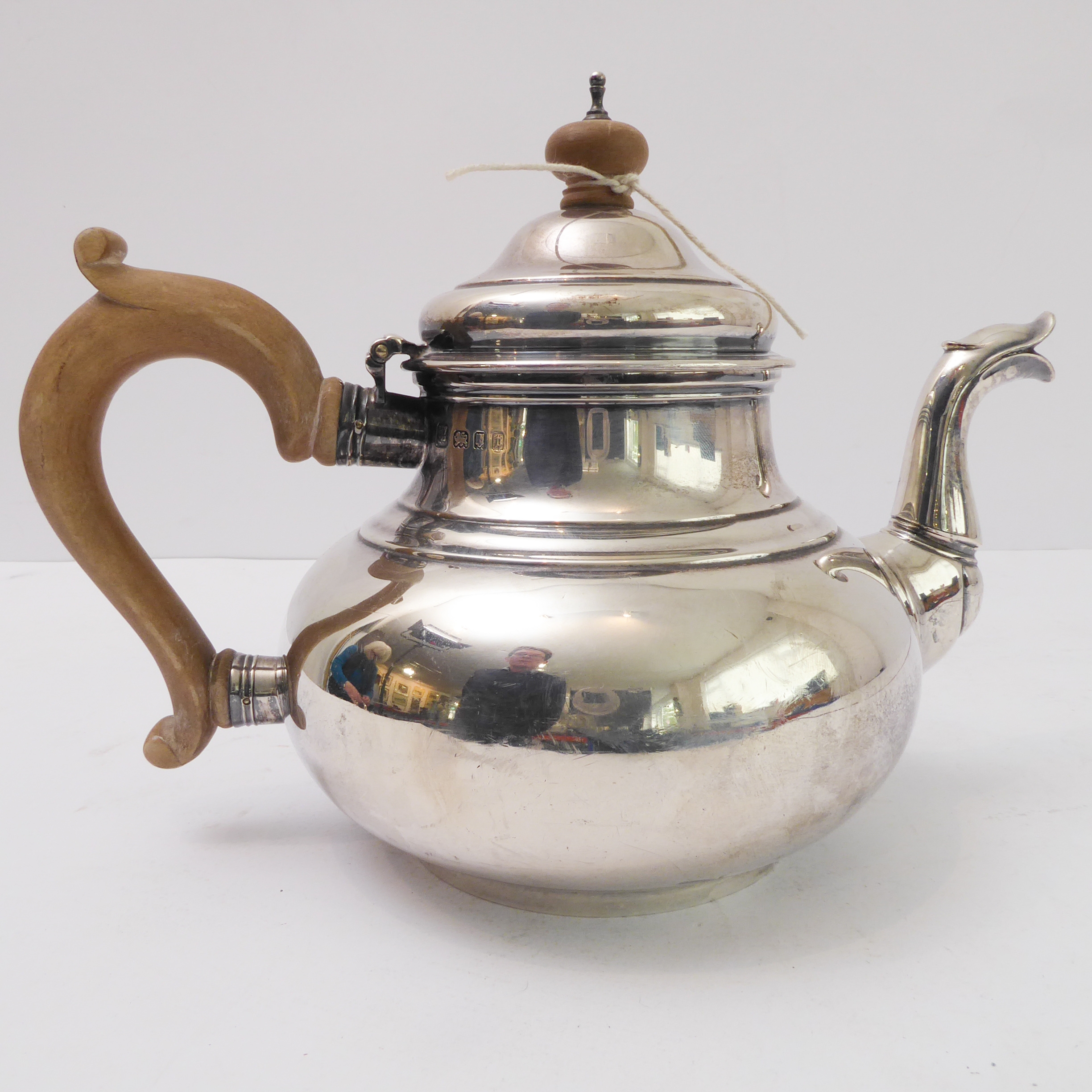 A heavy three-piece, hallmarked-silver tea service comprising teapot of squat globular form, two-handled sugar and milk/cream jug, each raised on circular foot, maker's mark CJV Ltd, London assay marks for 1934 (total approx. weight including wooden finial and carved handle approx. 1235g)