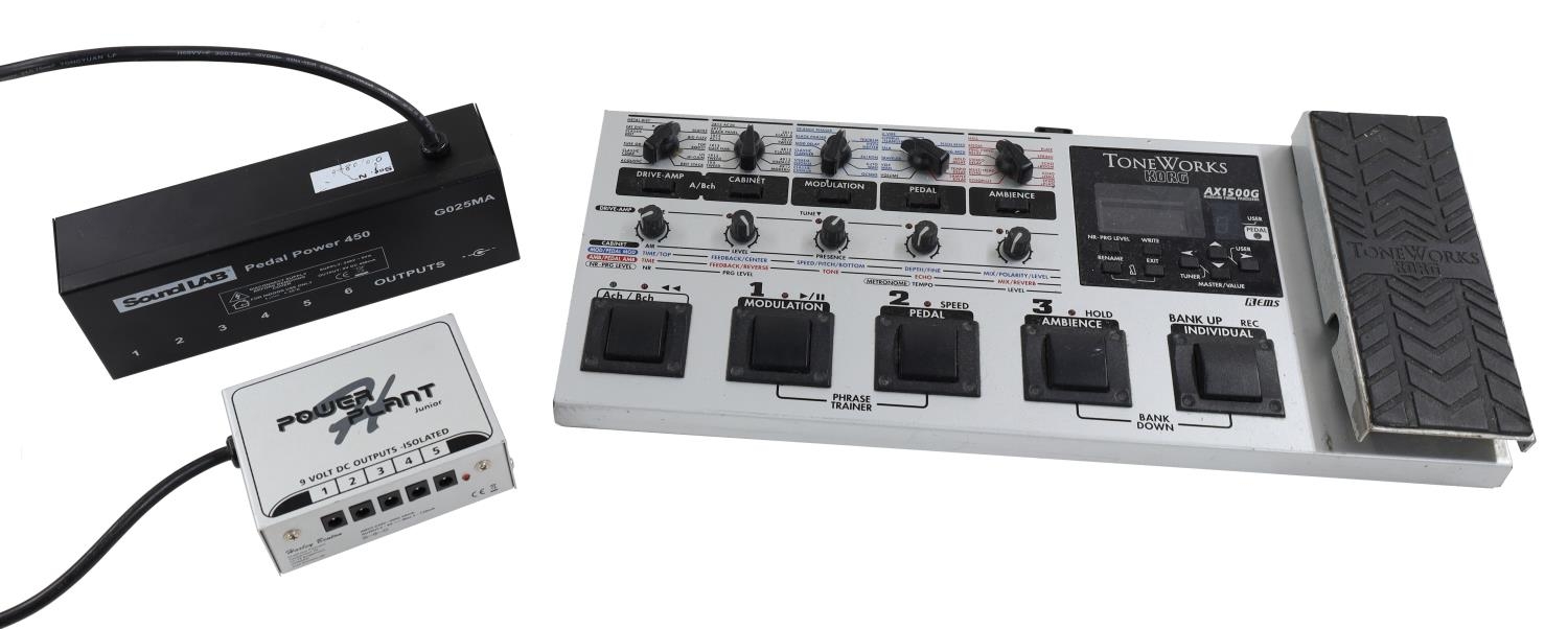 Korg Toneworks AX1500G guitar pedal, boxed; together with a SoundLab Pedal Power 450 power bank and a Harley Benton Power Plant Junior guitar pedal power bank