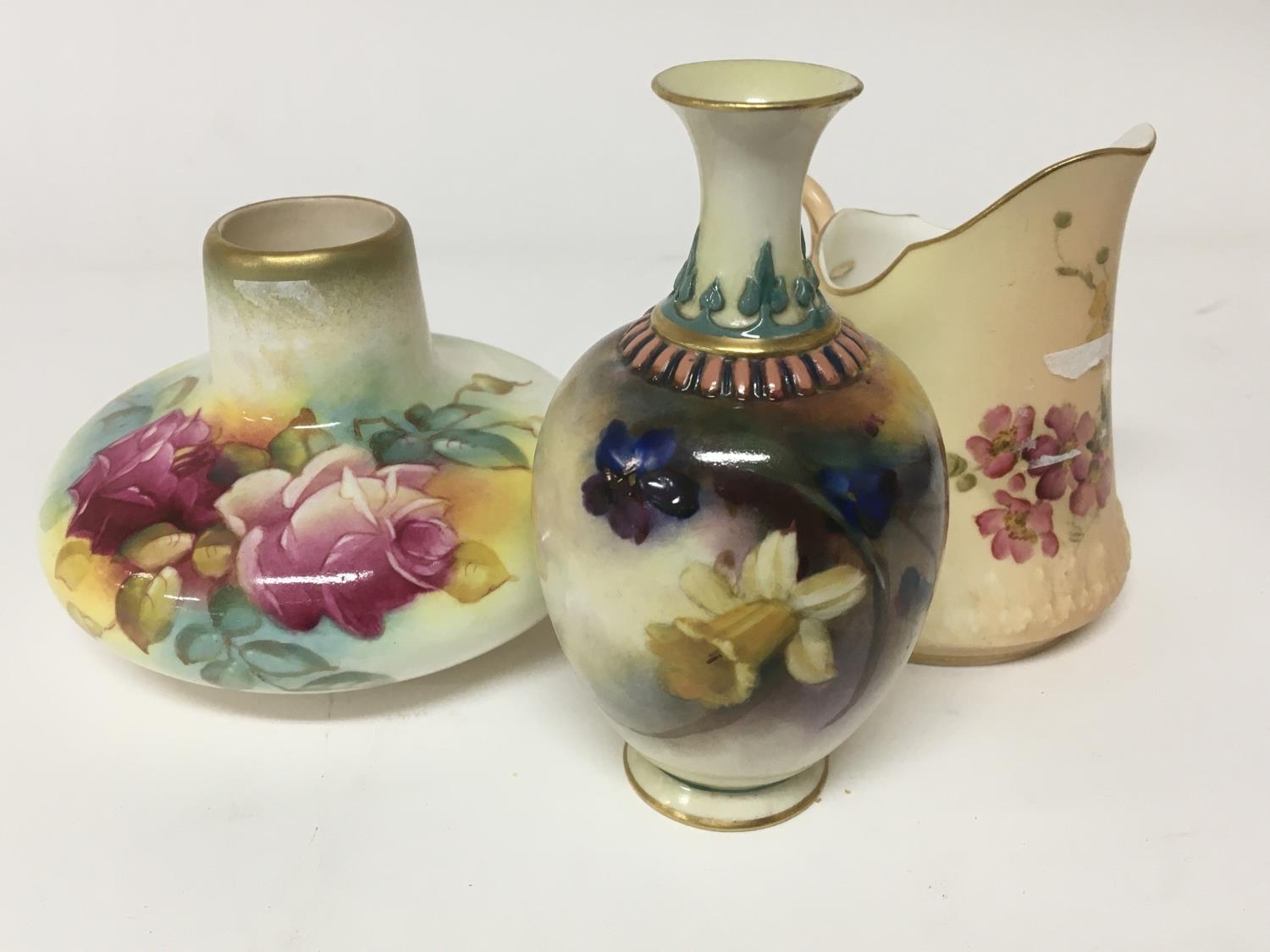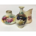 A hand painted Hadley Ware Royal Worcester vase.Hight 11cm decorated with flowers one other Worcester vase and a jug. The jug with a damaged handle (3)