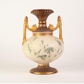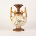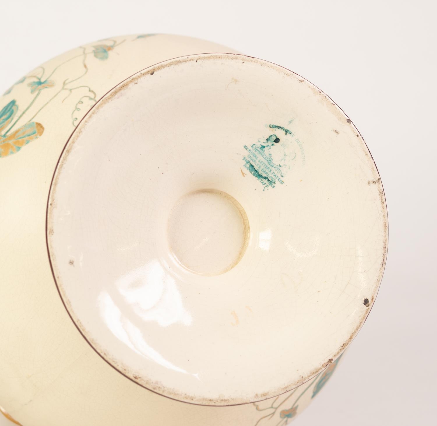 A LATE VICTORIAN CHARLES BARLOW POTTERY TWO HANDLED PEDESTAL VASE, the swollen body printed with a flowering plant with leafy tendrils on an ivory ground, printed mark, 11 1/2" (29cm) high