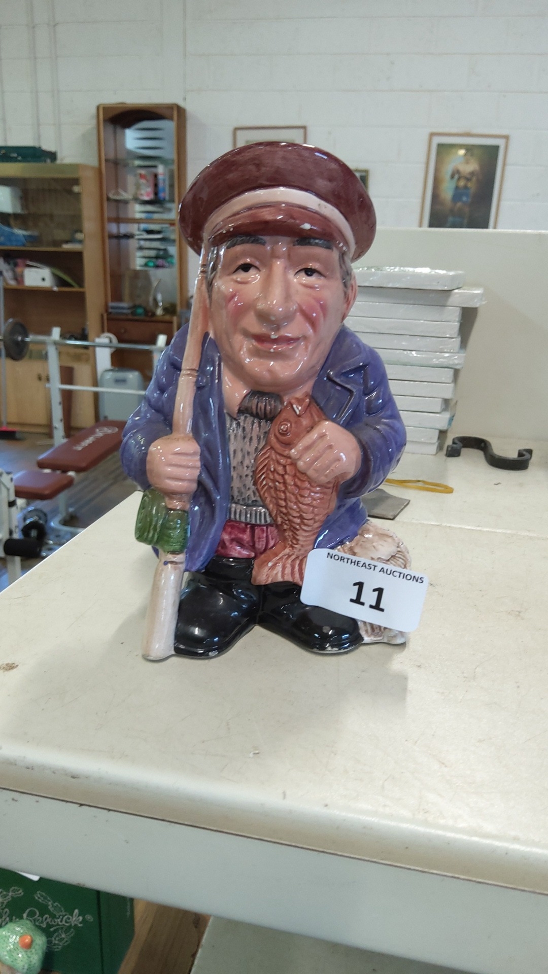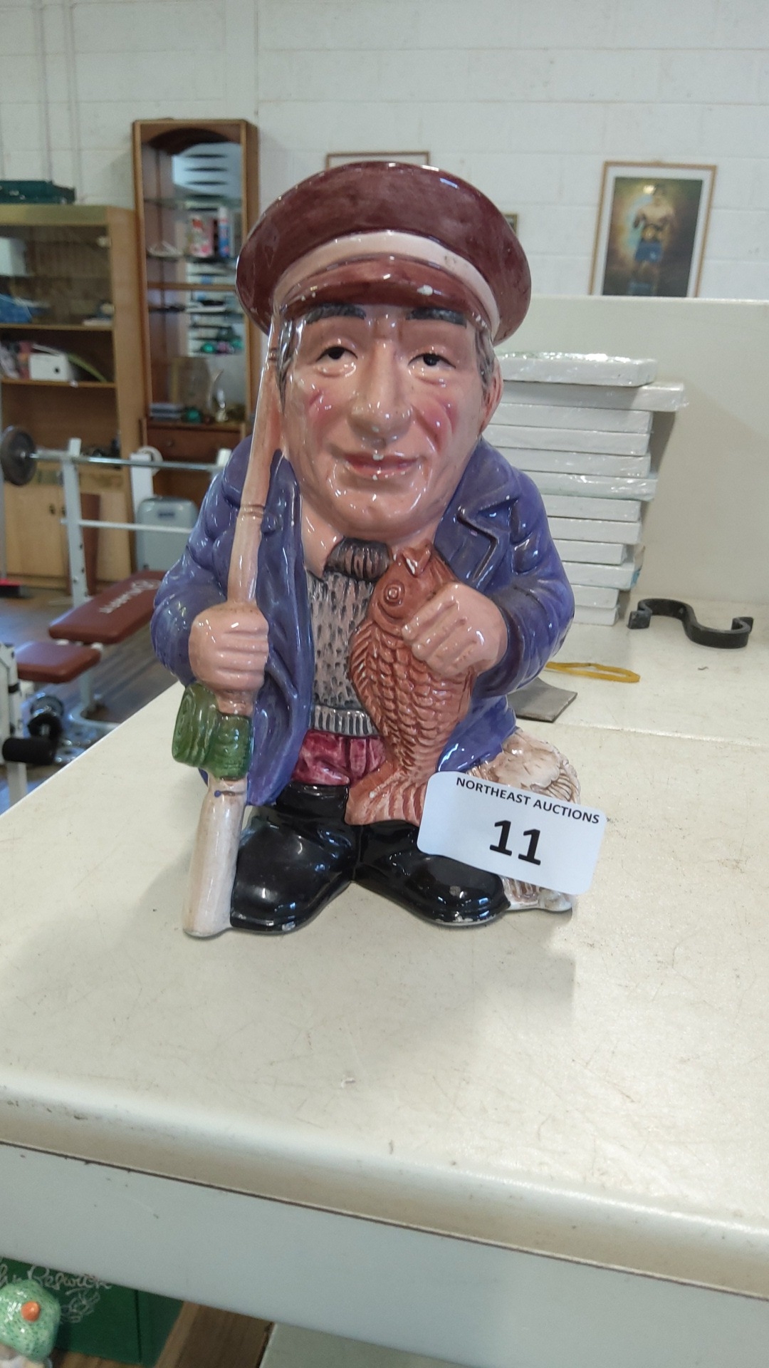 A character ceramic figure of an elderly fisherman, modelled standing with fishing rod, net and fish, in polychrome glaze.