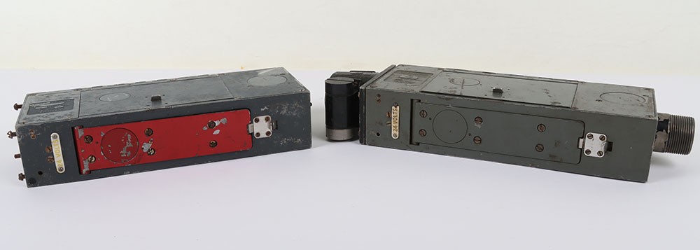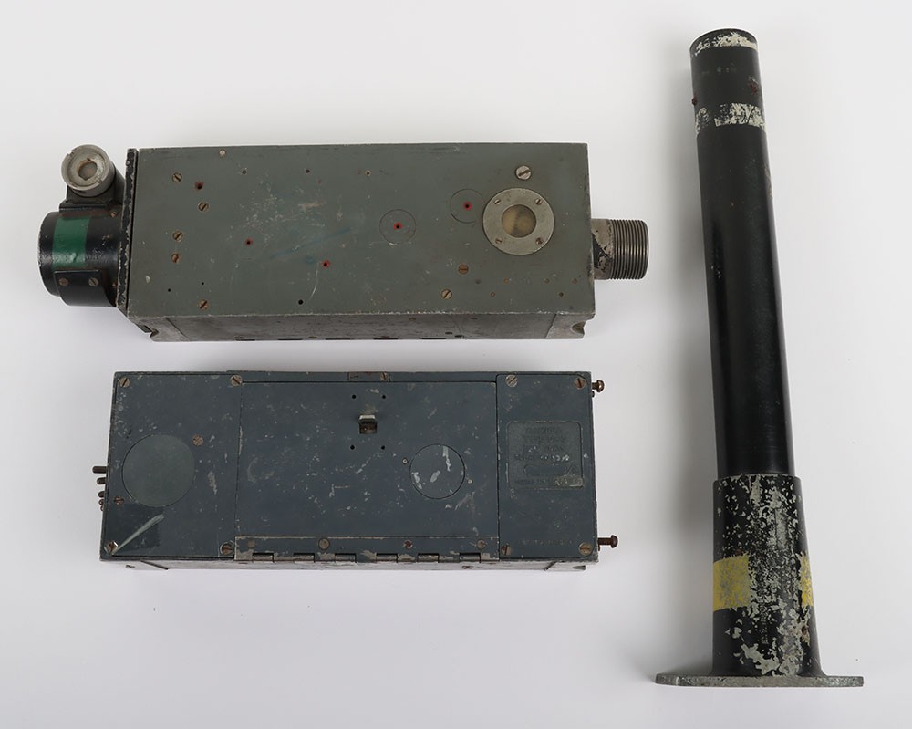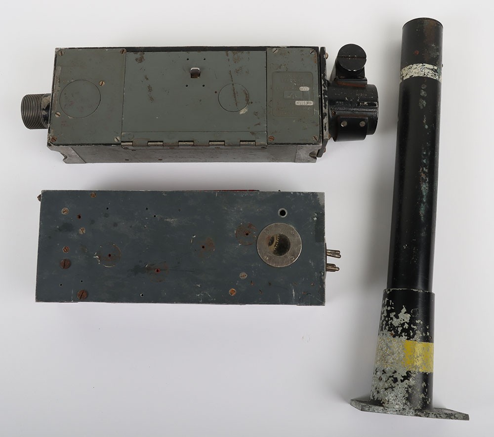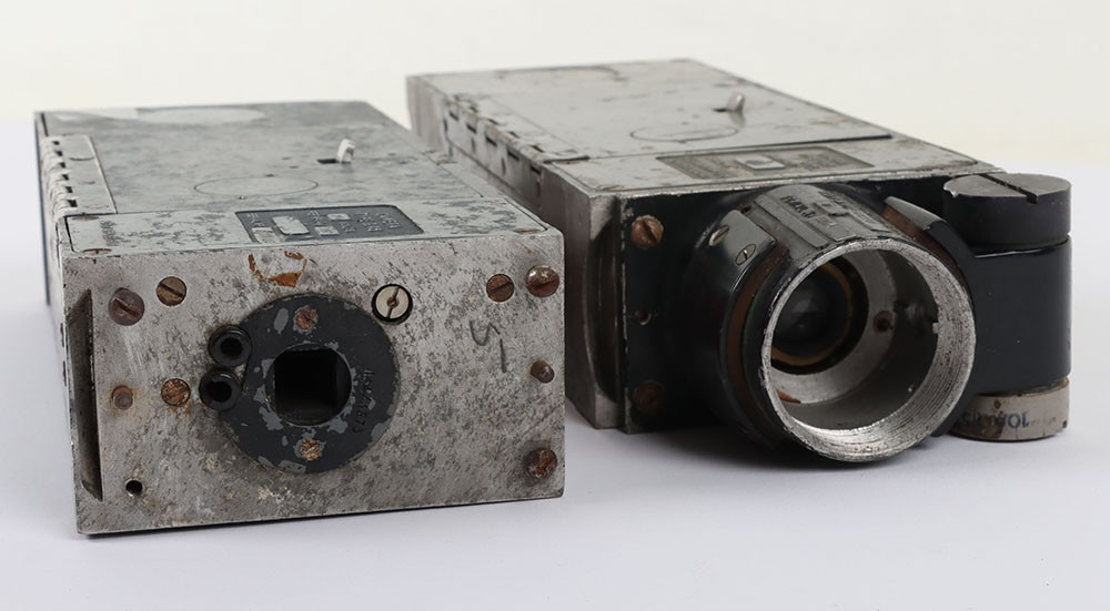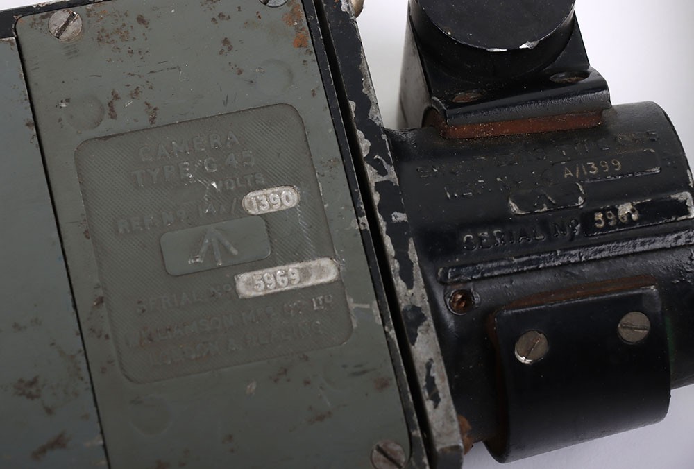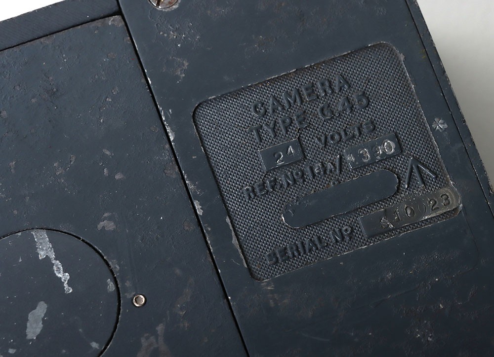 RAF Type G-45 Aircraft Camera Gun, with much of the original finish remaining to the body. Short lens fitting; Type G-45 camera gun with original blue paint finish, loose long lens fitting, G-45 film magazine in the inner compartment.