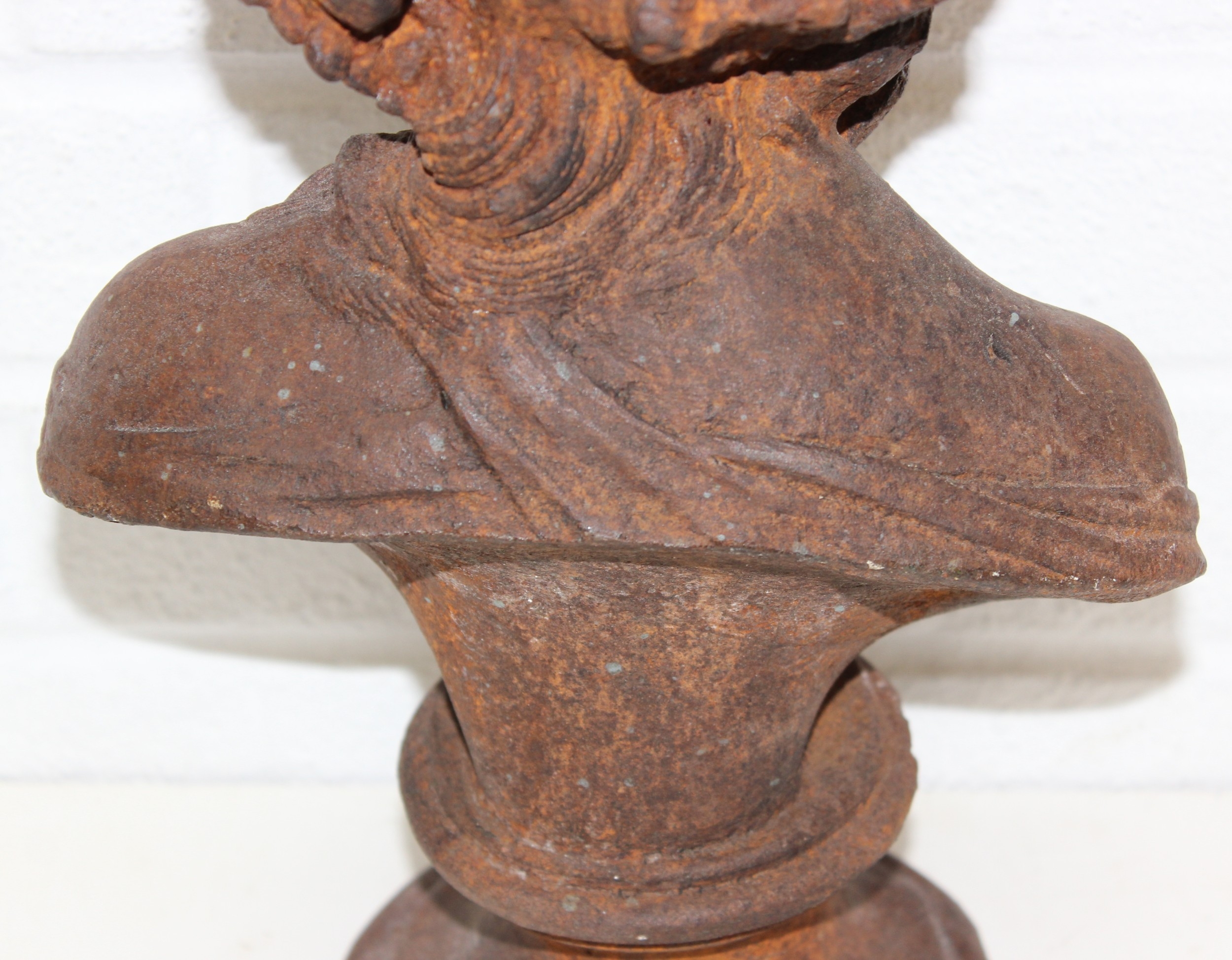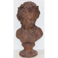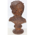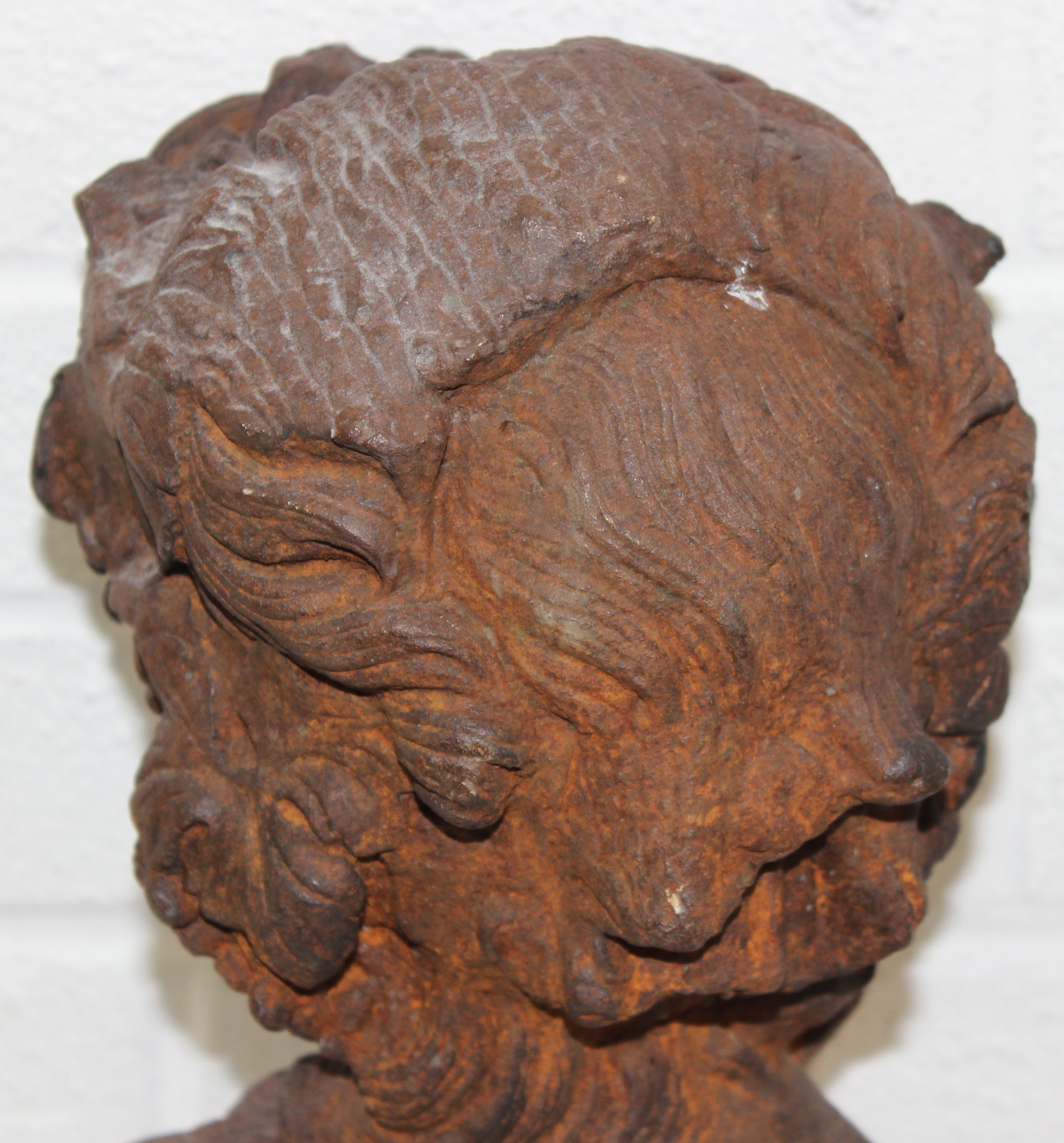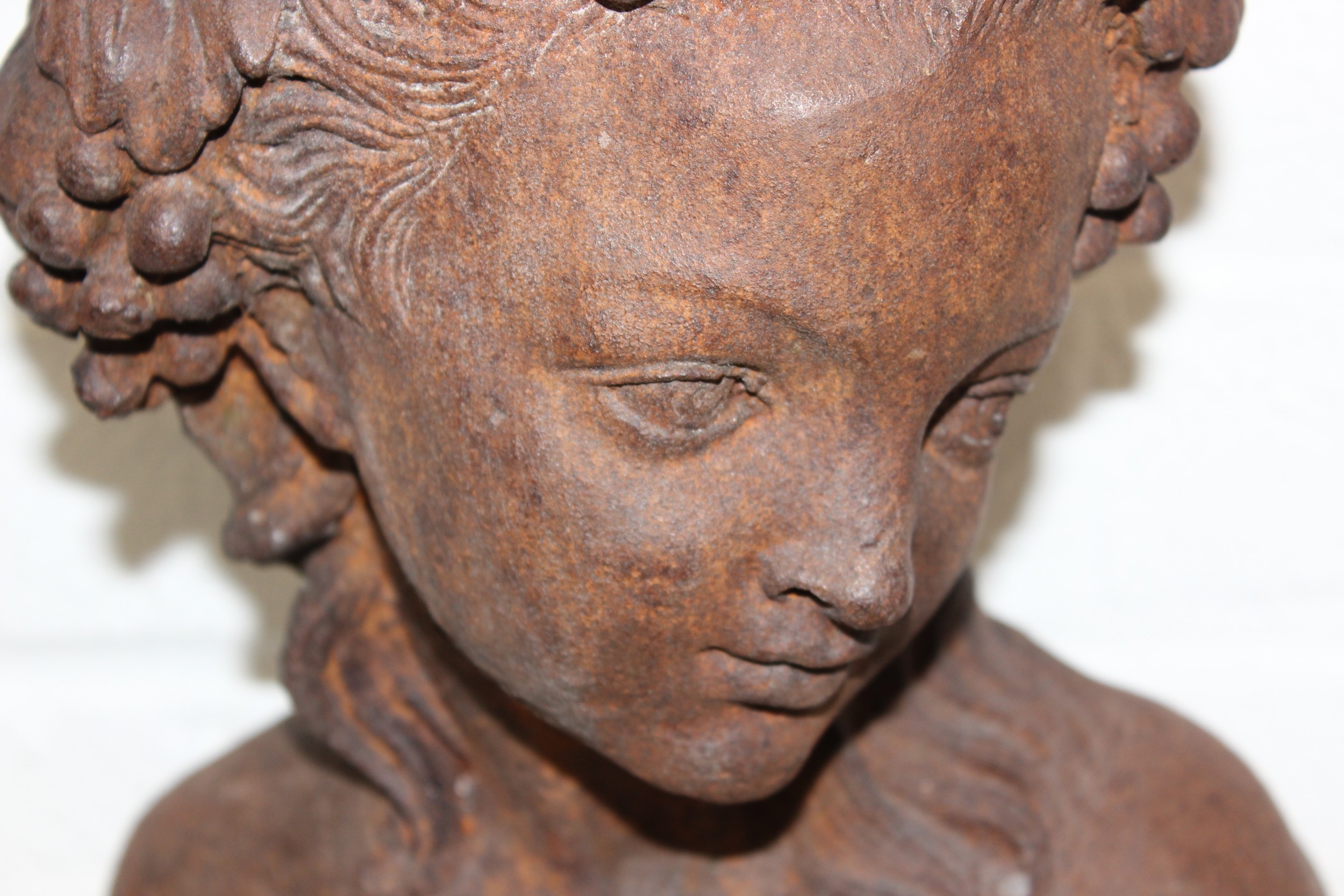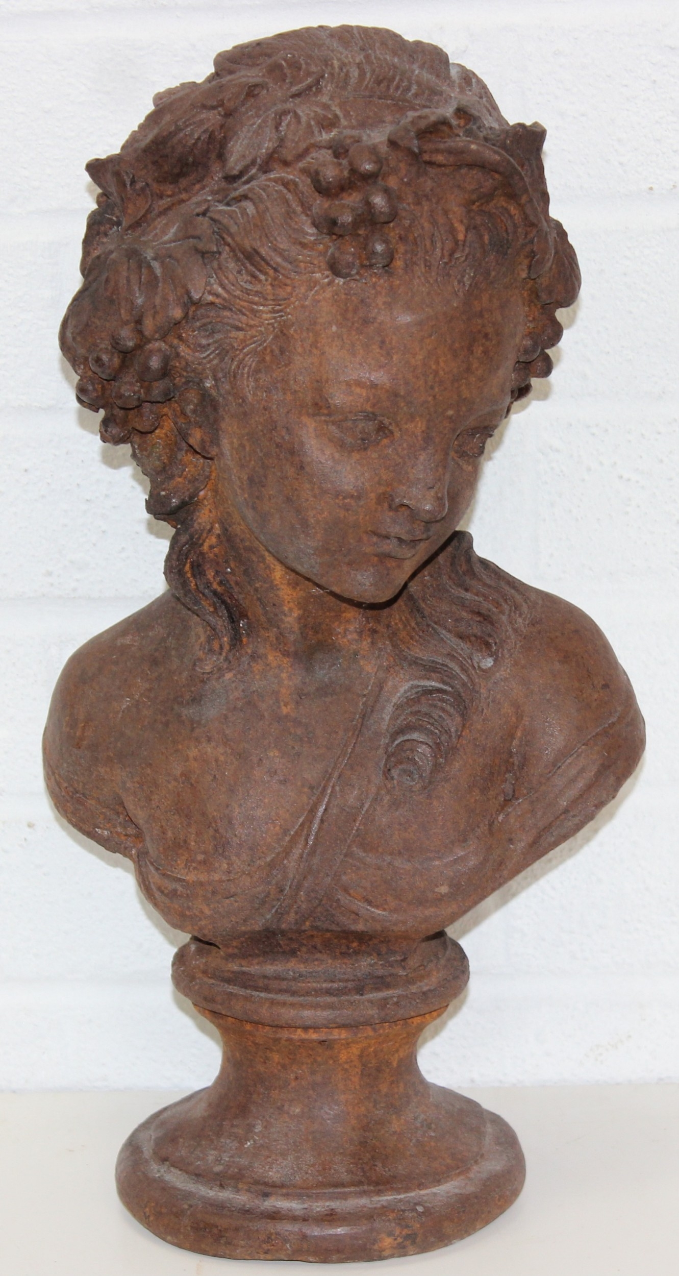 After Jean-Antoine Houdon (French, 1741–1828), a distressed cast iron bust sculpture depicting a young maenad or classical girl with grapes and vines in her hair, unsigned, 20th century, 45cm tall