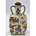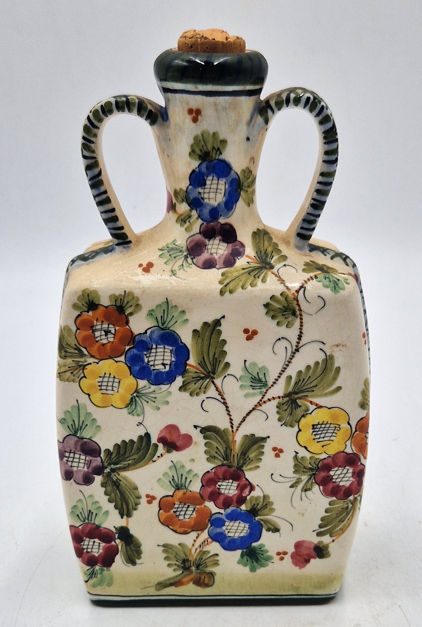 LUX MARMACA CERAMIC (Mid Century) (Hand Painted) TWIN HANDLED 19cm DECANTER FEATURING CREAM-COLOURED BODY With A COLOURFUL FLORAL DESIGN And CORK STOPPER.