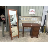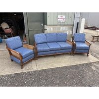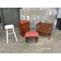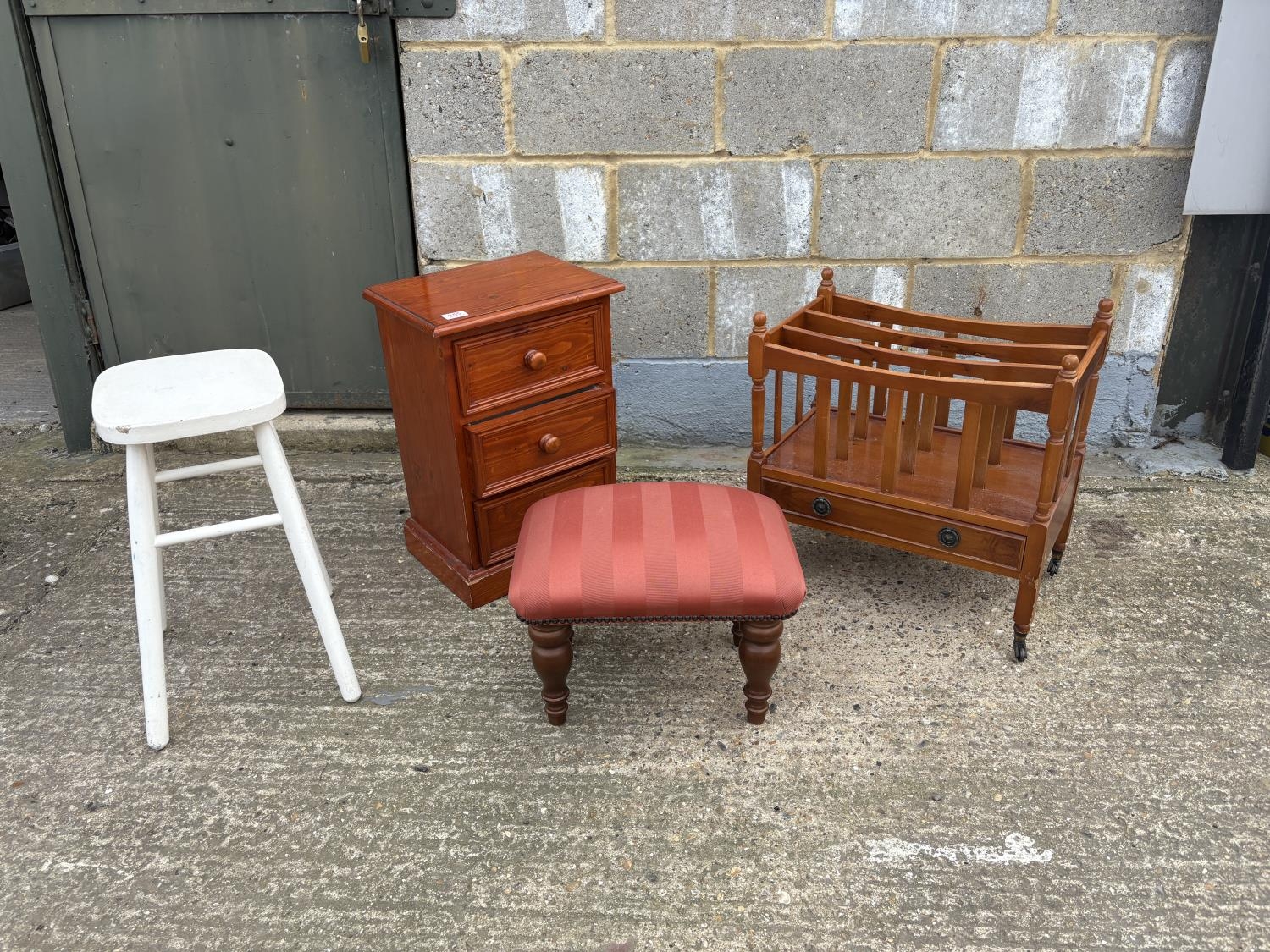 A yew Canterbury book rack, pine chest of three, upholstered stool and painted stool