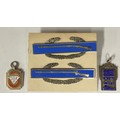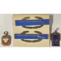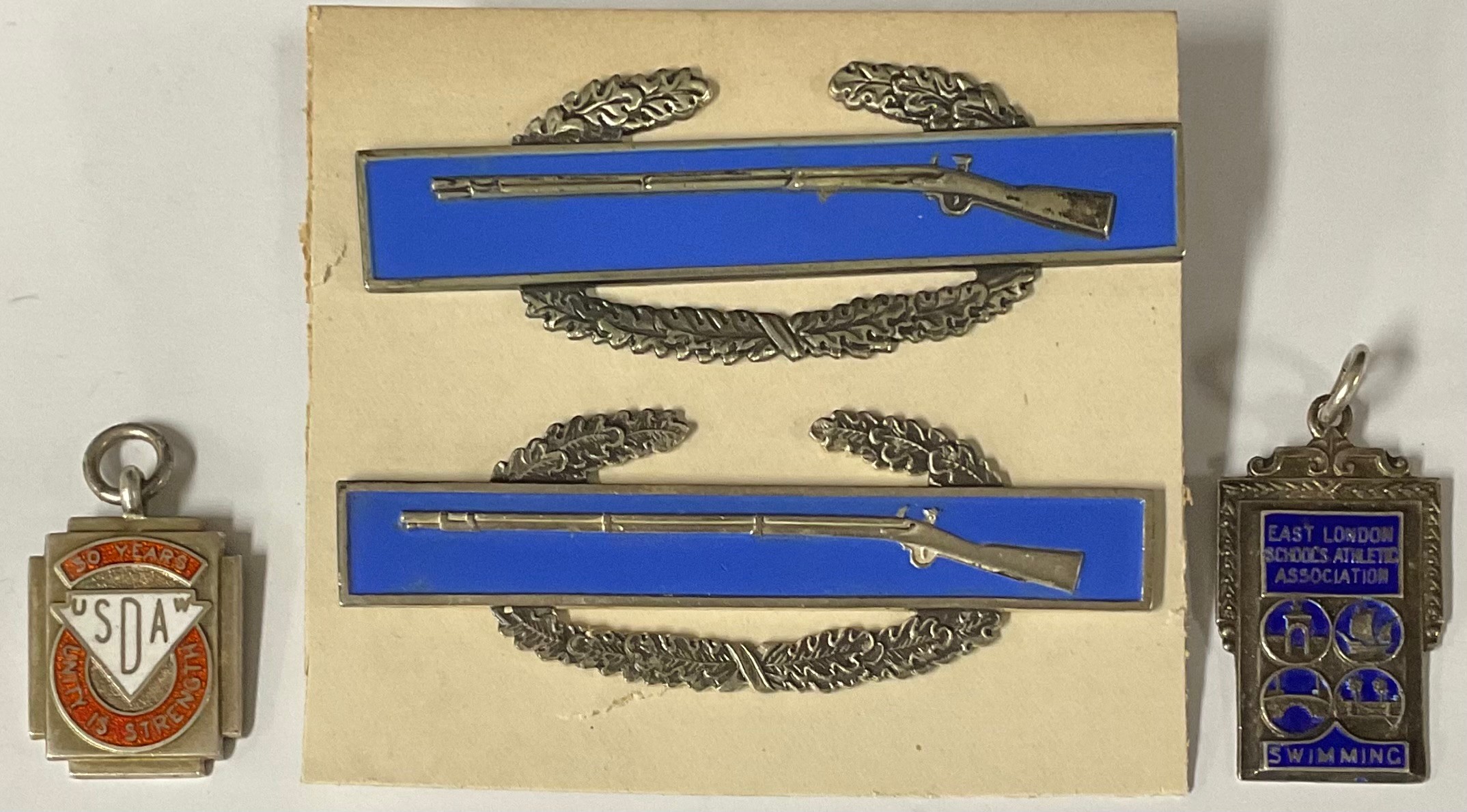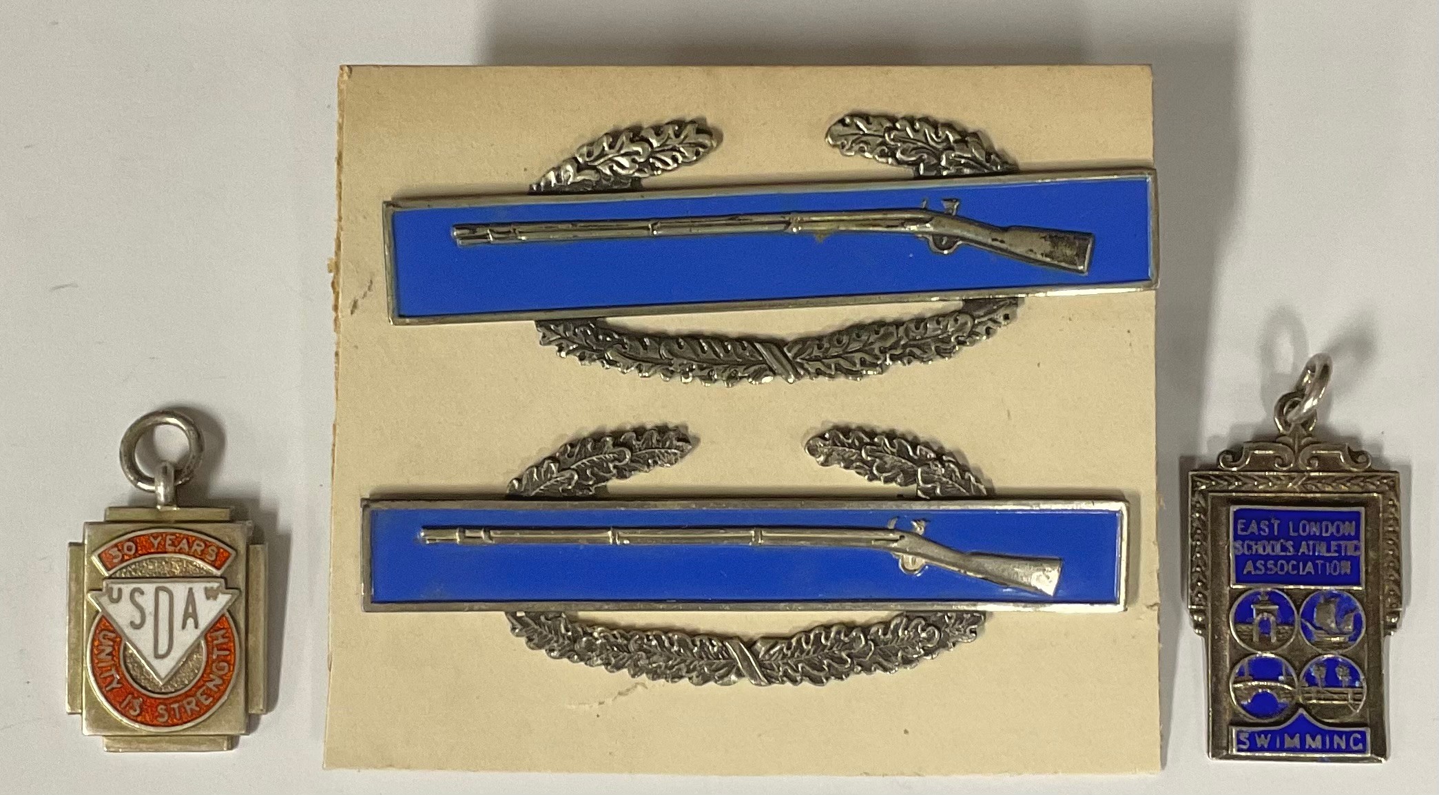 Two Sterling silver and enamel rifle badges; two silver and enamel fobs
