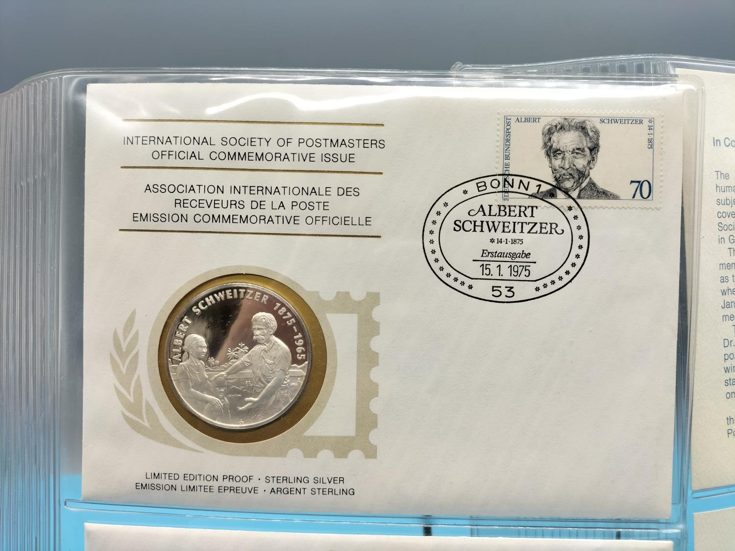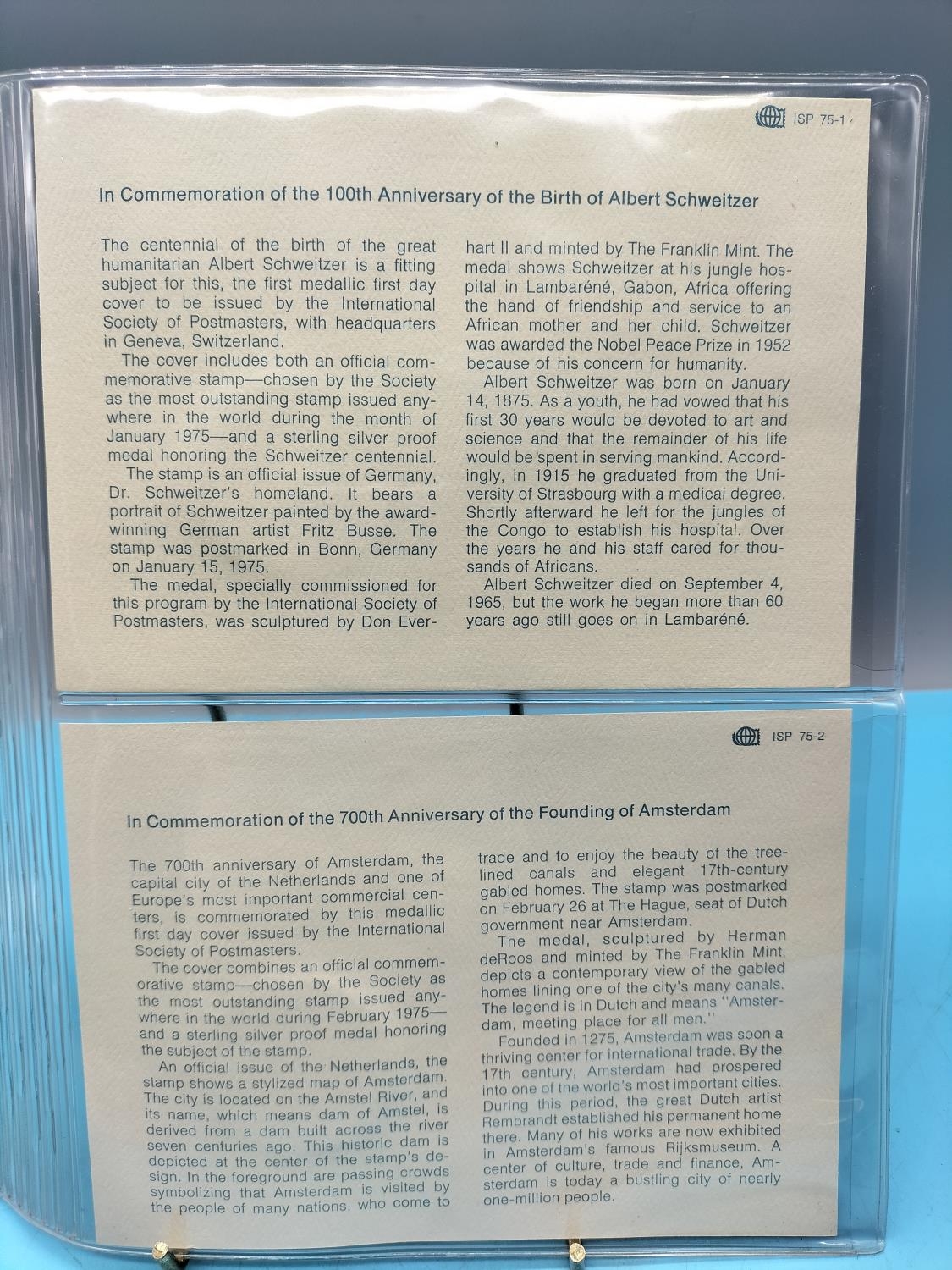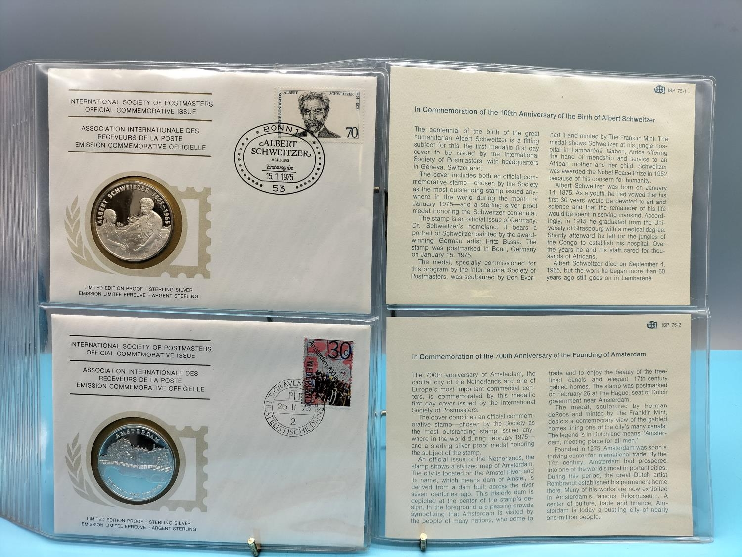 1975 International Society of Postmasters Official Commemorative Issue First Day Covers with Sterling Silver Coins (2) for ' 100th Anniversary of the Birth of Albert Schweitzer' and '700th Anniversary of the Founding of Amsterdam'.
