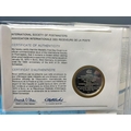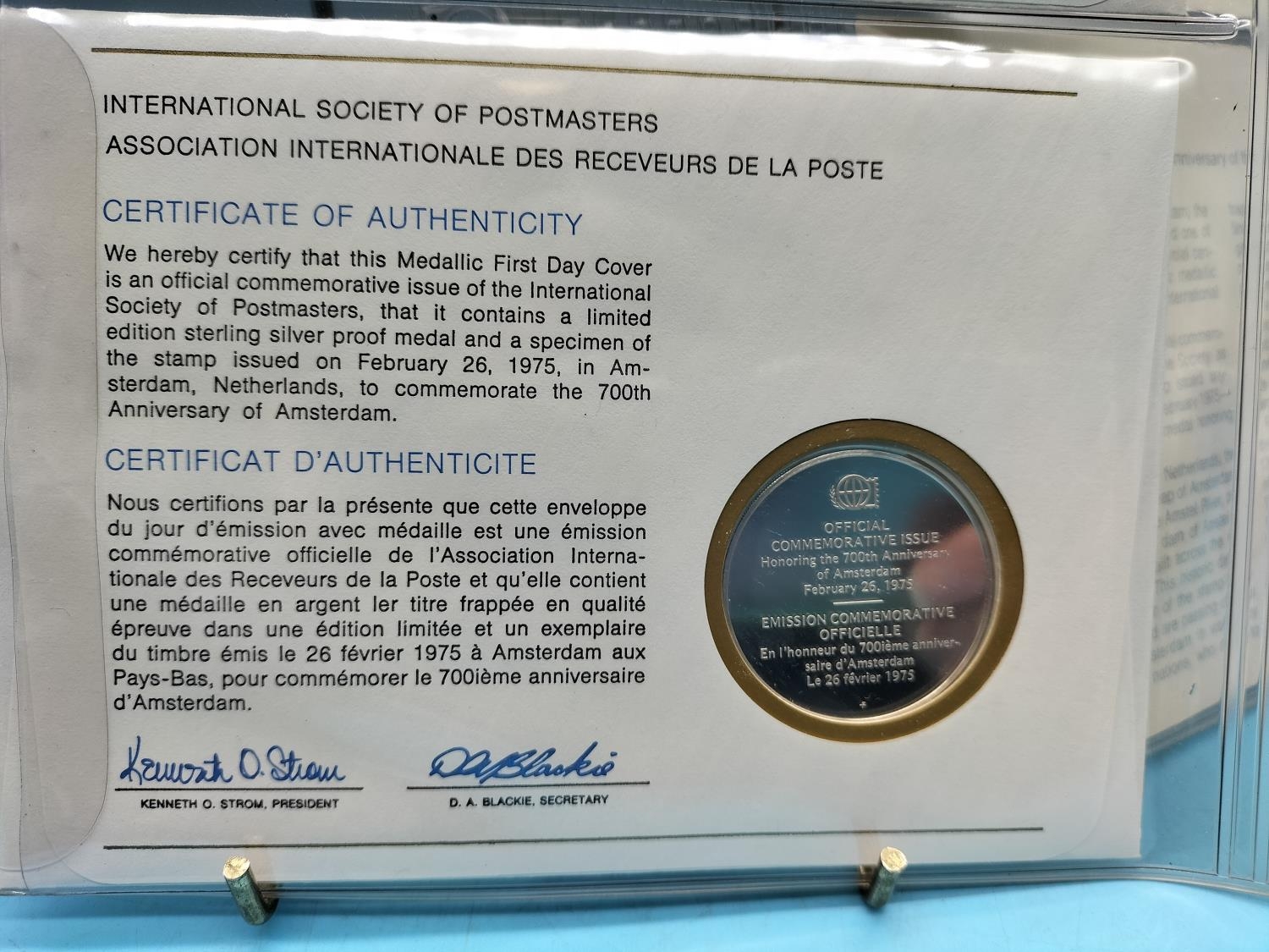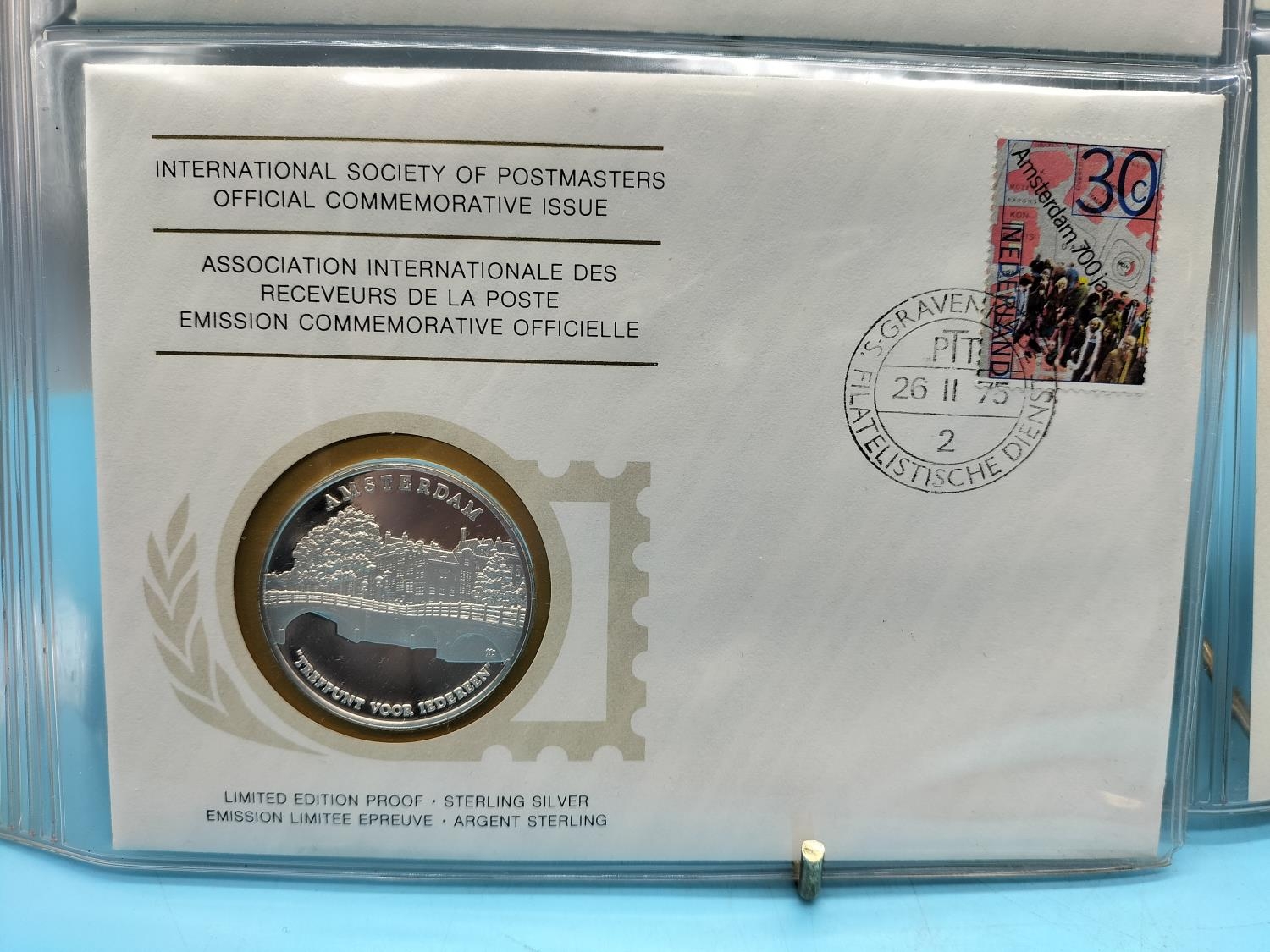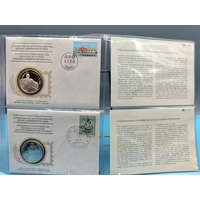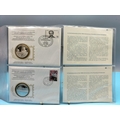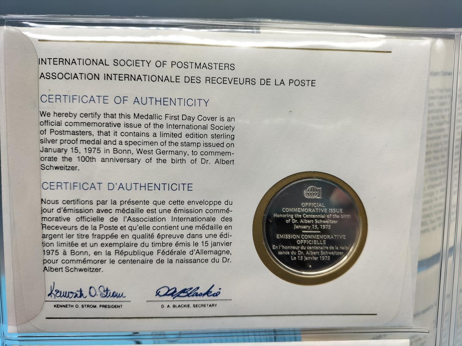 1975 International Society of Postmasters Official Commemorative Issue First Day Covers with Sterling Silver Coins (2) for ' 100th Anniversary of the Birth of Albert Schweitzer' and '700th Anniversary of the Founding of Amsterdam'.