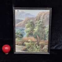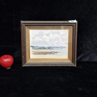 An original watercolour on paper painting. Features a serene rural countryside scene with figures. Rendered in shades of ochres, soft blues and greens. Portrays loose smooth brushstrokes . Signed 'J Hunt' to base. Housed in a green wooden frame behind glass.