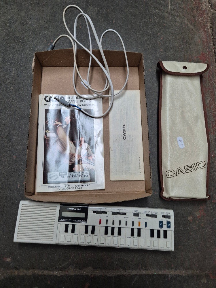 A vintage Casio VL-TONE VL-1 mini electronic musical keyboard from 1982, with case and manual.