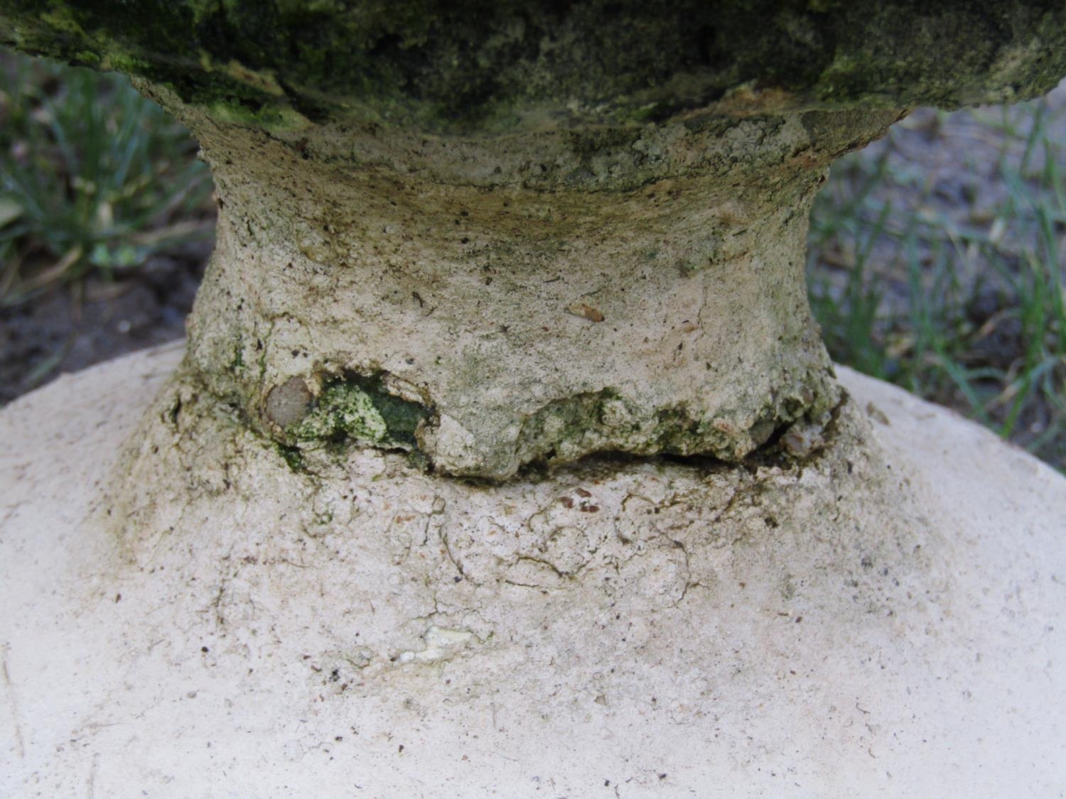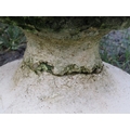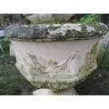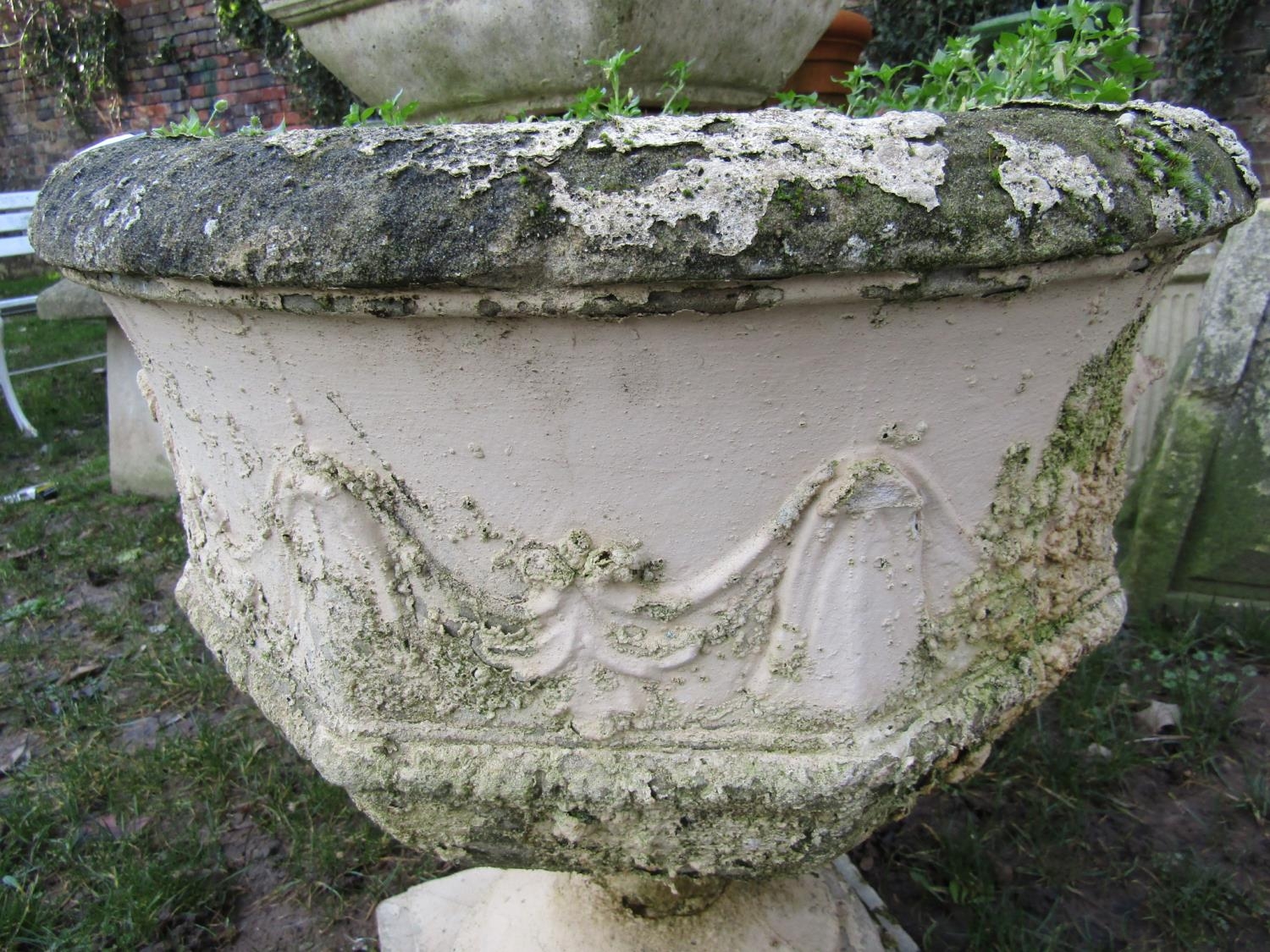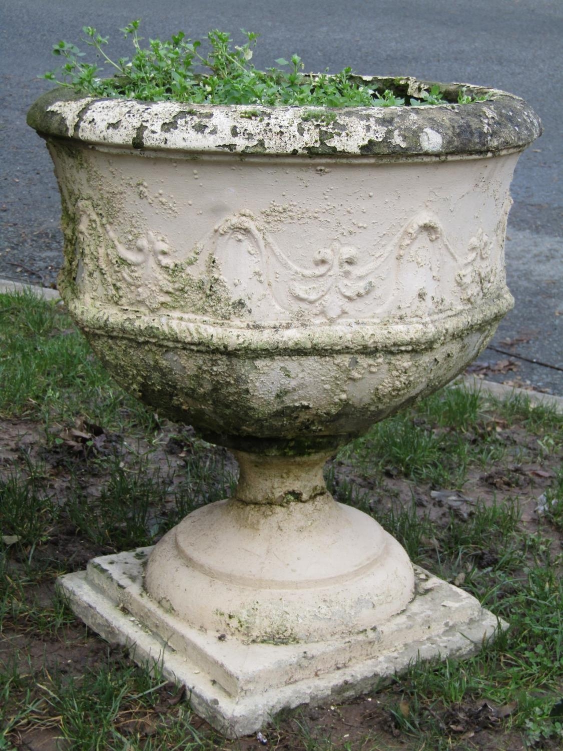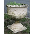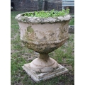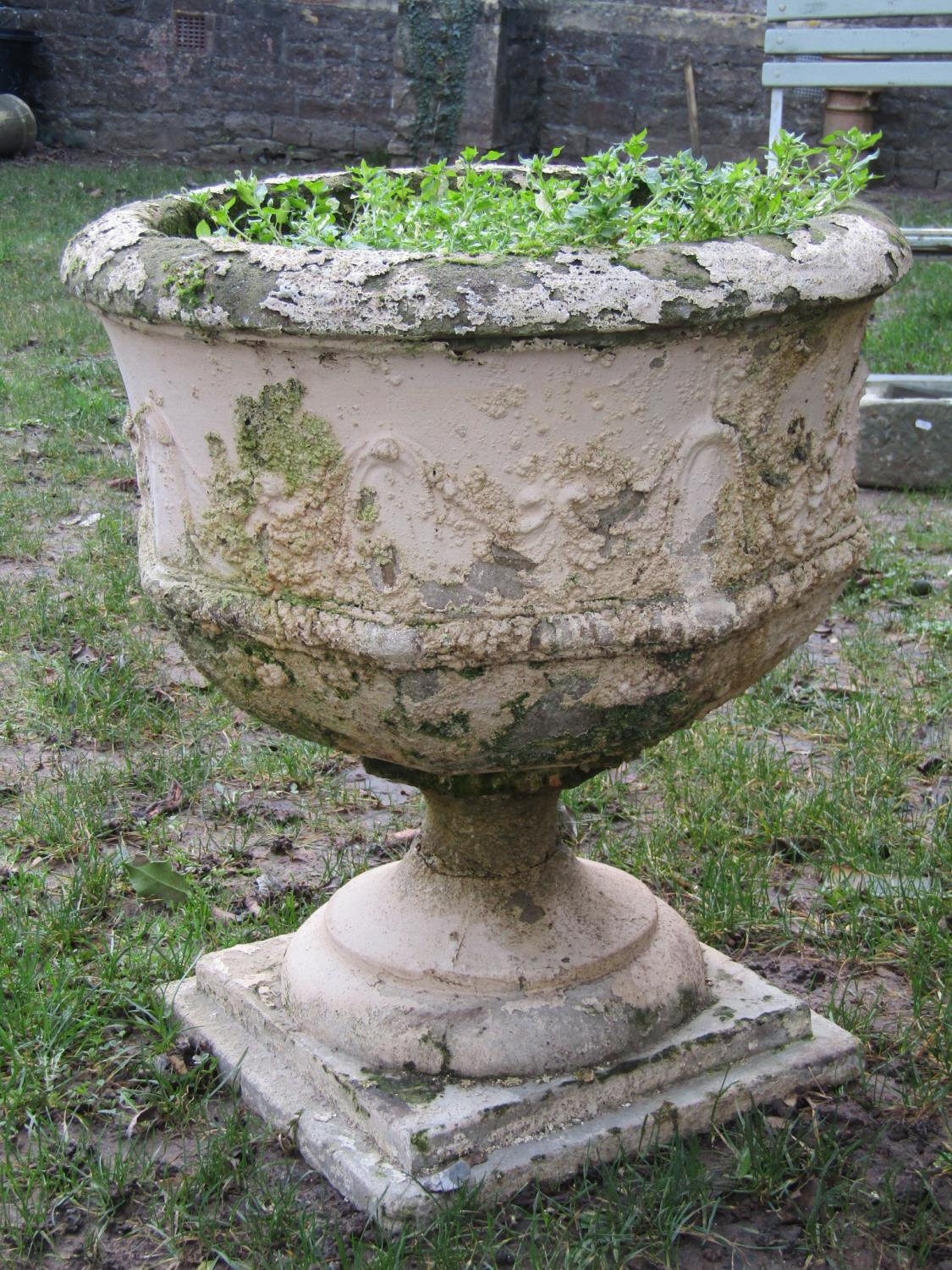 A painted and weathered cast composition stone garden urn of octagonal form with flared rim and relief detail raised on a square stepped base, approximately 50 cm in diameter x 58 cm high