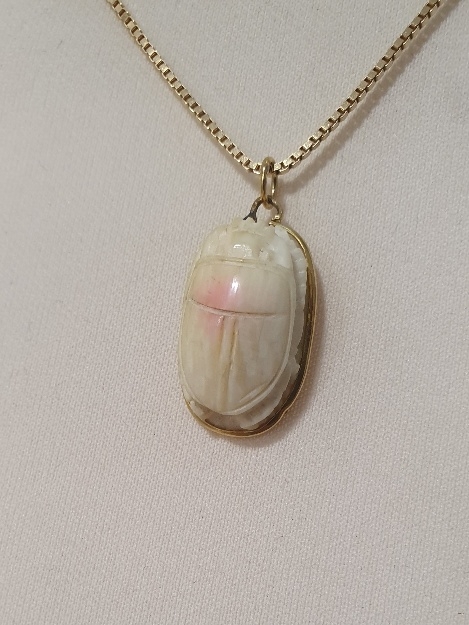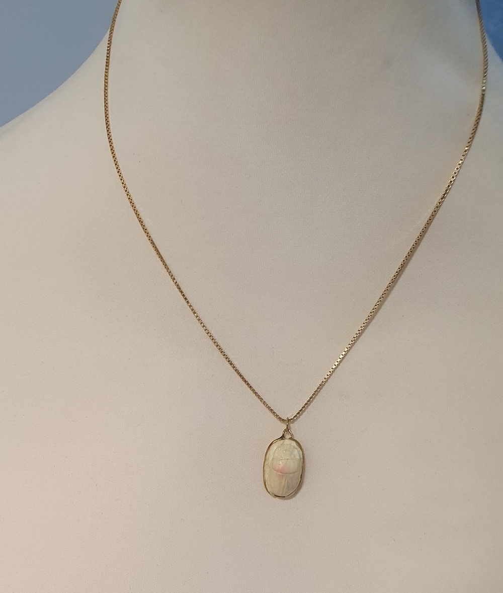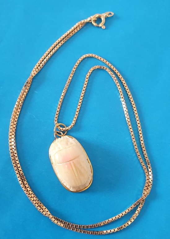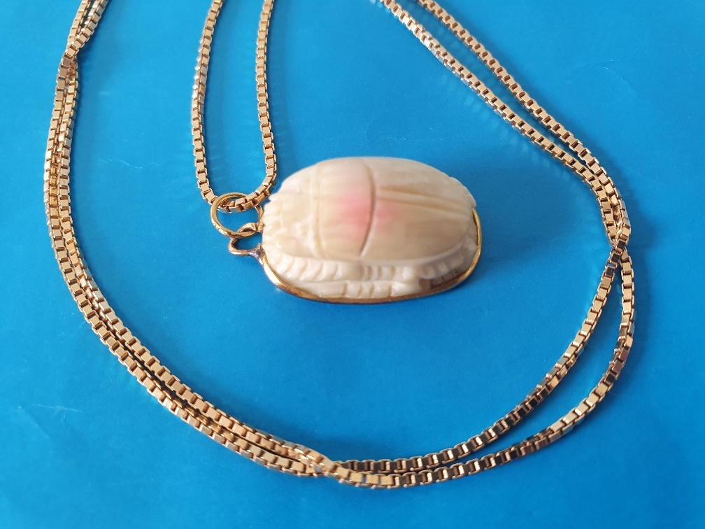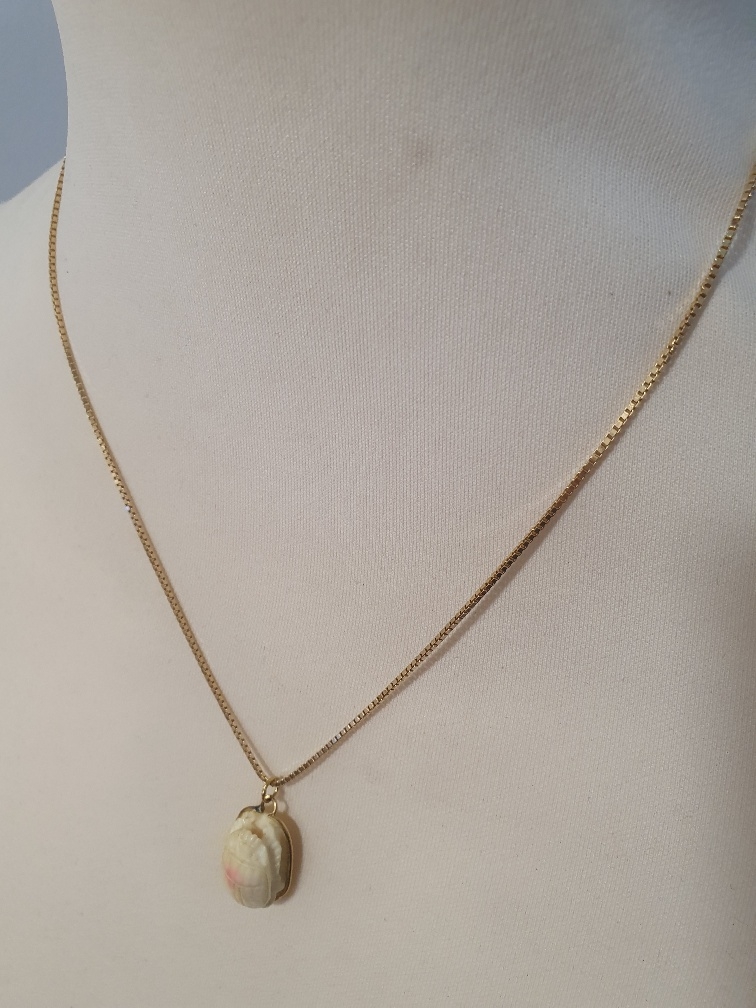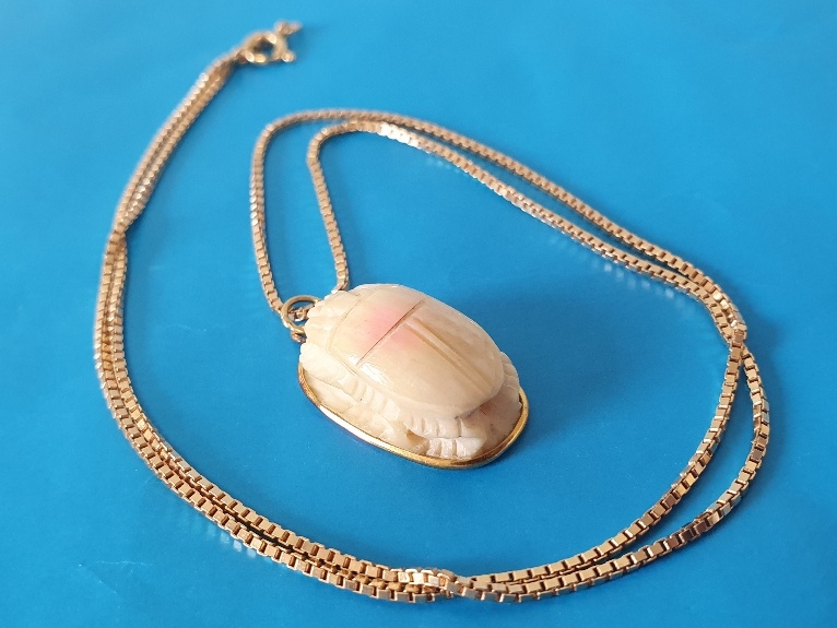 18ct Gold Necklace Chain with Gold Mounted Scarab Beetle. Necklace weight is 6g and length is 51cm. Pendant weight is 3g, total weight 9g.