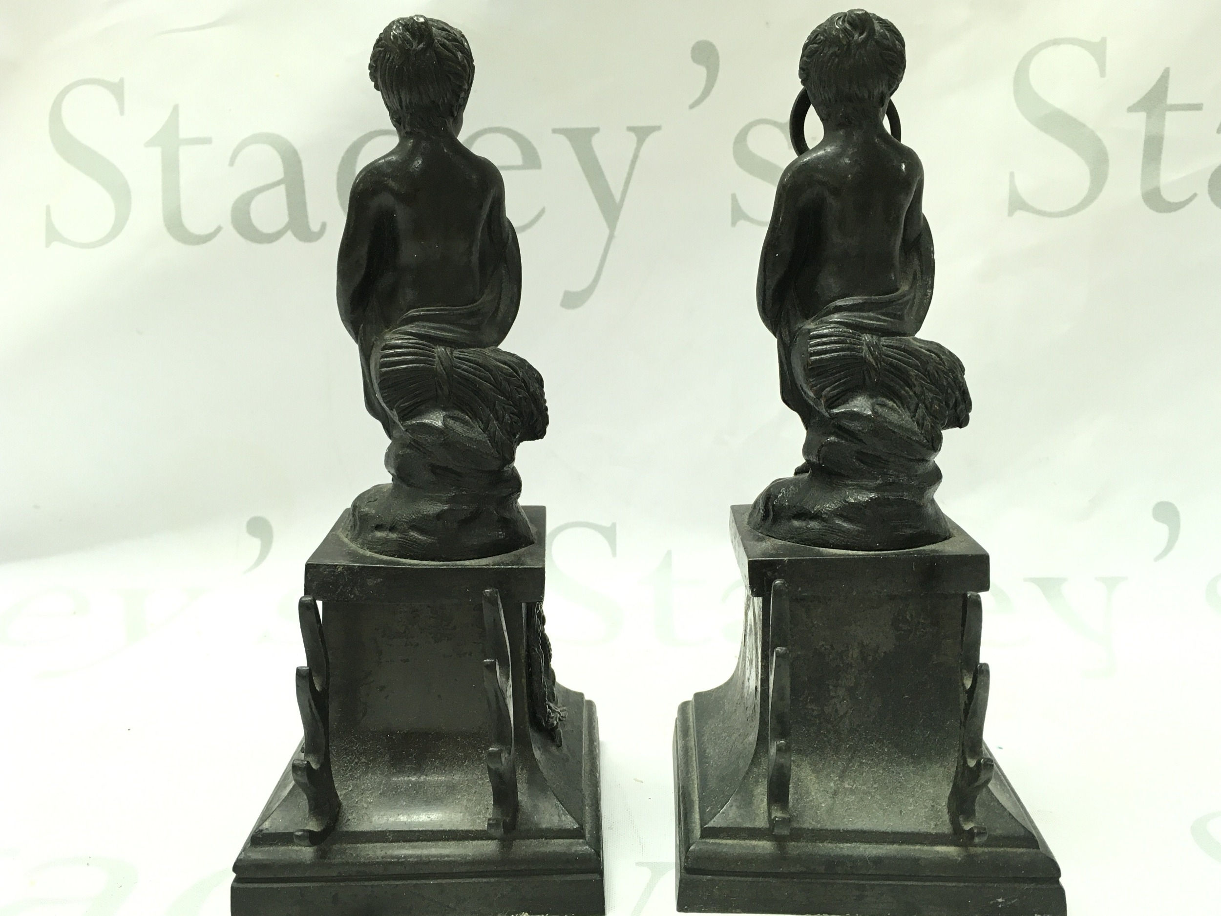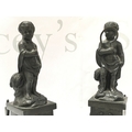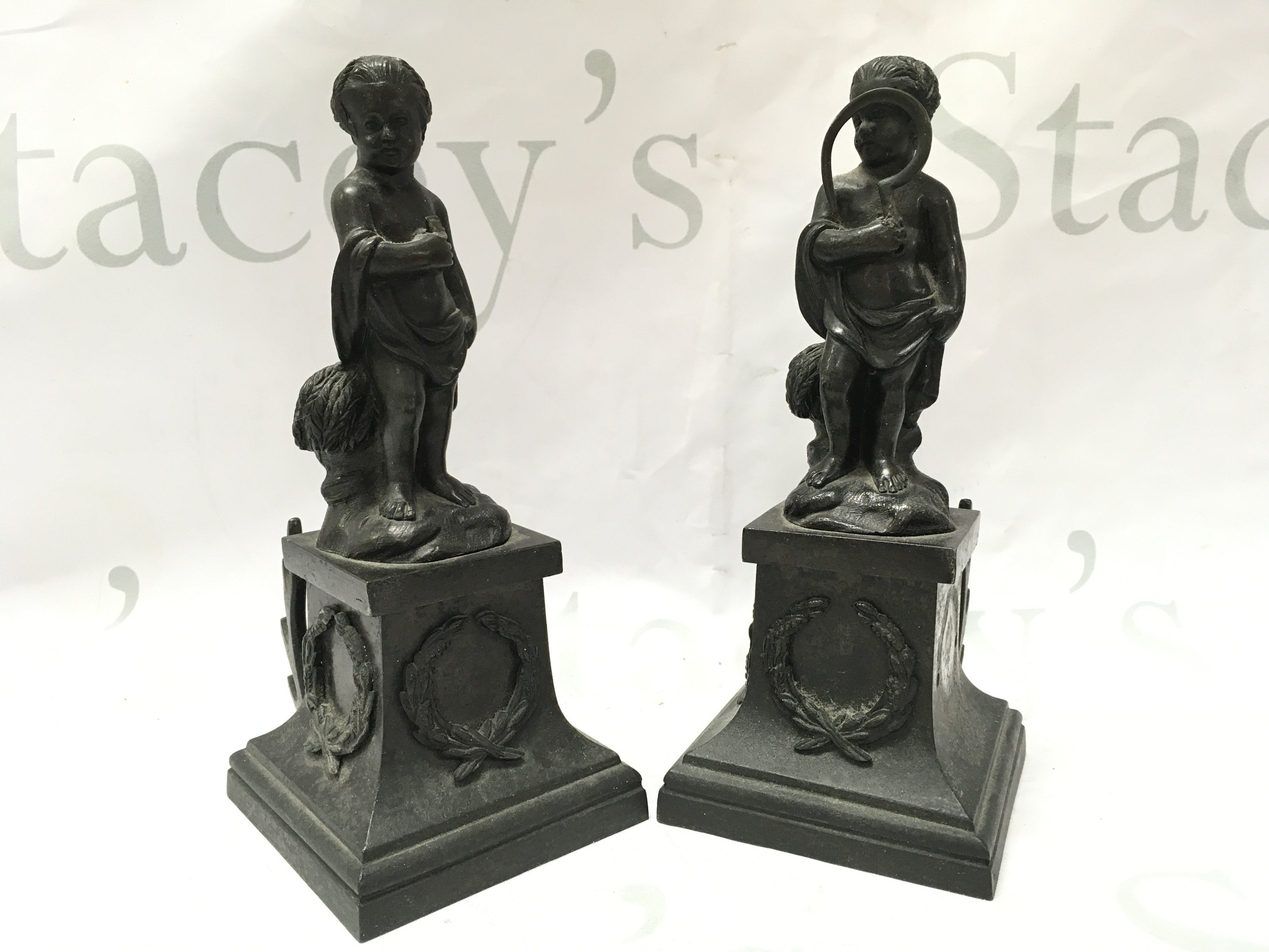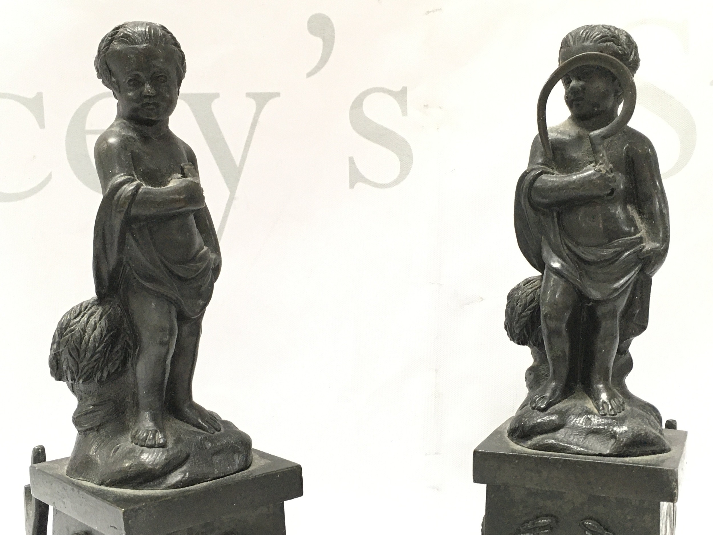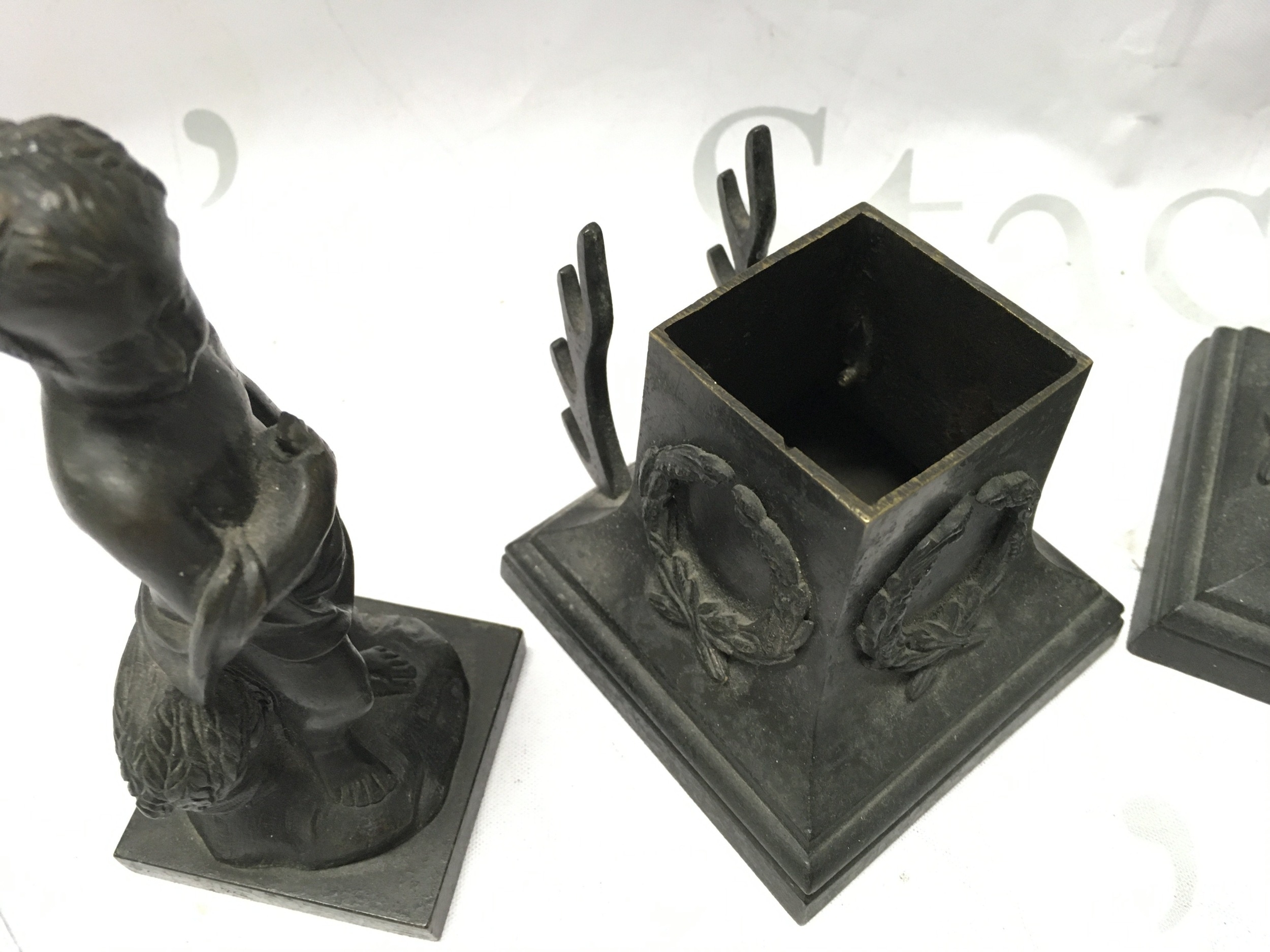 A pair of 19th century bronze cherub figures with detachable bases , the base decorated with garlands . 20cm tall. Postage catB