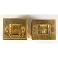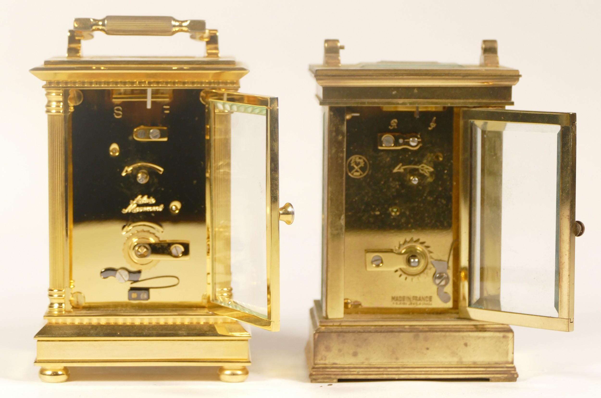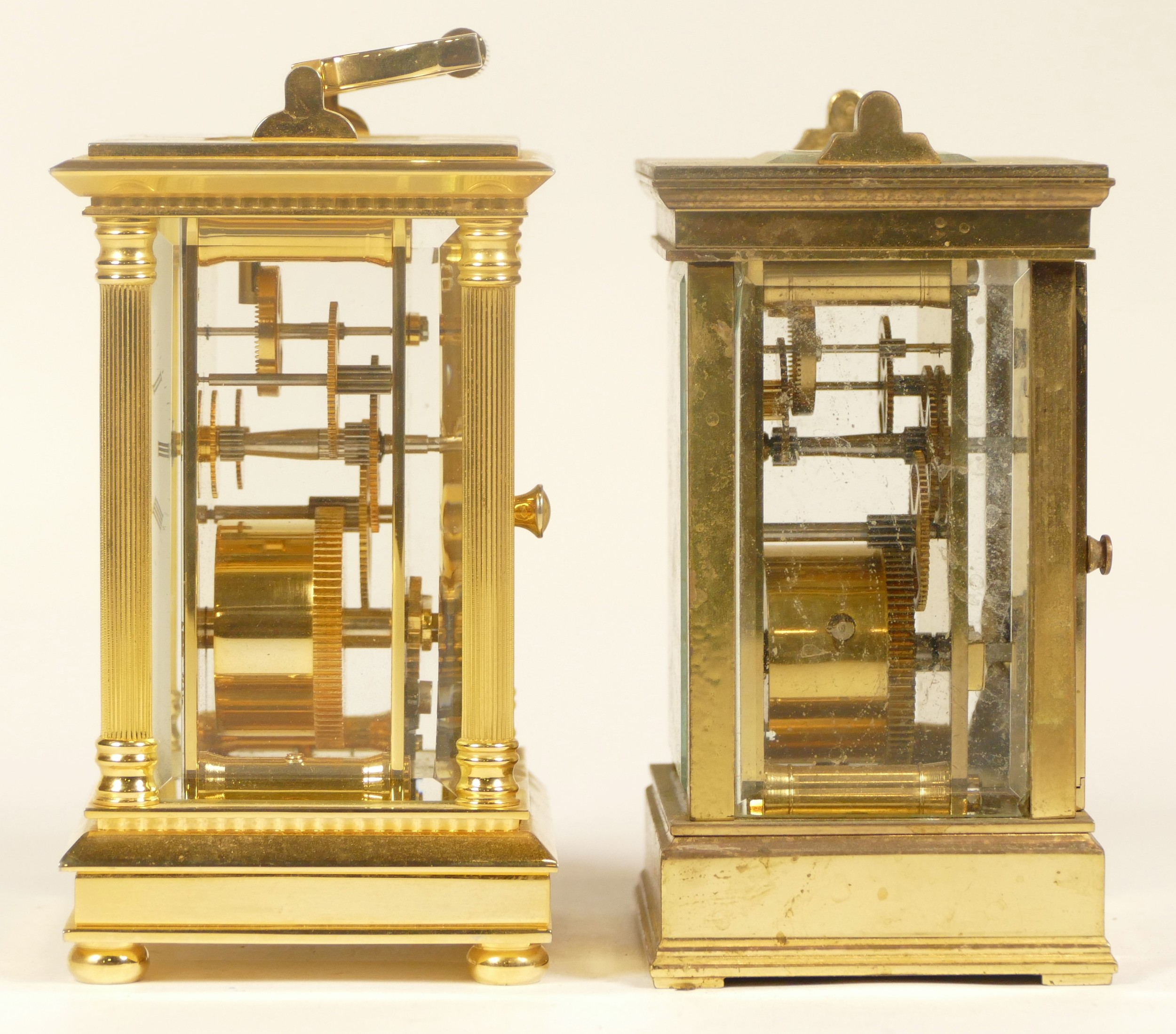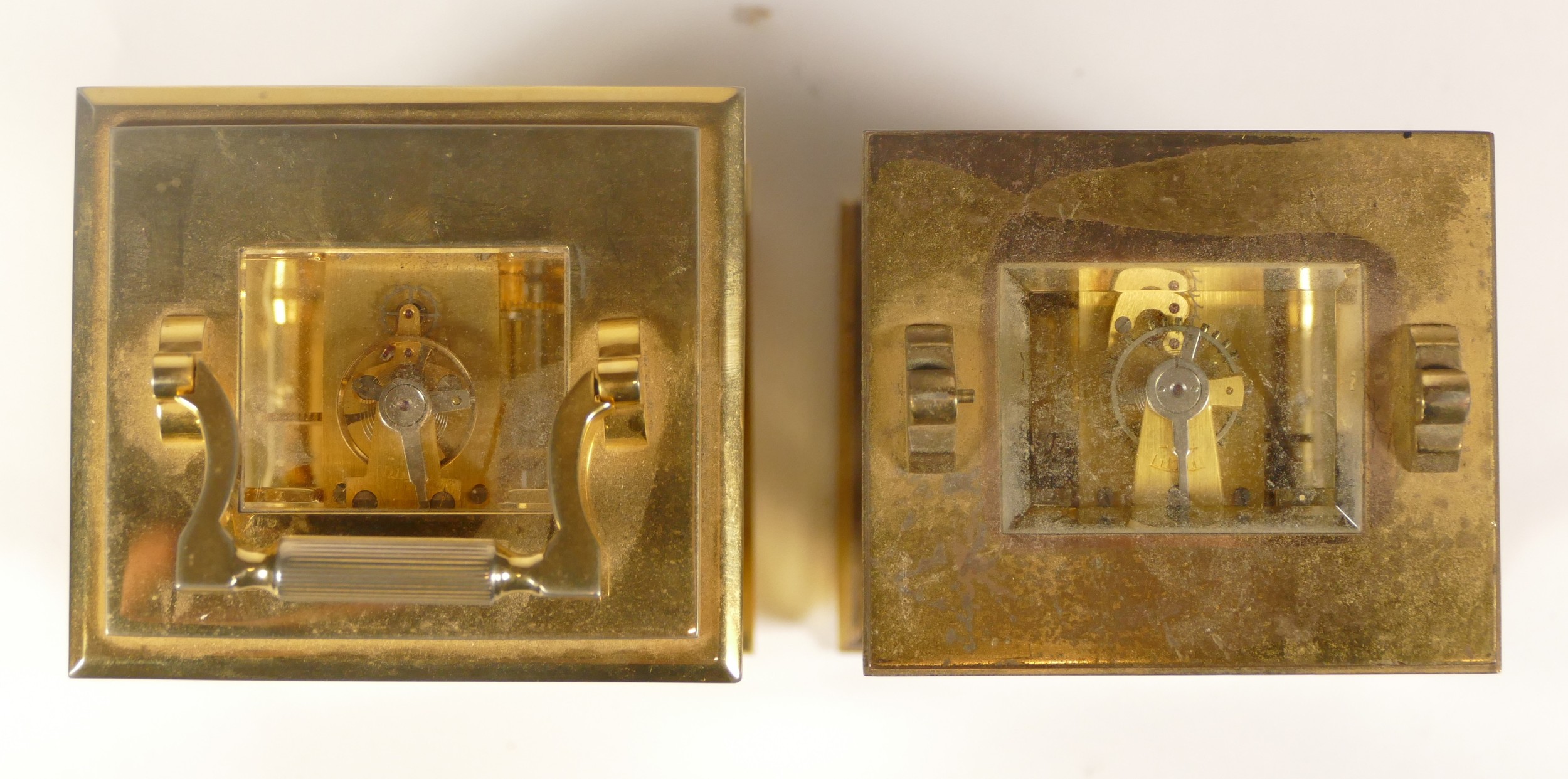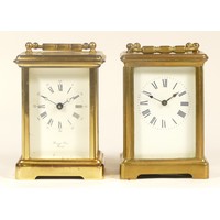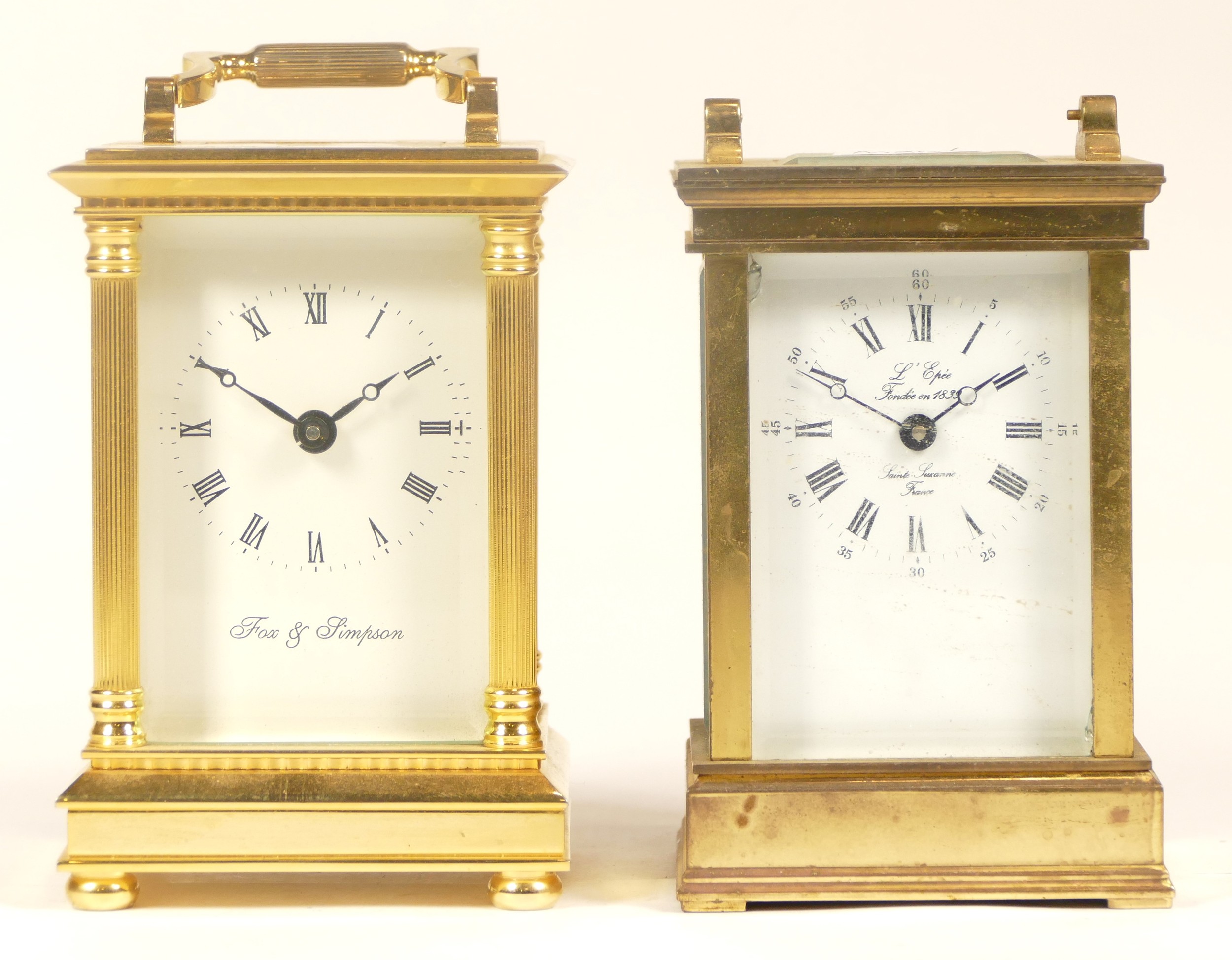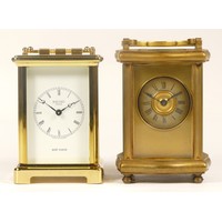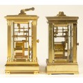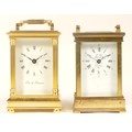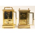 A 20th century Fox & Simpson brass cased carriage clock, 16cm high together with a 20th century French brass cased carriage clock, 12cm high (missing handle) (2)