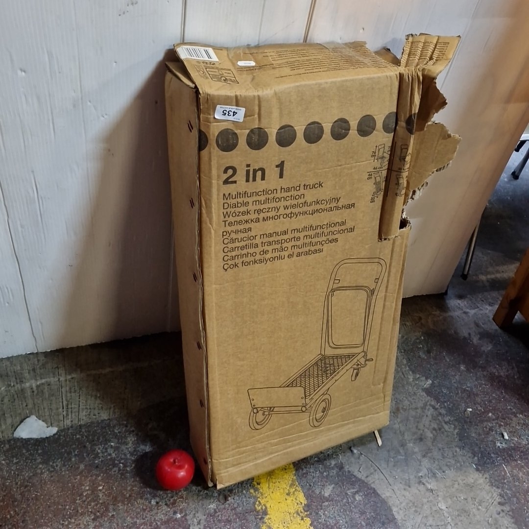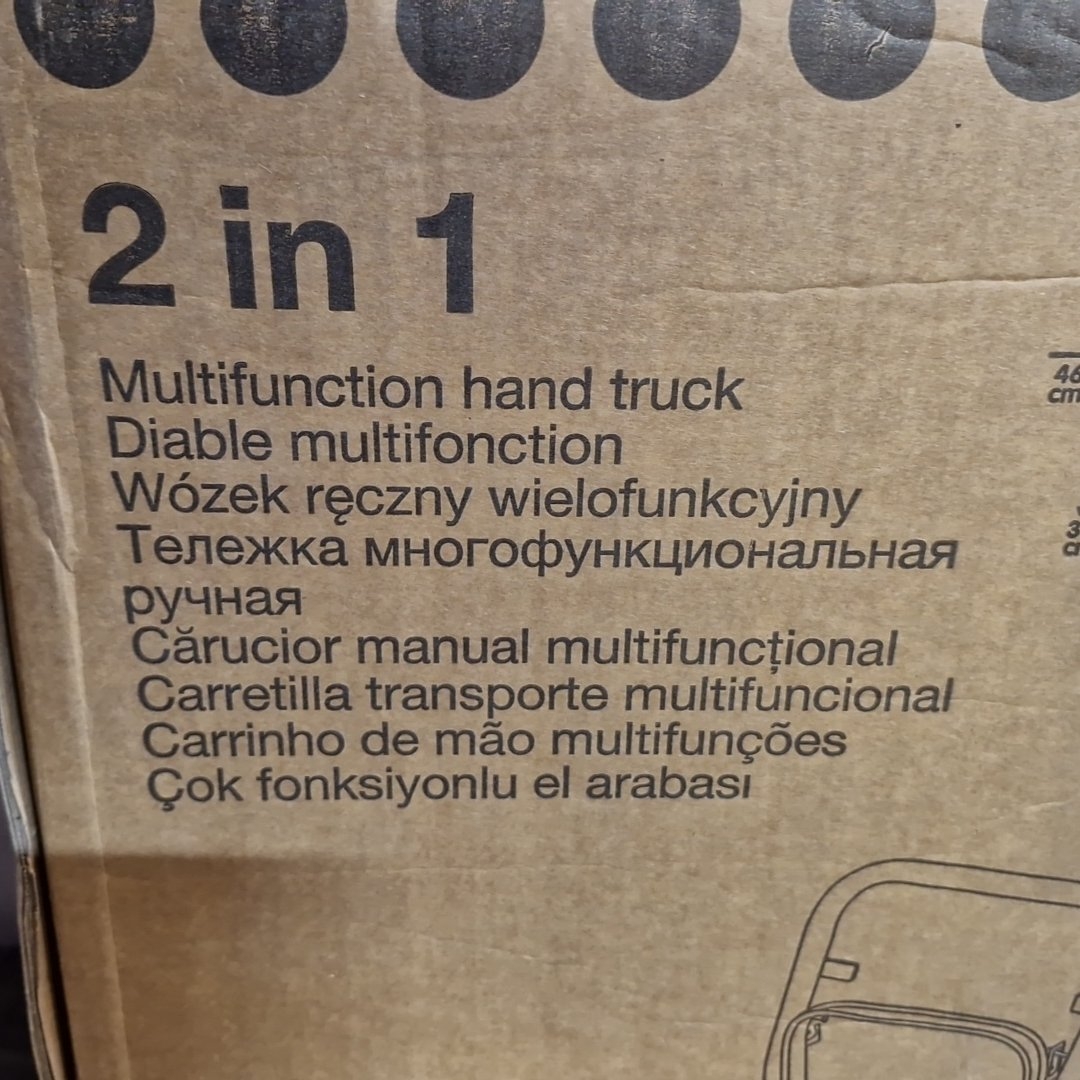Brand new One boxed “2 in 1” multifunction hand truck, convertible to platform trolley; carton shows approximate dimensions 76 × 72 × 46 cm (trolley) and 115 × 46 × 33 cm (upright), with stated loads 50 kg/80 kg max.