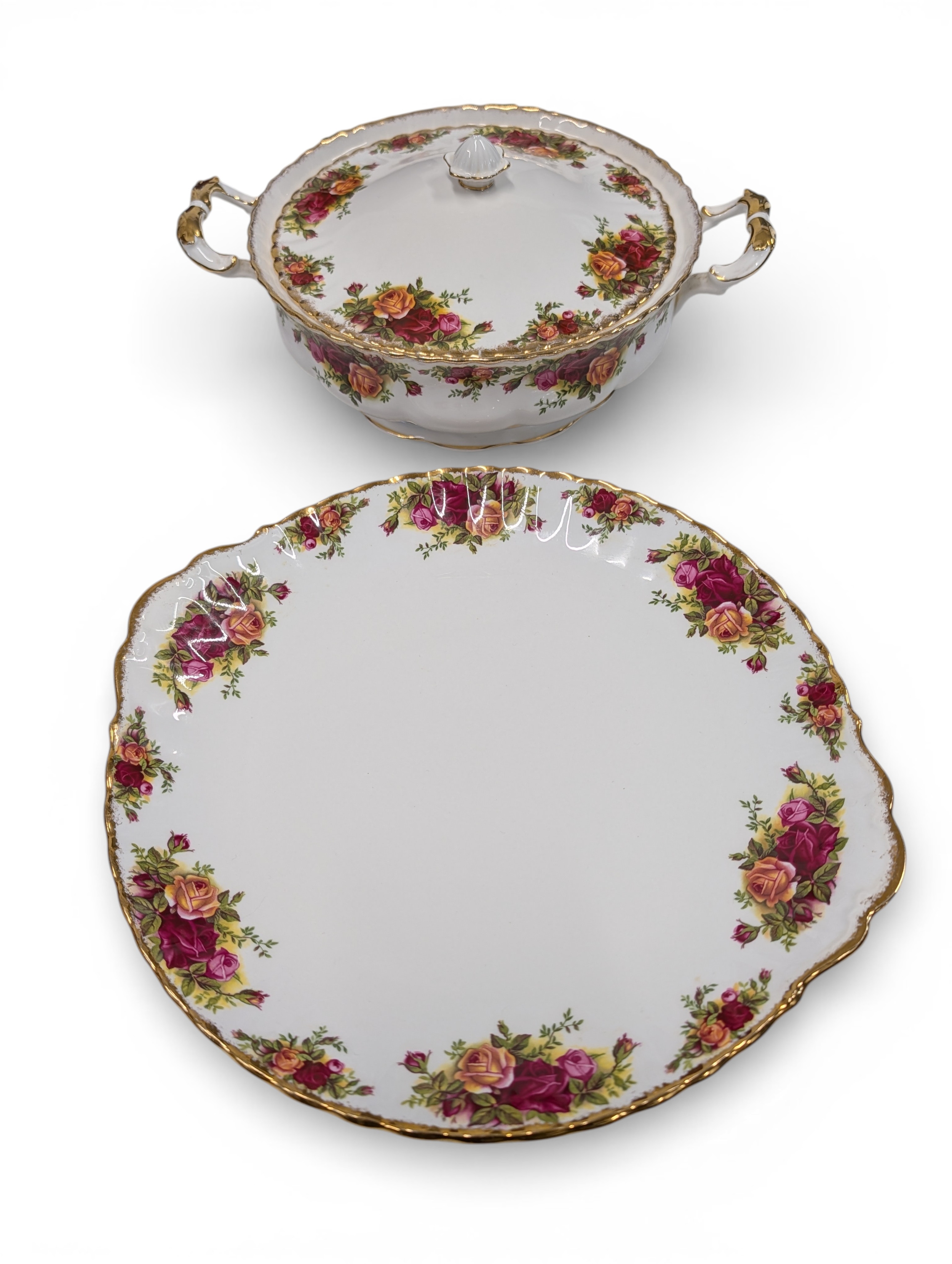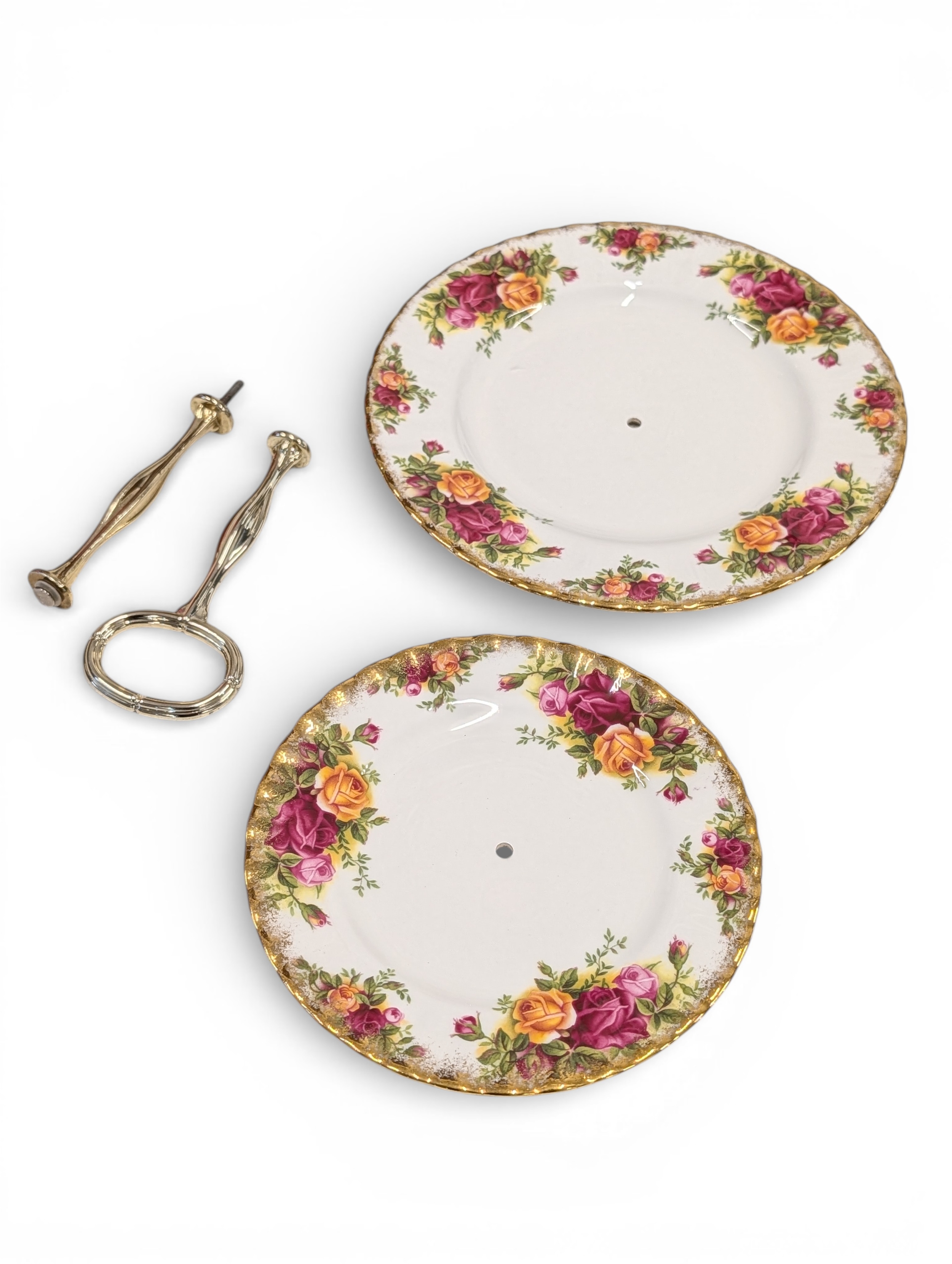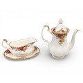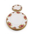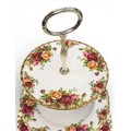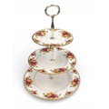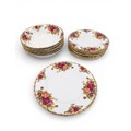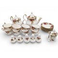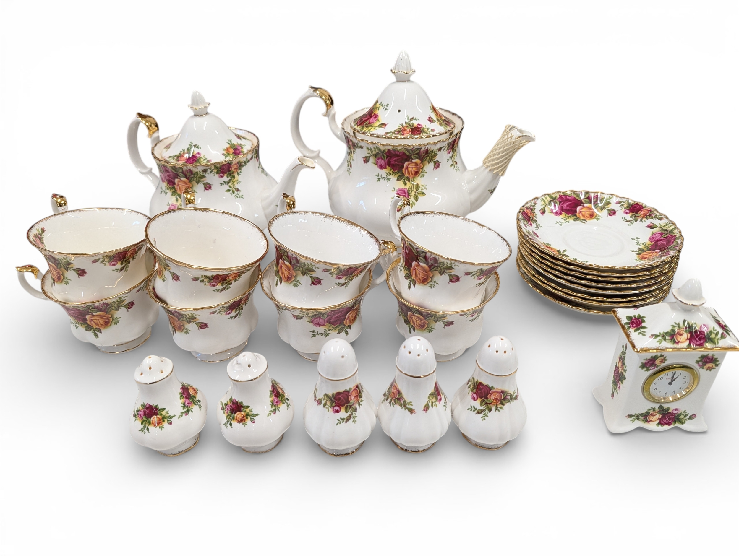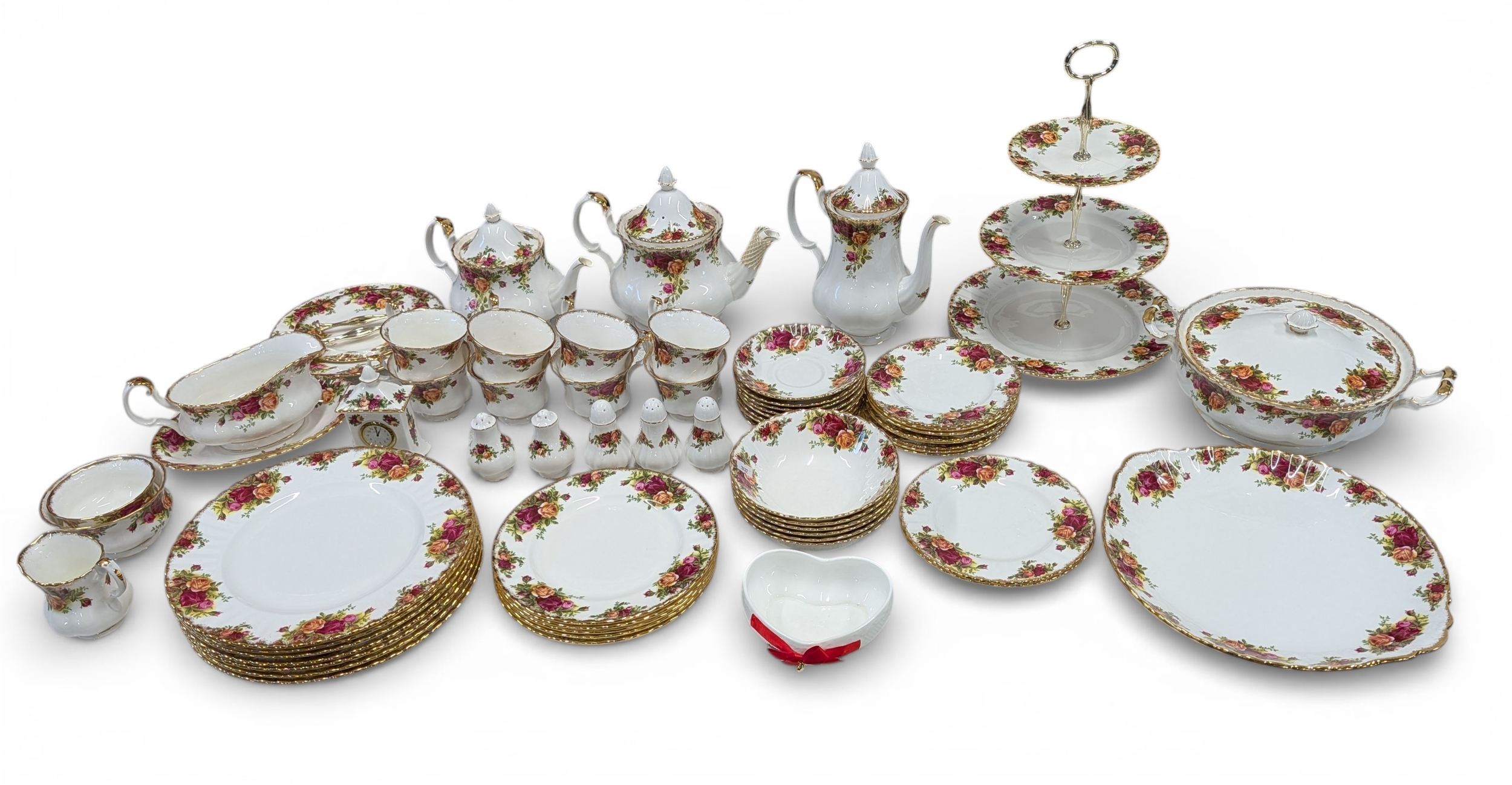 A Royal Albert "Old Country Roses" dinnerware, cake and tea set with a matching clock, approx 61 pieces in total, hairline crack in top platter of three tier cake stand and one cup otherwise in good condition