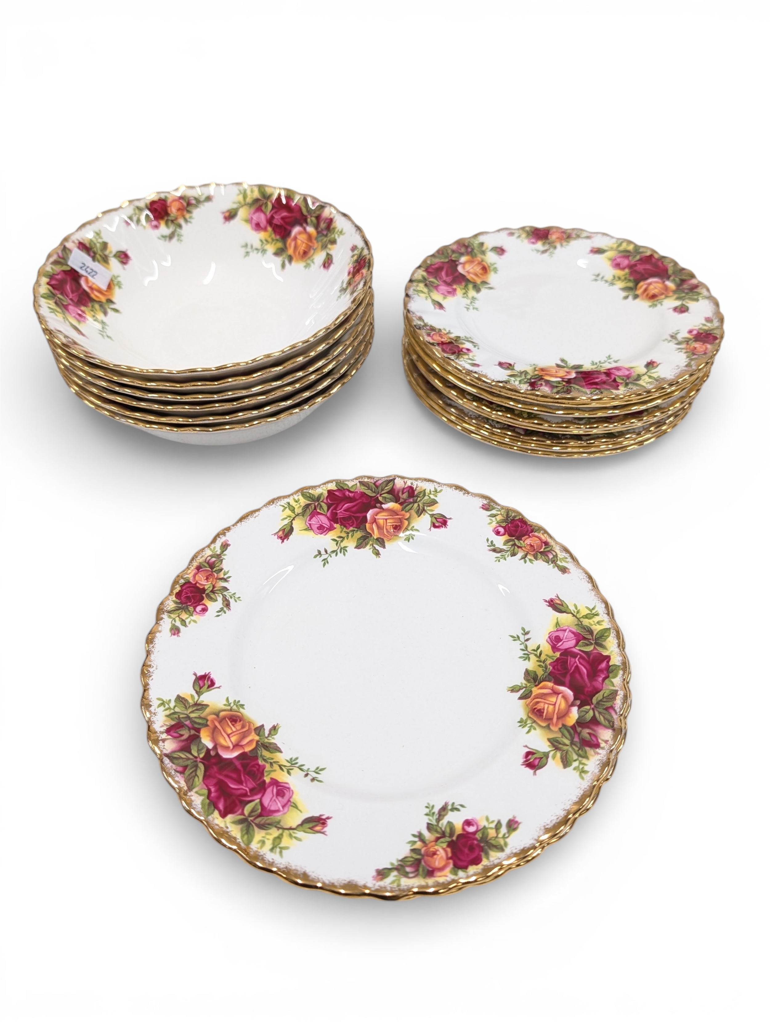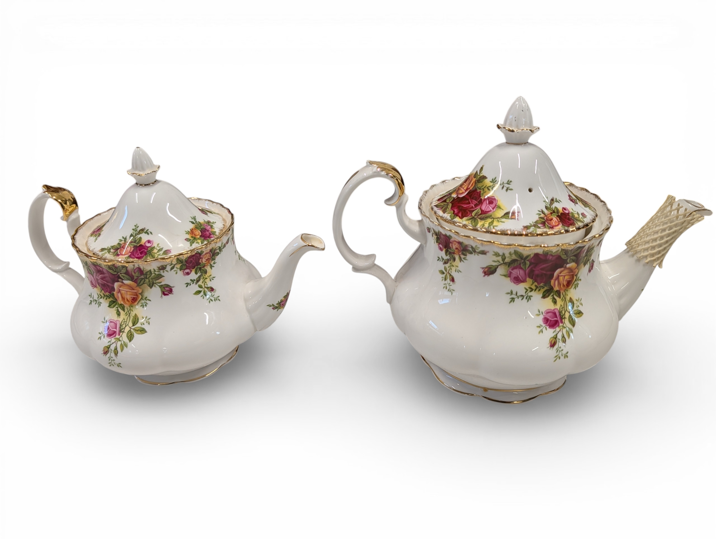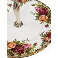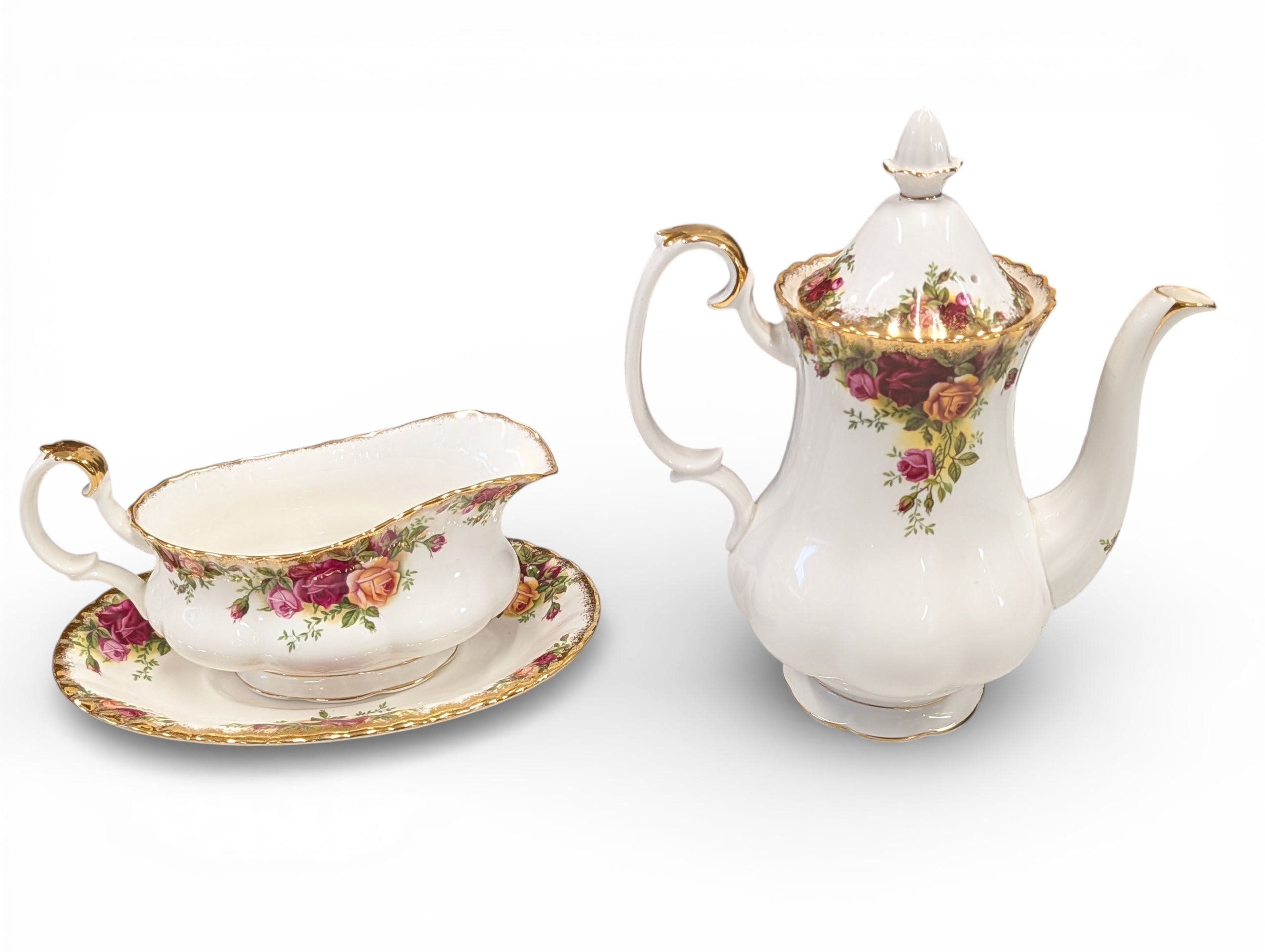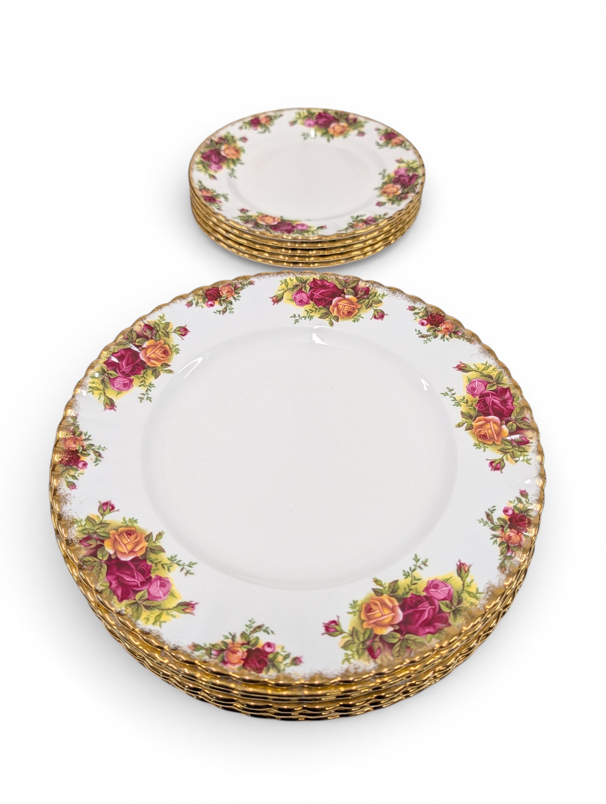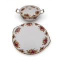 A Royal Albert "Old Country Roses" dinnerware, cake and tea set with a matching clock, approx 61 pieces in total, hairline crack in top platter of three tier cake stand and one cup otherwise in good condition