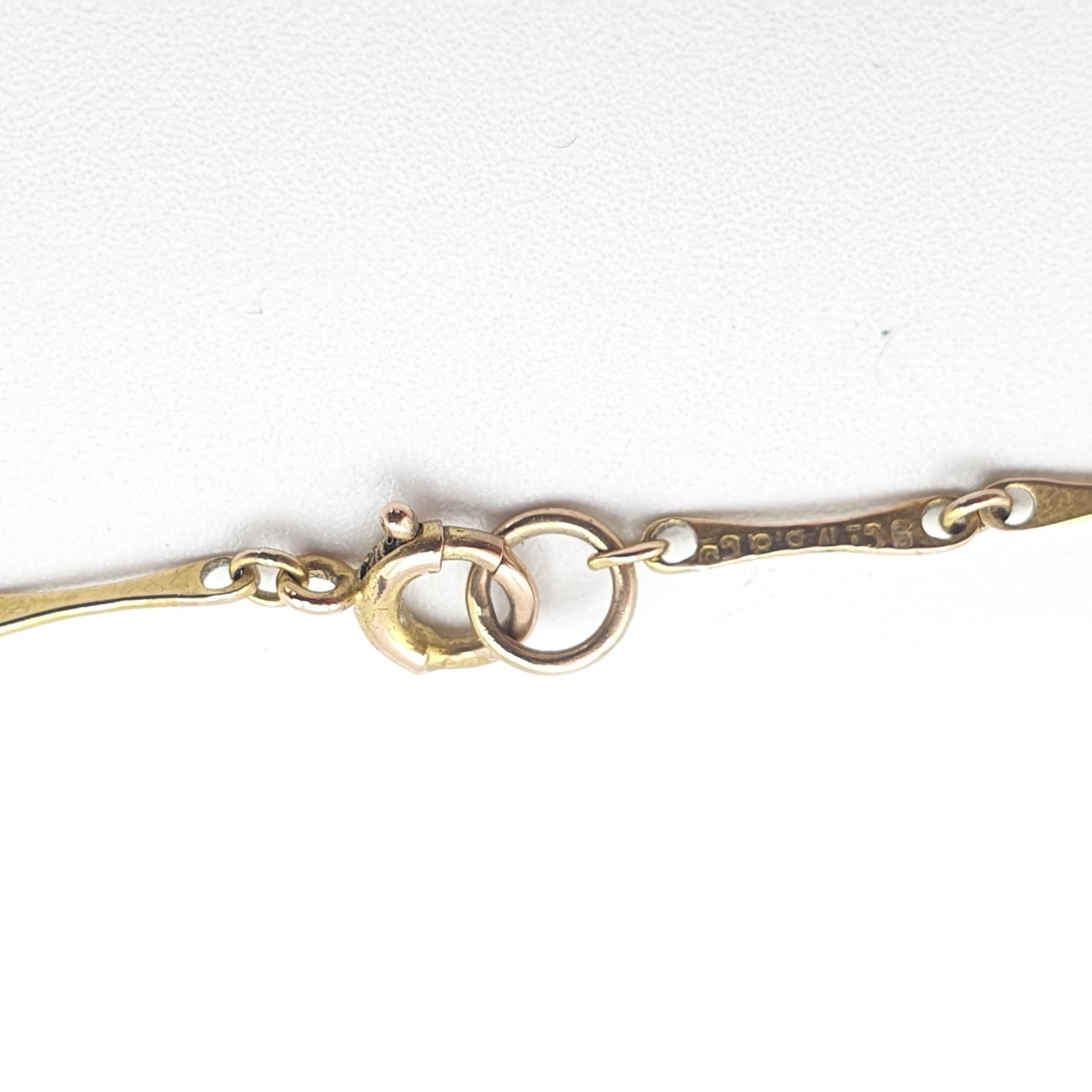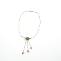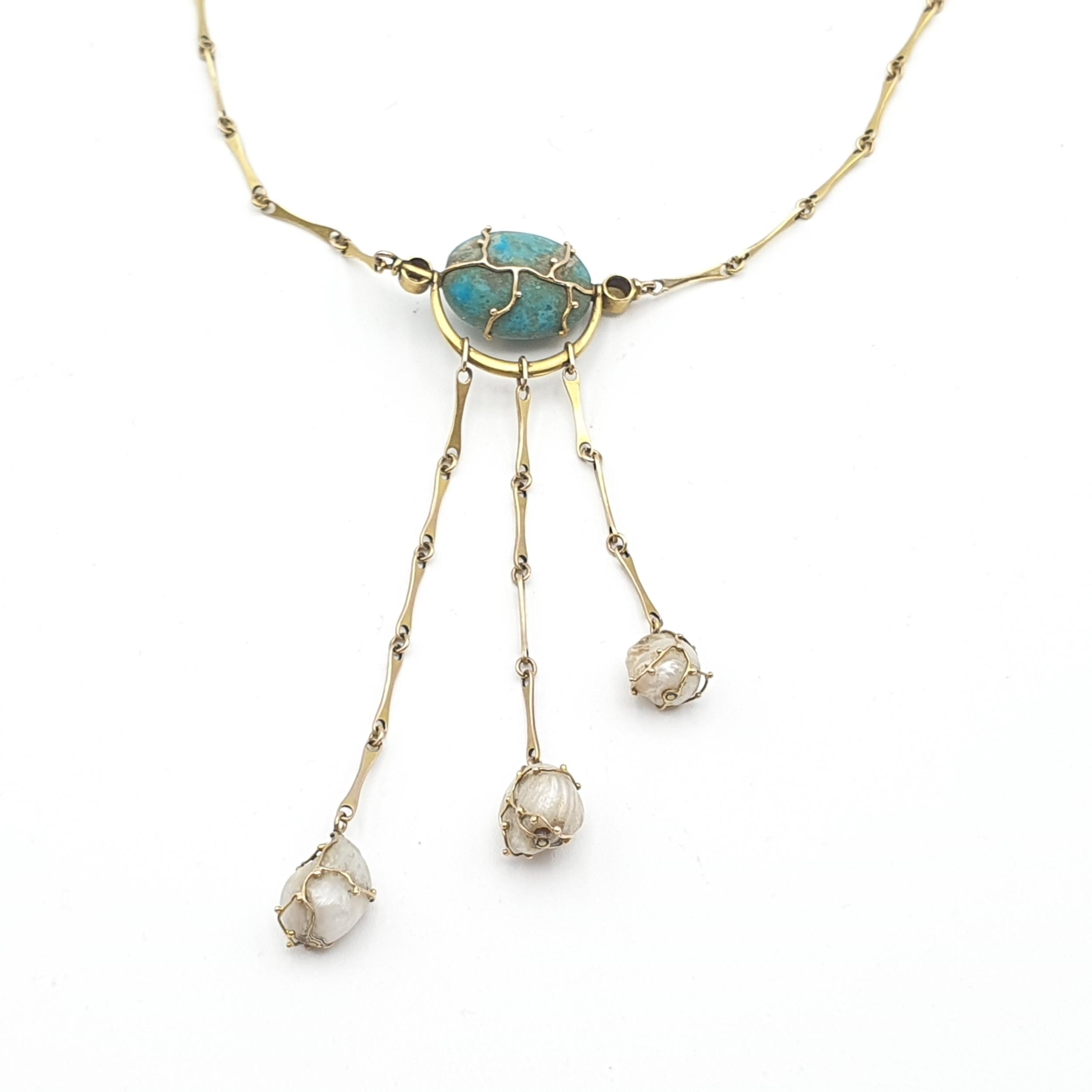 An antique revival necklace set turquoise between split pearls suspending three drops each set baroque pearl, marked 9ct, approx 7.3gms