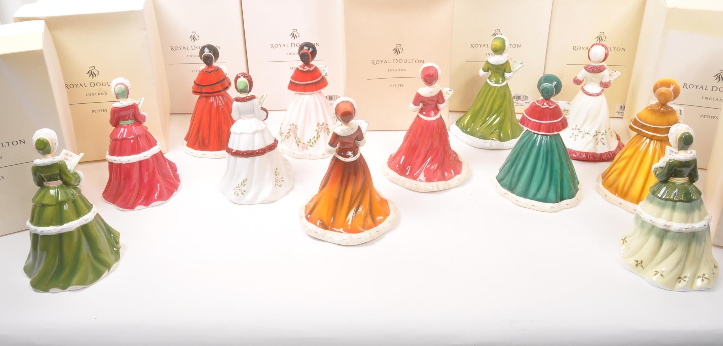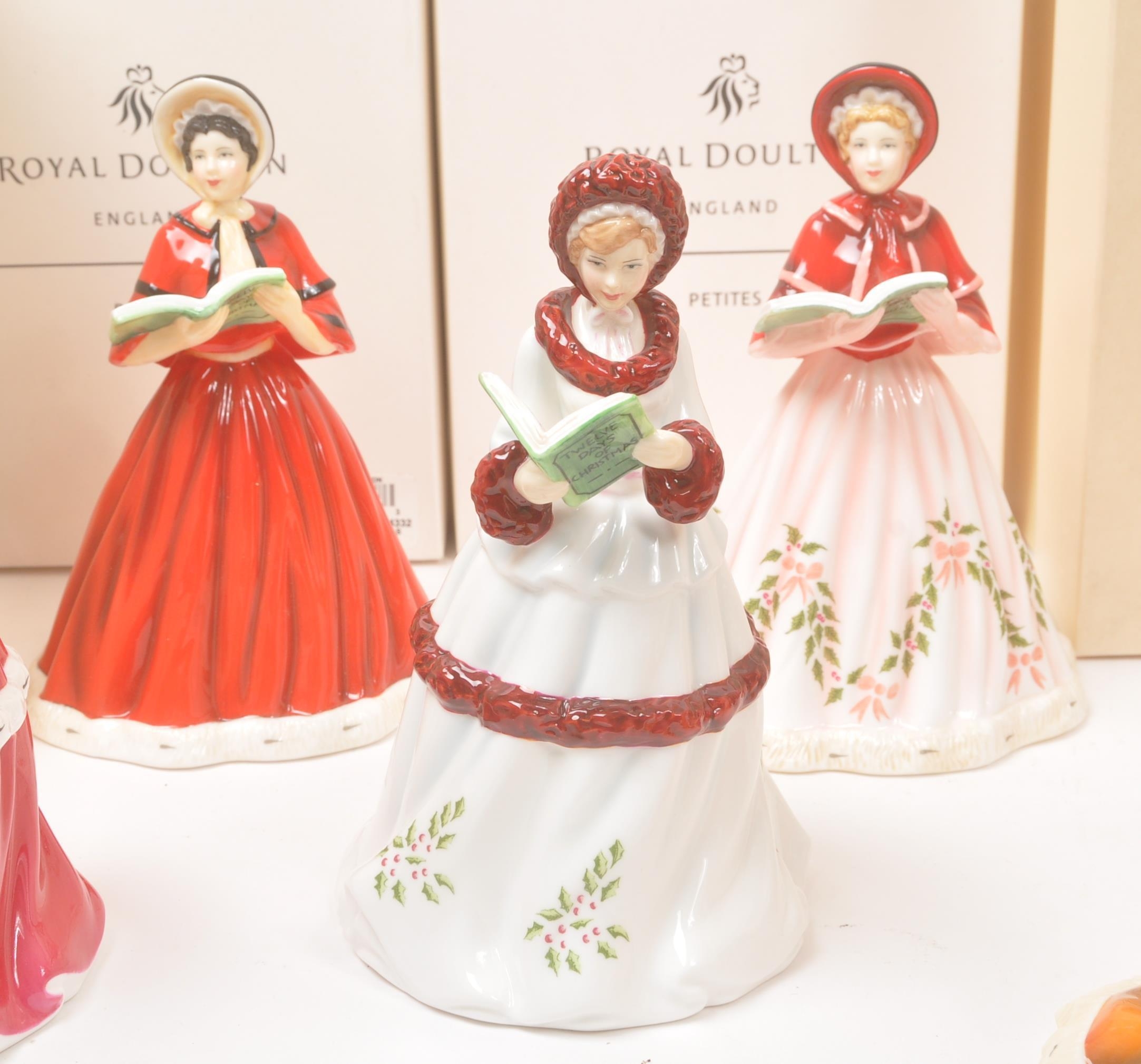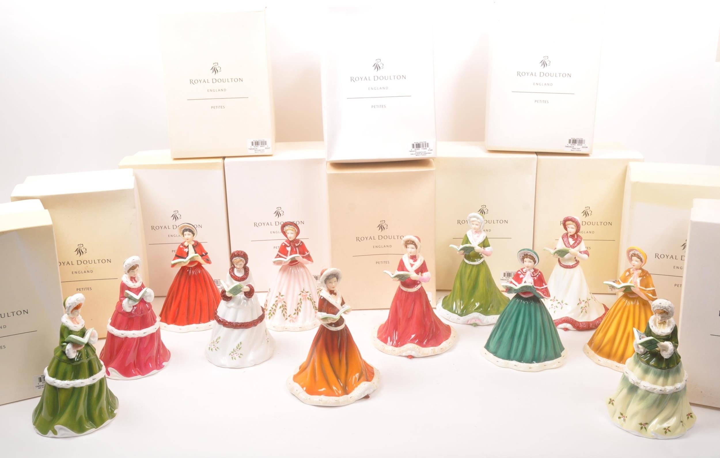 Royal Doulton - Petites - A collection of boxed Royal Doulton porcelain china tableware figurines. Comprising of the 12 twelve days of Christmas. Boxed with paperwork and certificates. HN5409, HN5173, HN5170, HN5171, HN5169, HN5168, HN5519, HN5172, HN5520, HN5518, HN5410, and HN5408.