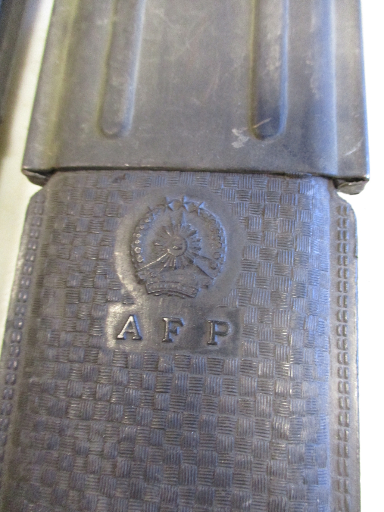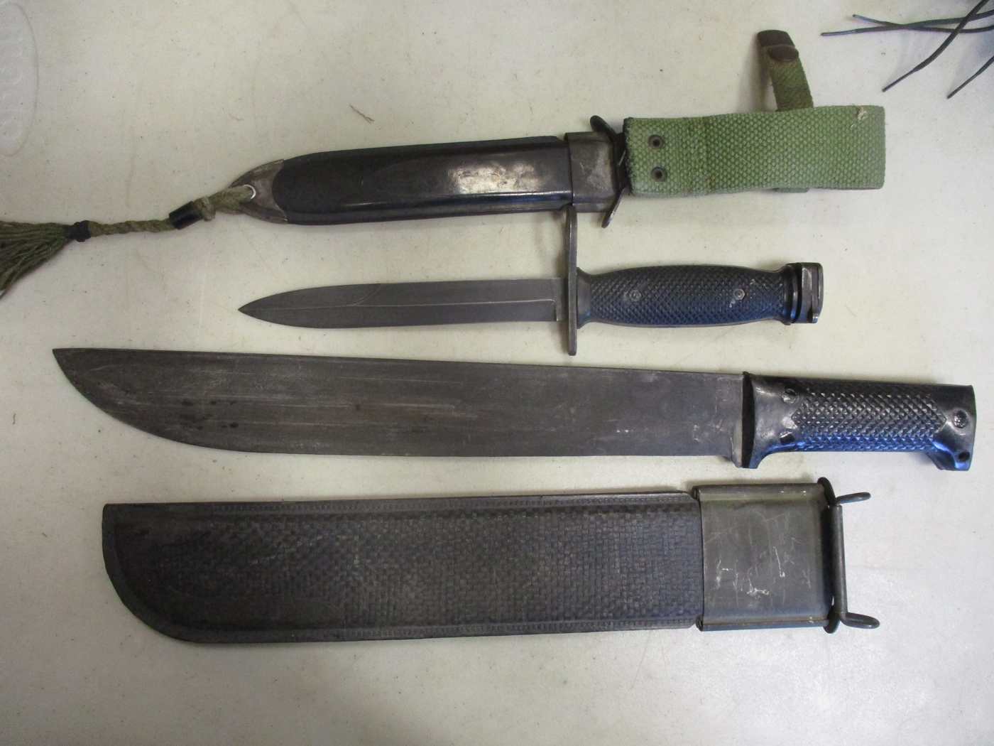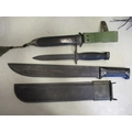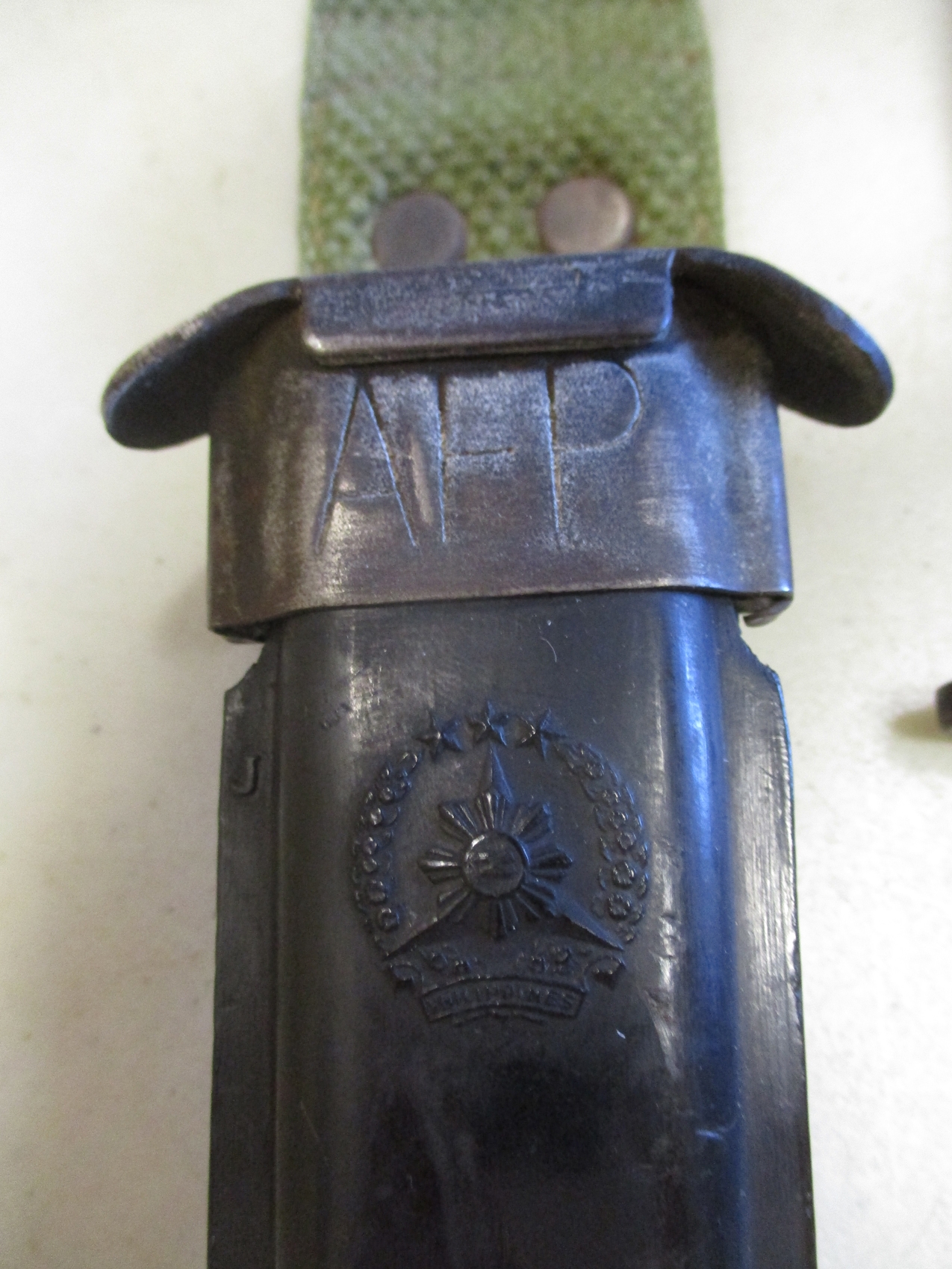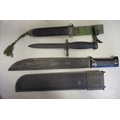 Armed Forces Philippines M7 bayonet and scabbard, AFP stamped into scabbard throat, plastic scabbard with moulded AFP crest and steel tip. Machete with unmarked blade, scabbard with moulded AFP crest with AFP below, generally very fine or better. WILL NOT BE POSTED OVERSEAS. Qty 2 (B)