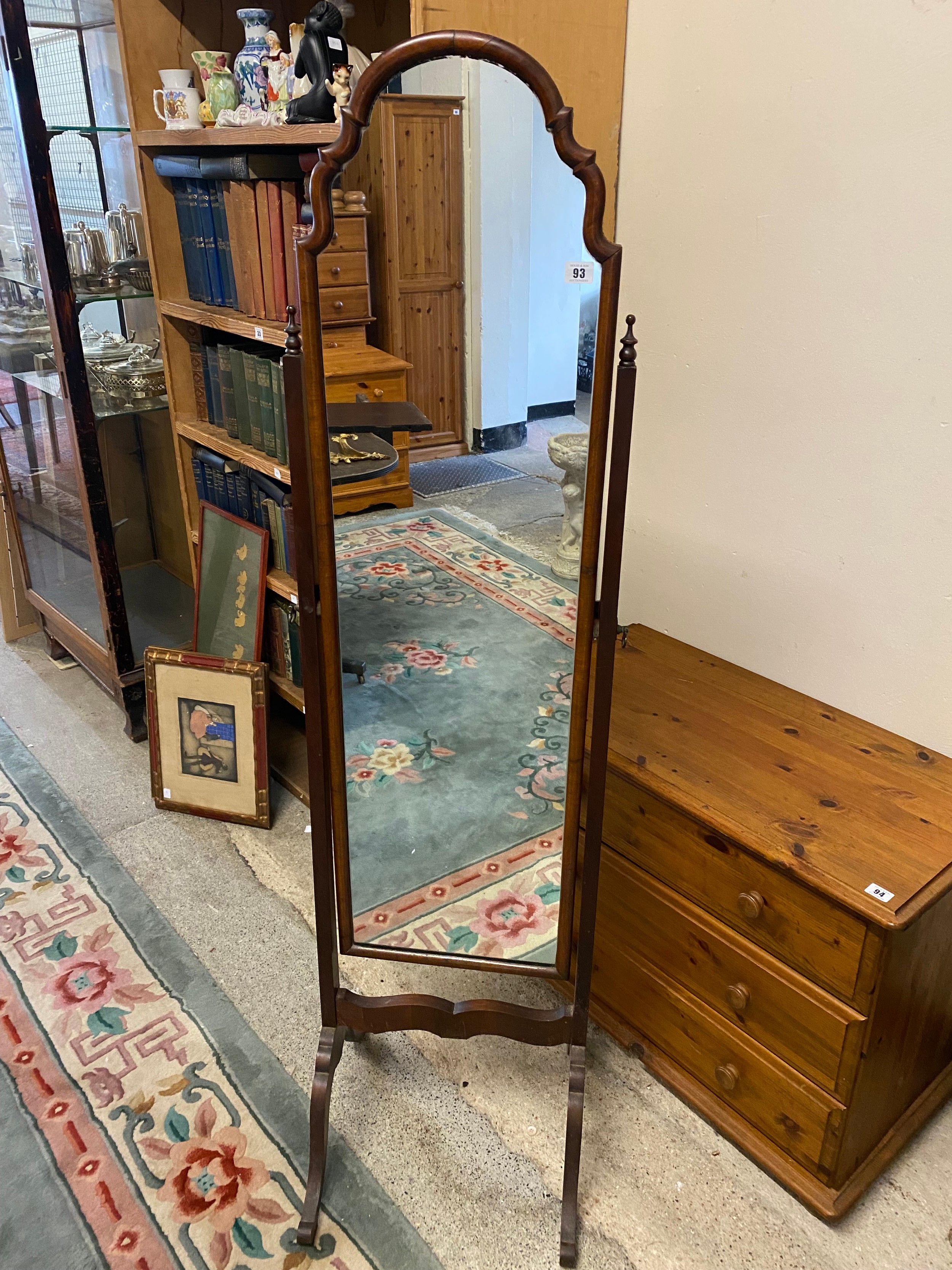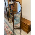 A mahogany framed Queen Anne style cheval mirror on splayed feet