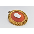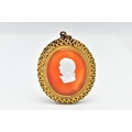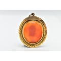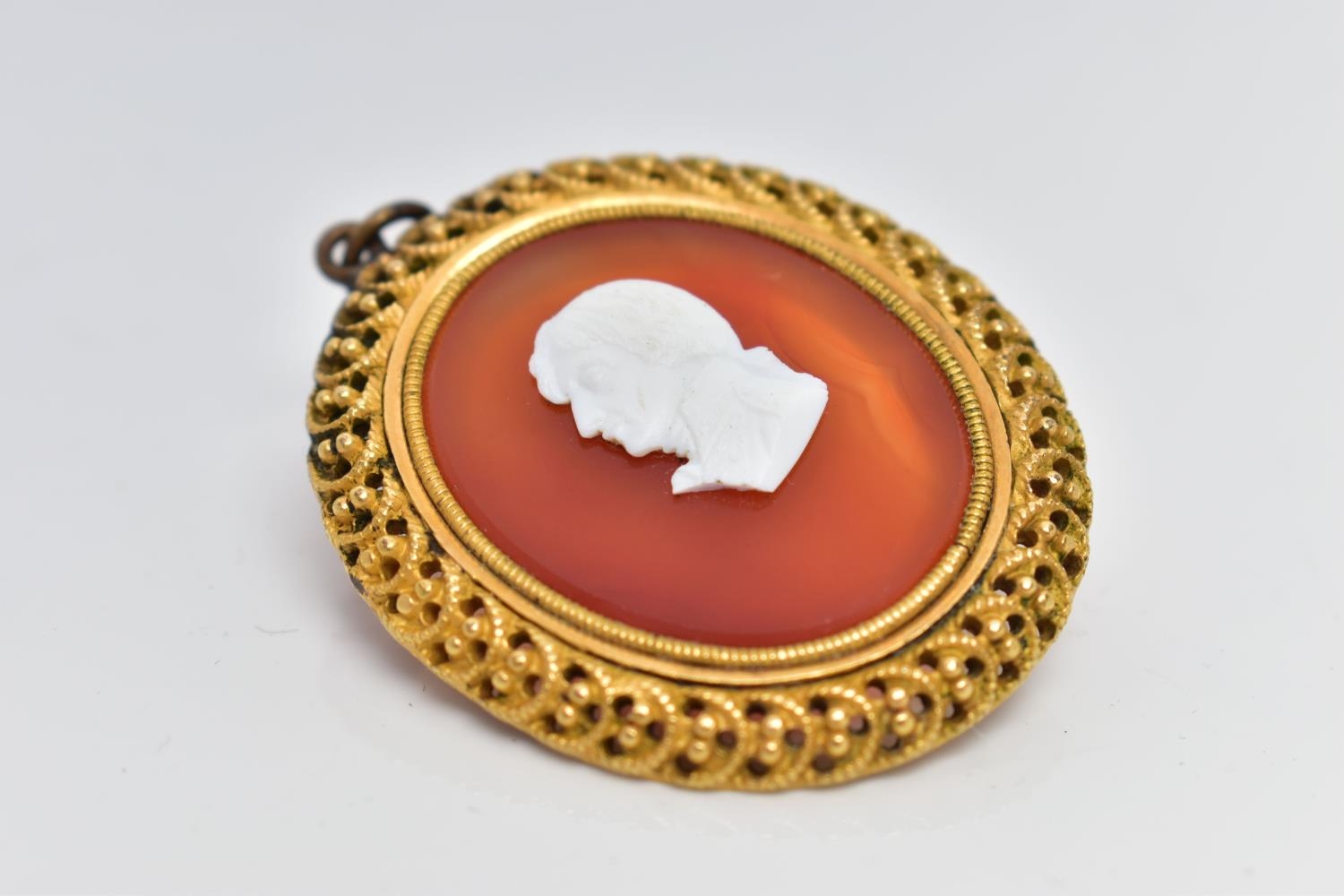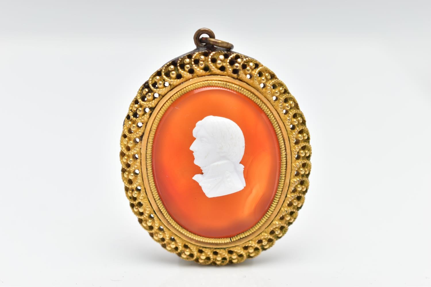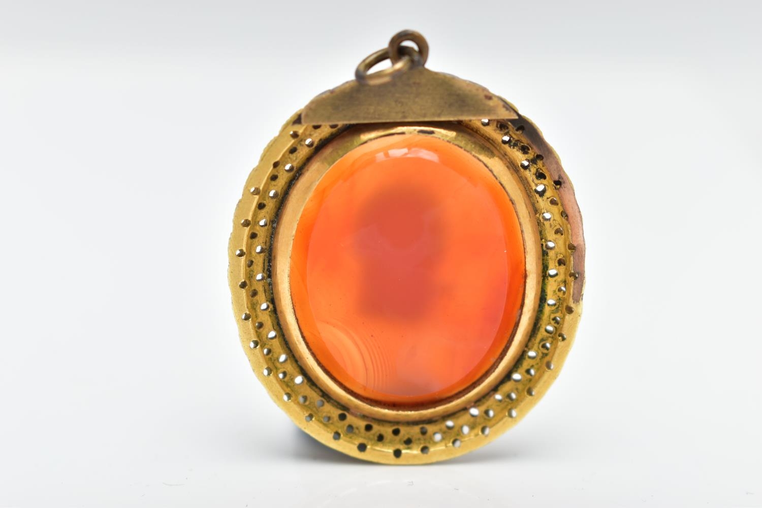 AN 18TH CENTURY CARNELIAN AND PASTE CAMEO PENDANT, an oval cut carnelian showing some curved banding, decorated with a small paste cameo of a military gentleman, believed to be the work of James Tassie (1735-1799) unmarked, set in a yellow metal gilt mount, detailed with rope and beading pattern, approximate dimensions length 36mm x width 31mm (condition report: general moderate wear, some very small minor abrasions to carnelian)