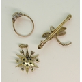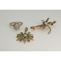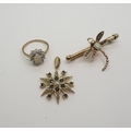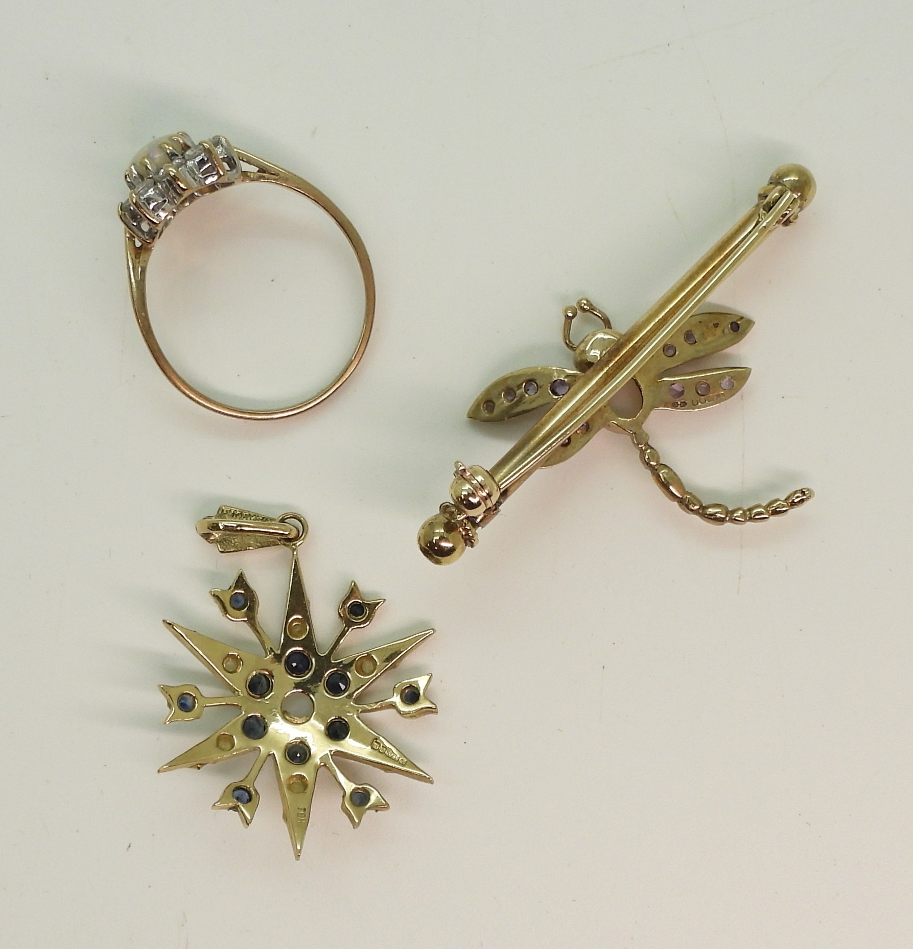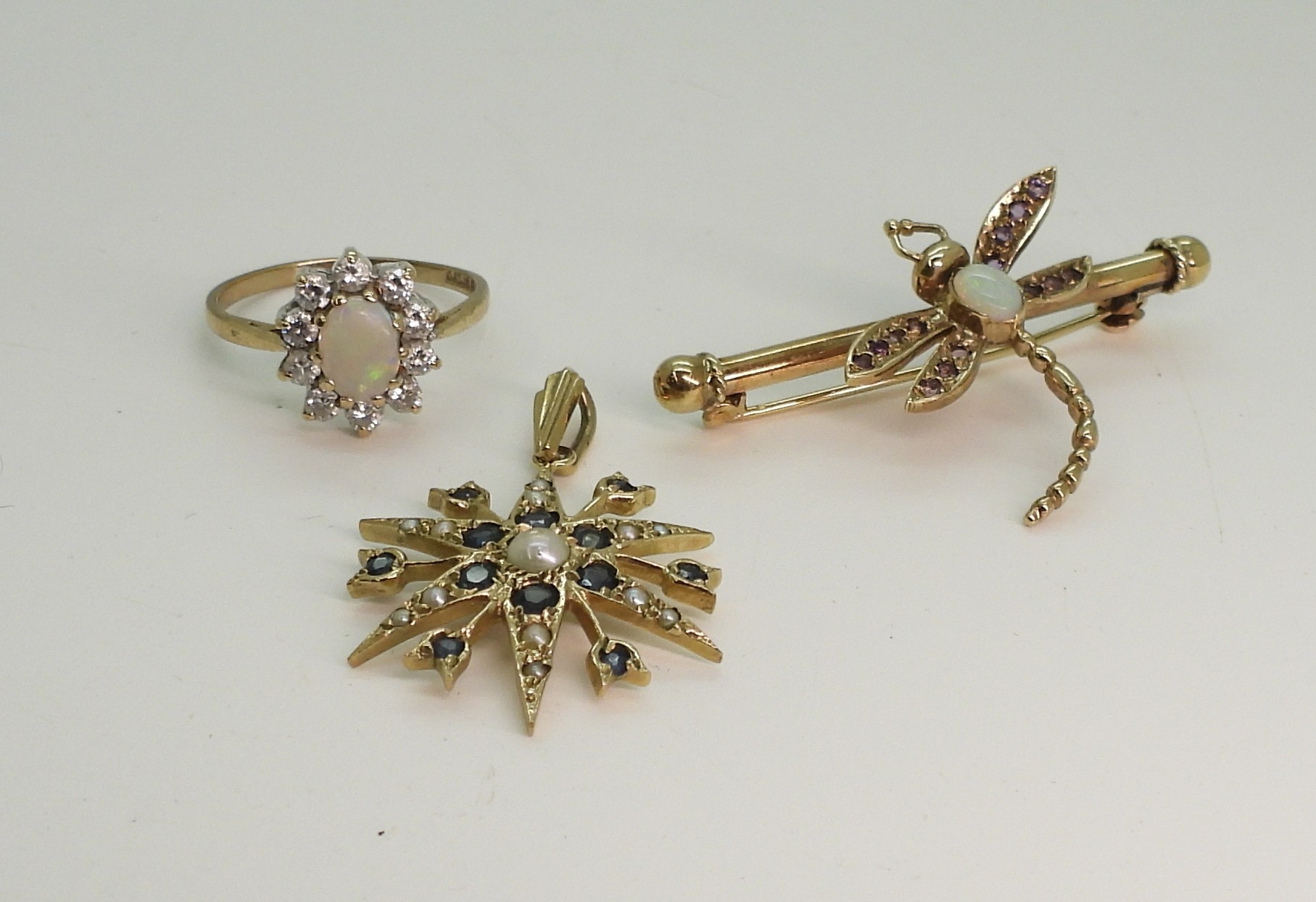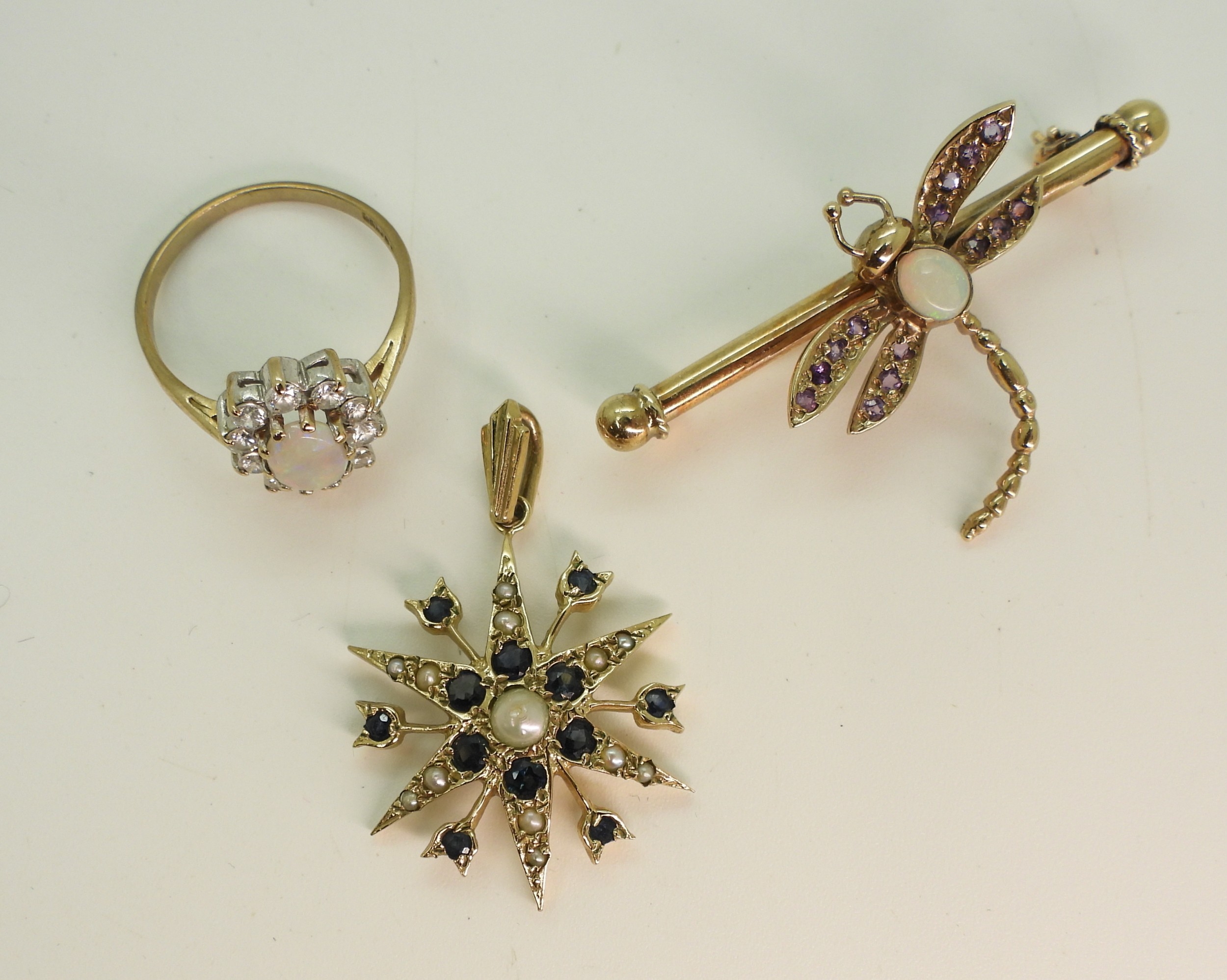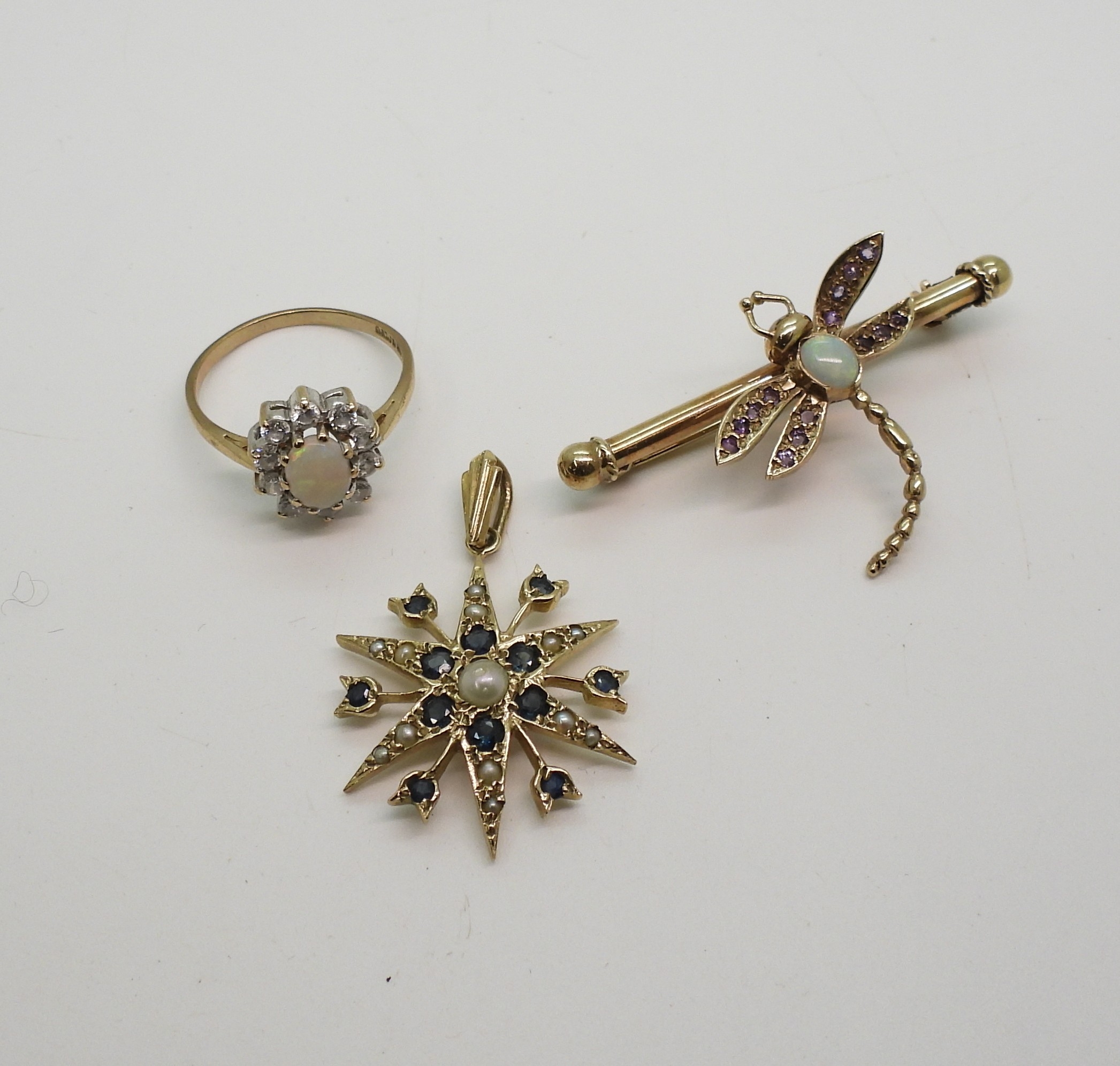 A 9ct gold sapphire and pearl star pendant, diameter 2.5cm, together with a 9ct gold opal and amethyst dragonfly brooch, length 4.3cm, and a 9ct gold opal and clear gem set ring, size O1/2, weight all together 9.3gms