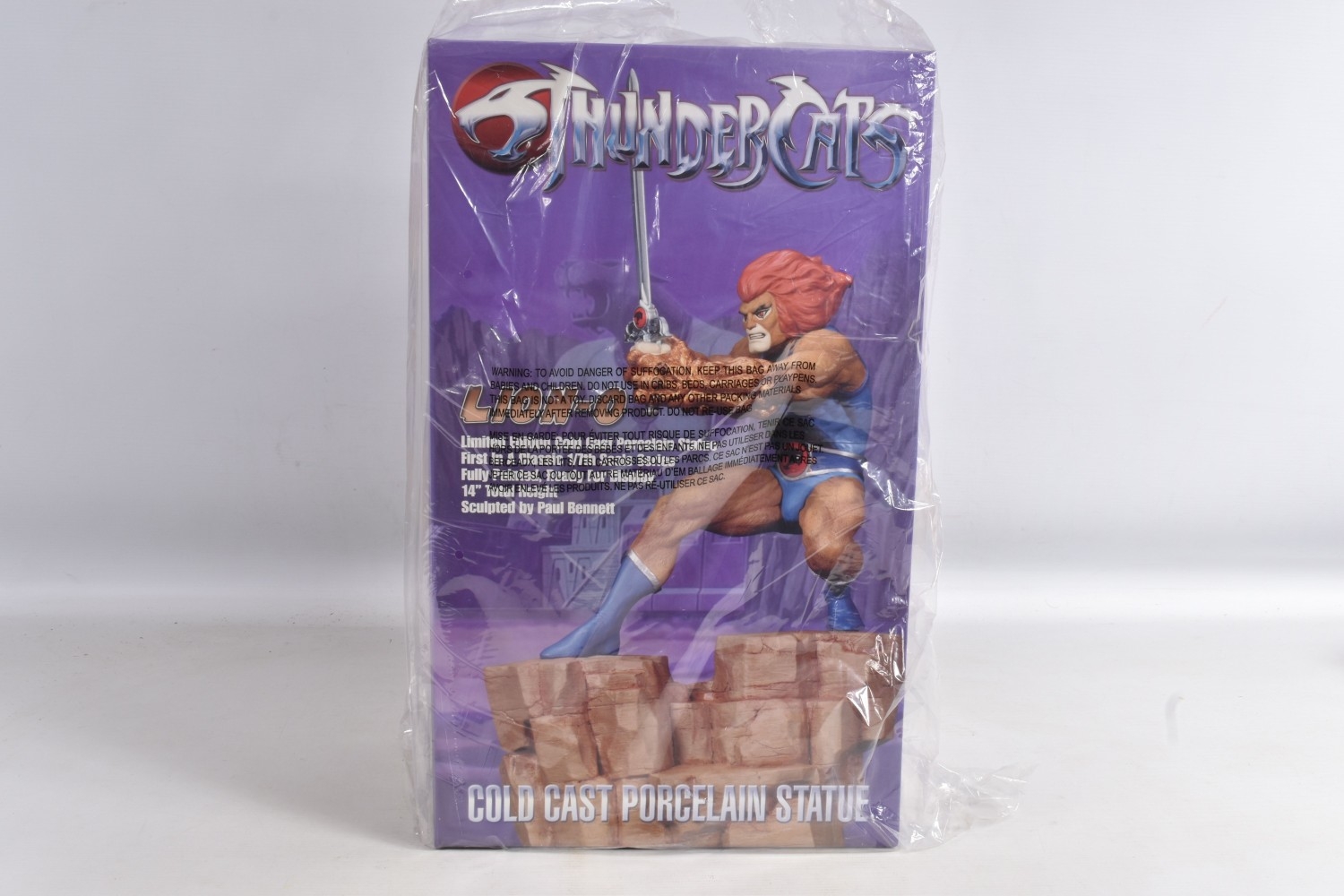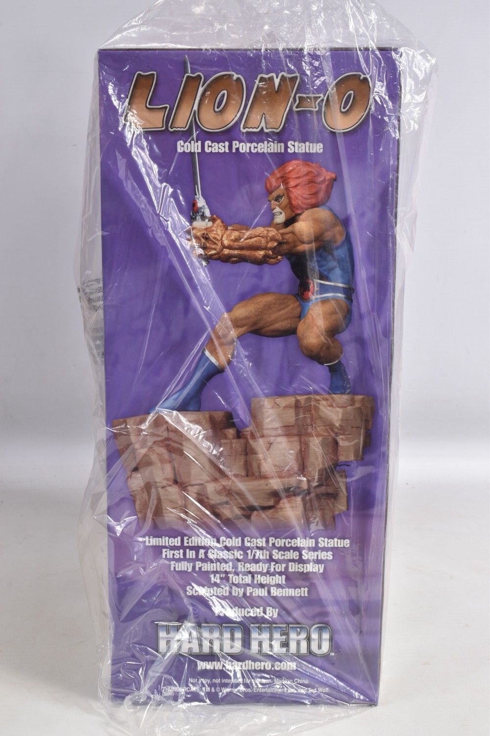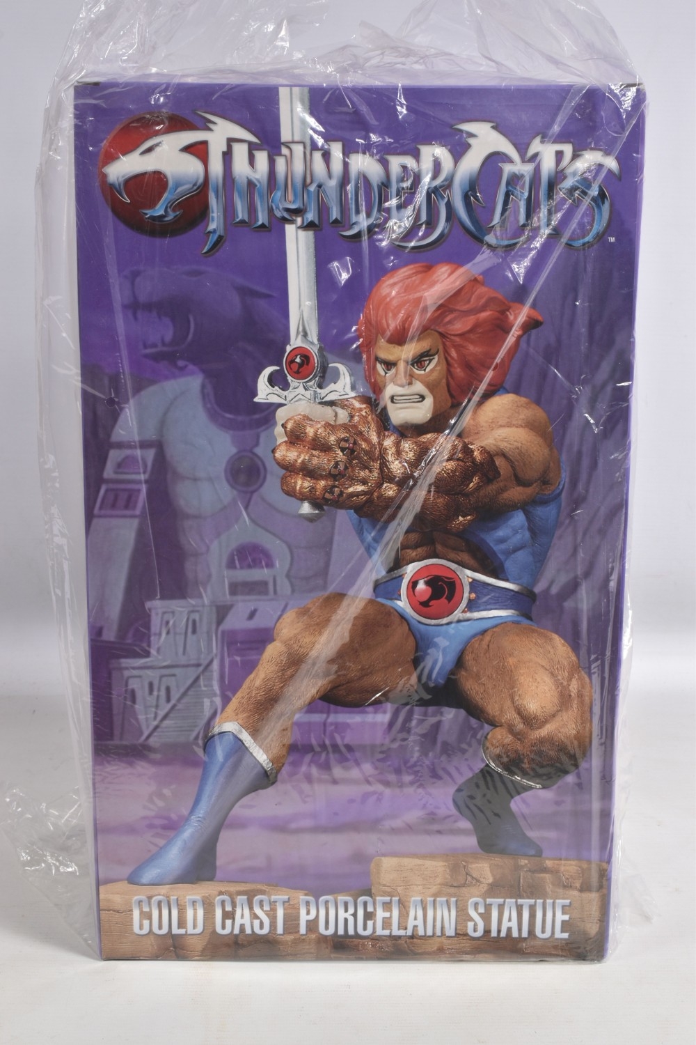 A SEALED BOXED HARD HERO WARNER BROS THUNDERCATS LION-O 14 COLD CAST PORCELAIN STATUE, boxed opened from the top but figure sealed within polystyrene internal packaging, with its plastic bag external wrapping,