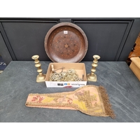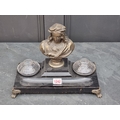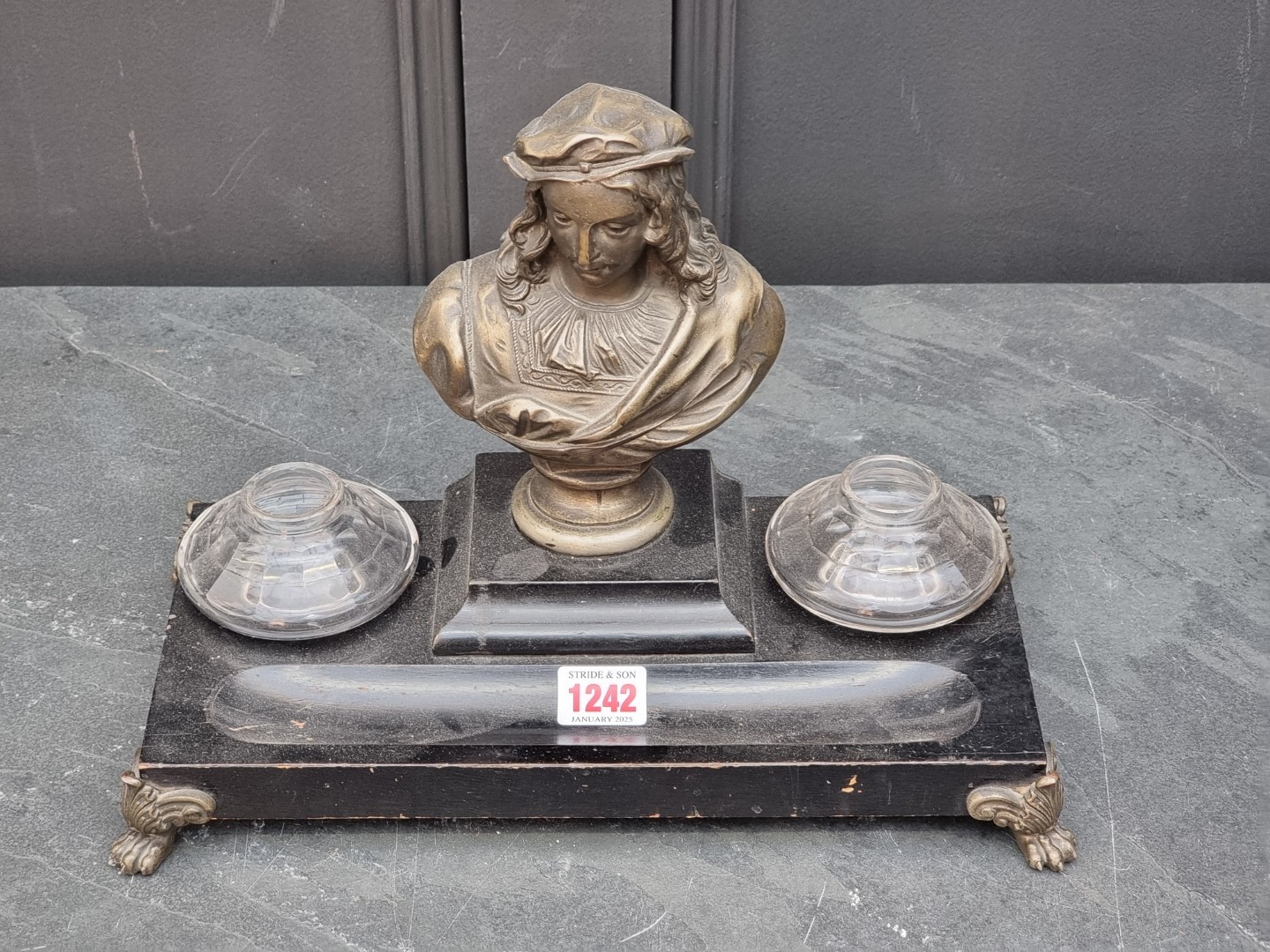 An antique spelter and ebonized desk stand, 33.5cm wide.