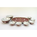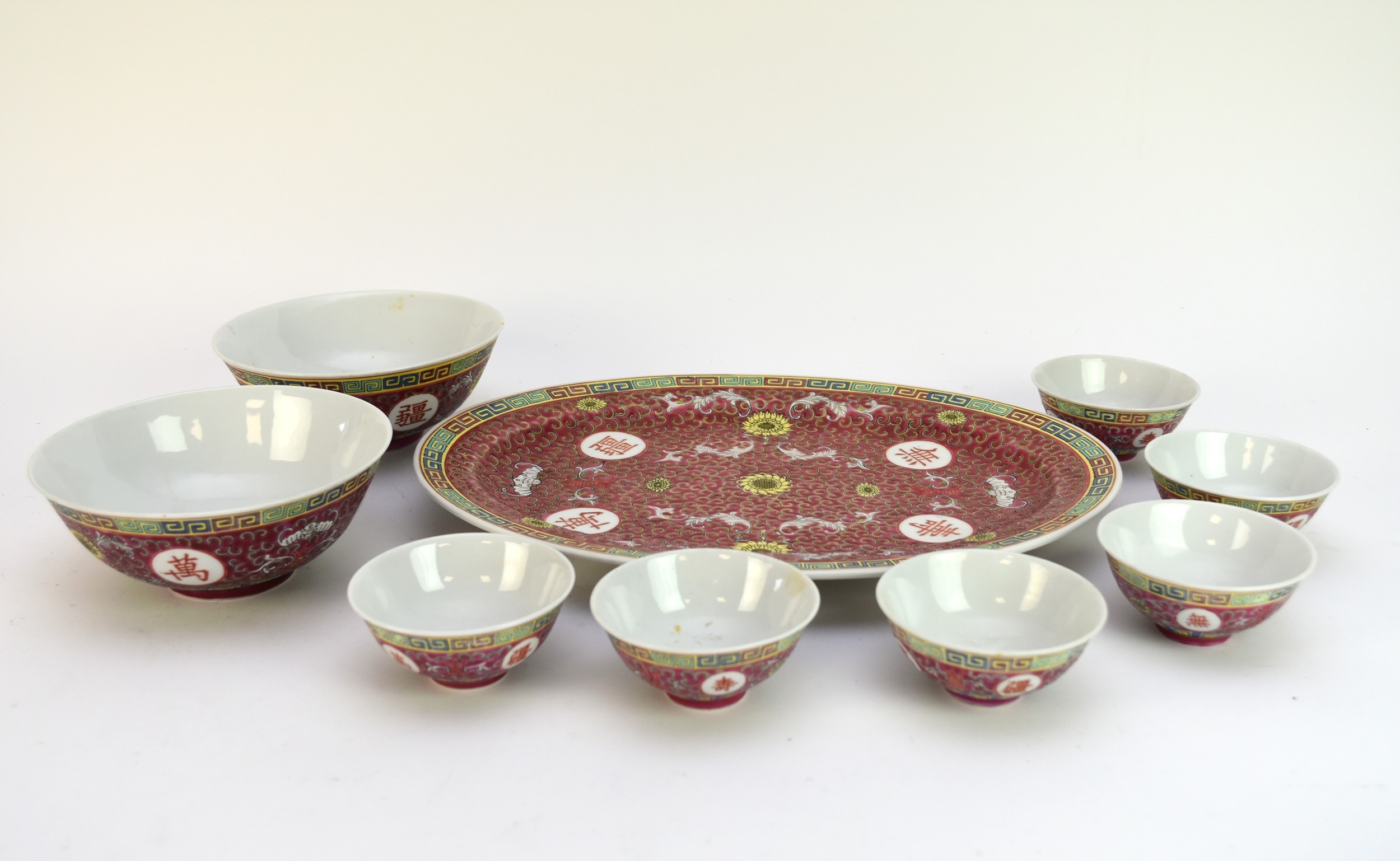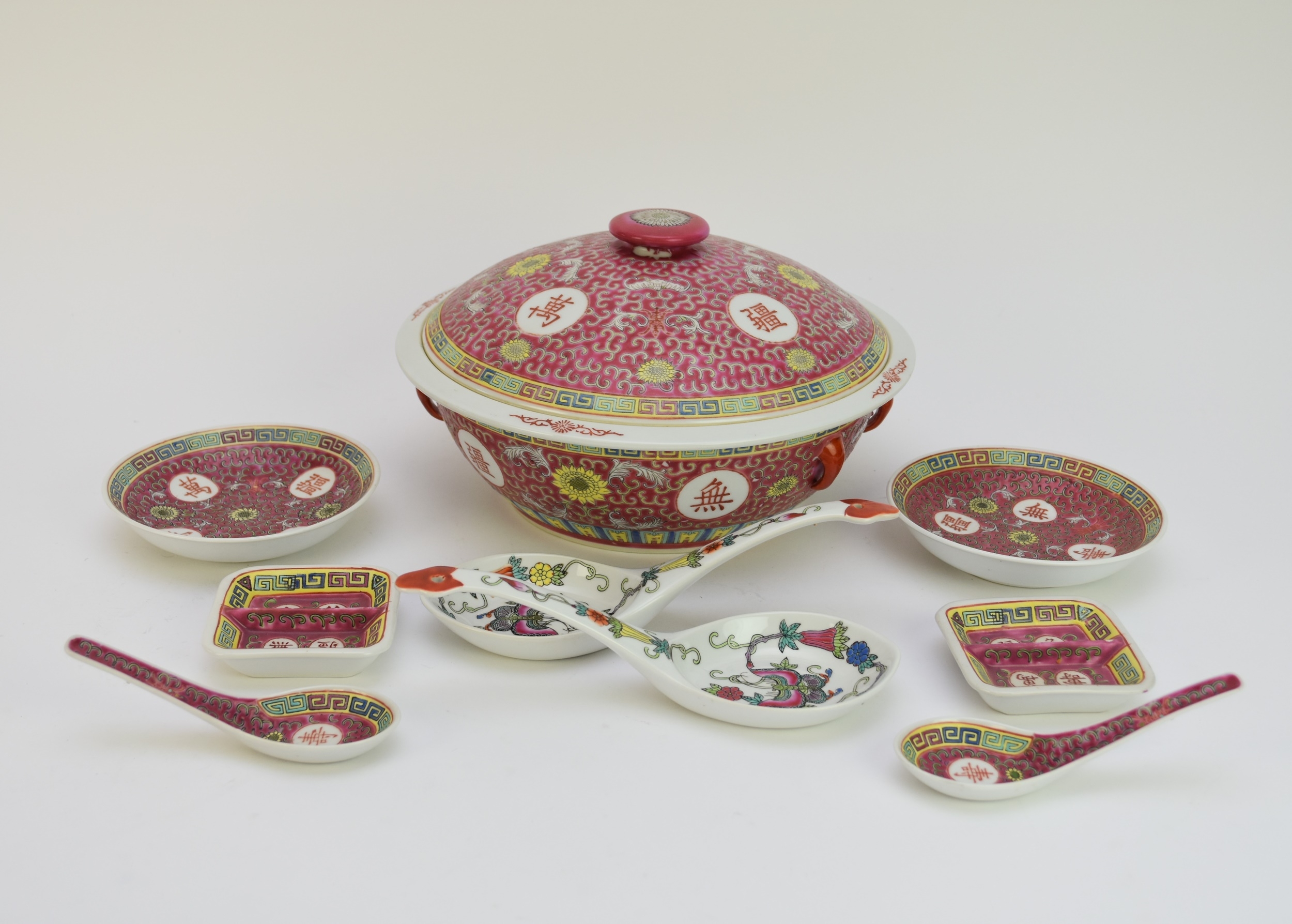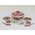 A Chinese famille rose brocade dinner service, 20th century, decorated with scrolling foliage and shou symbols on a pink ground, comprising: tureen and cover, 28cm; oval platter, 36cm; four plates, 26cm; twenty-three bowls of graduated size, 12.5, 10.5 and 9cm dia.; two bowls, 16cm; twenty-four graduated dishes, 7cm, 10cm and 14cm dia.; eight rice spoons; a serving spoon; two condiment dishes, 8.5cm; together with three further serving spoons of a different pattern.