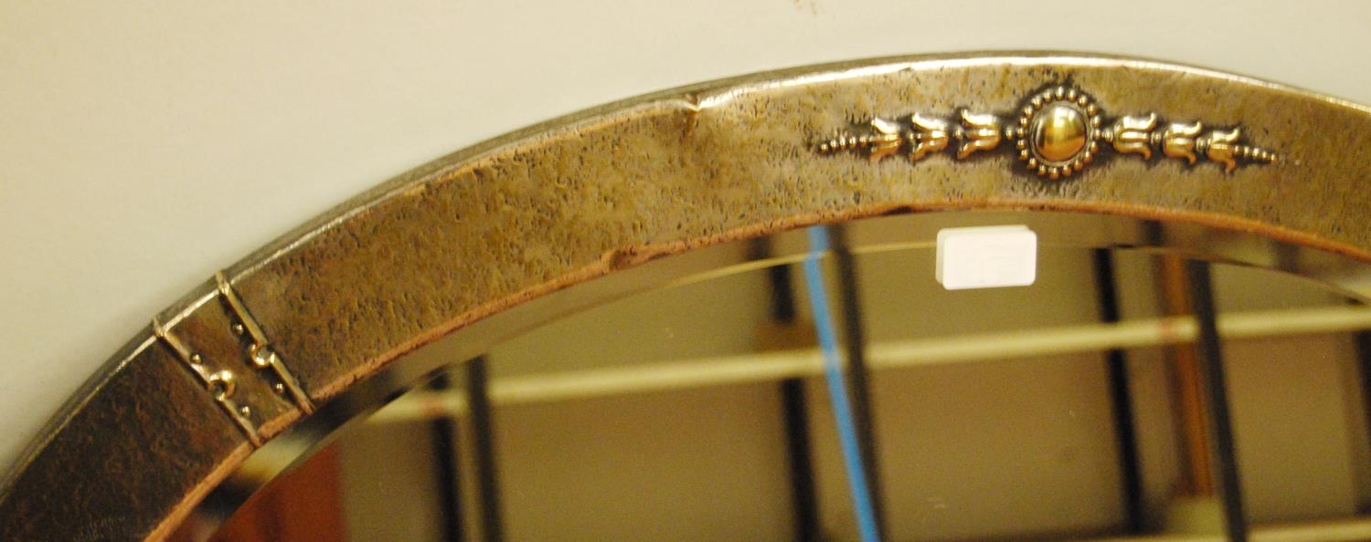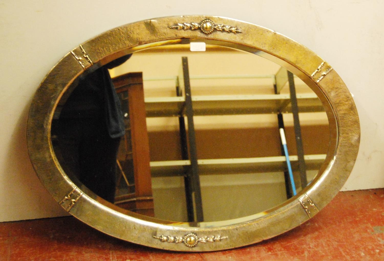Early 20th century Arts & Crafts-style hammered white metal oval mirror, decorated with floral roundels and strapwork panels, 63cm high and 88cm wide.