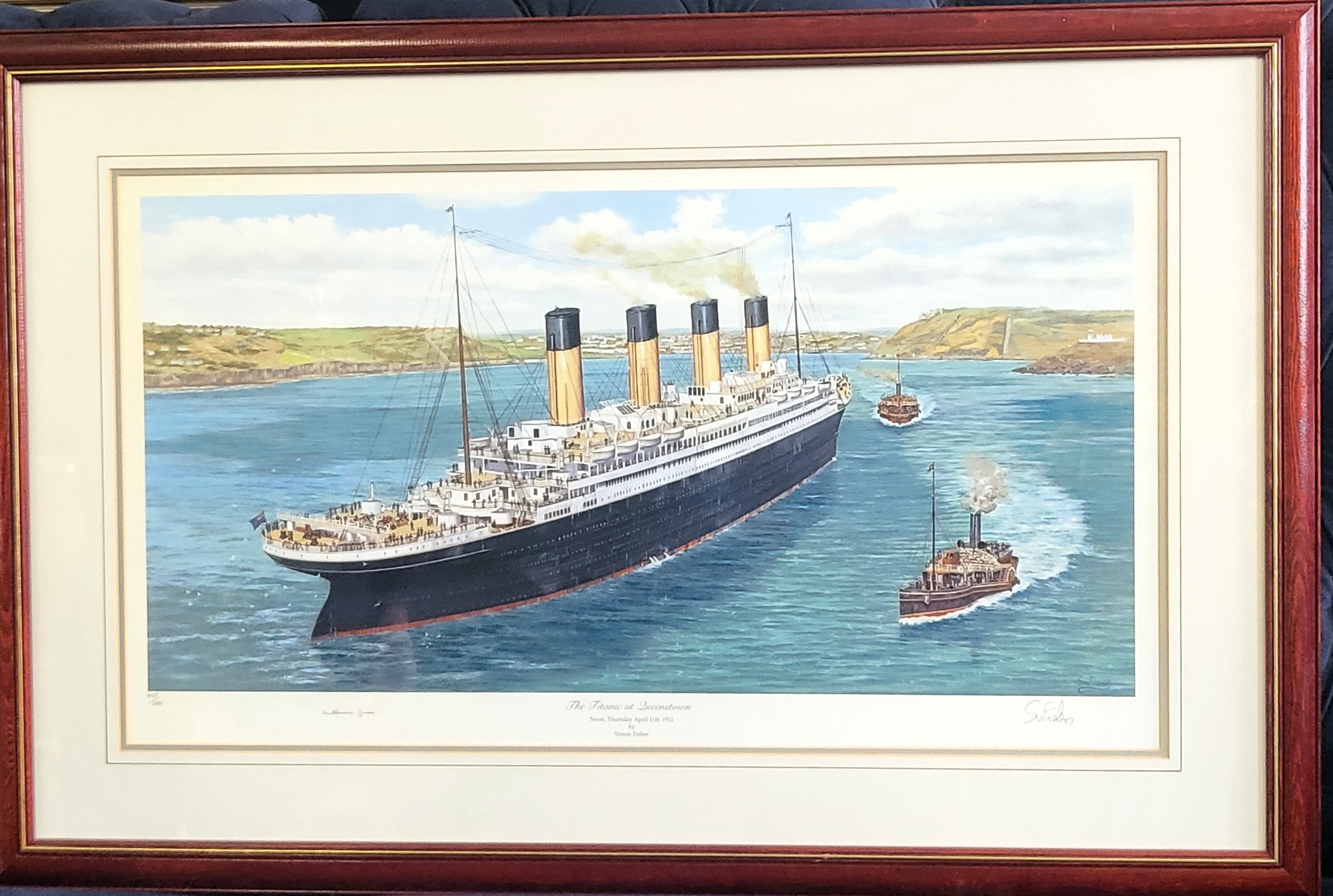 A Titanic print by Simon Fisher 'The Titanic at Queenstown', signed in pencil by the artist and Millvina Dean (the youngest and last living survivor). 60 x 92cm inc. frame. (with certificate of authenticity).