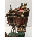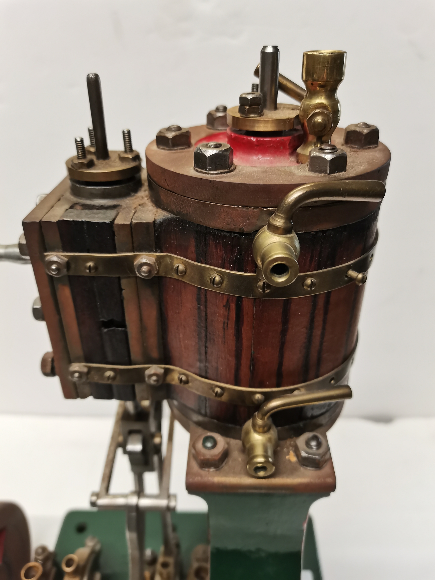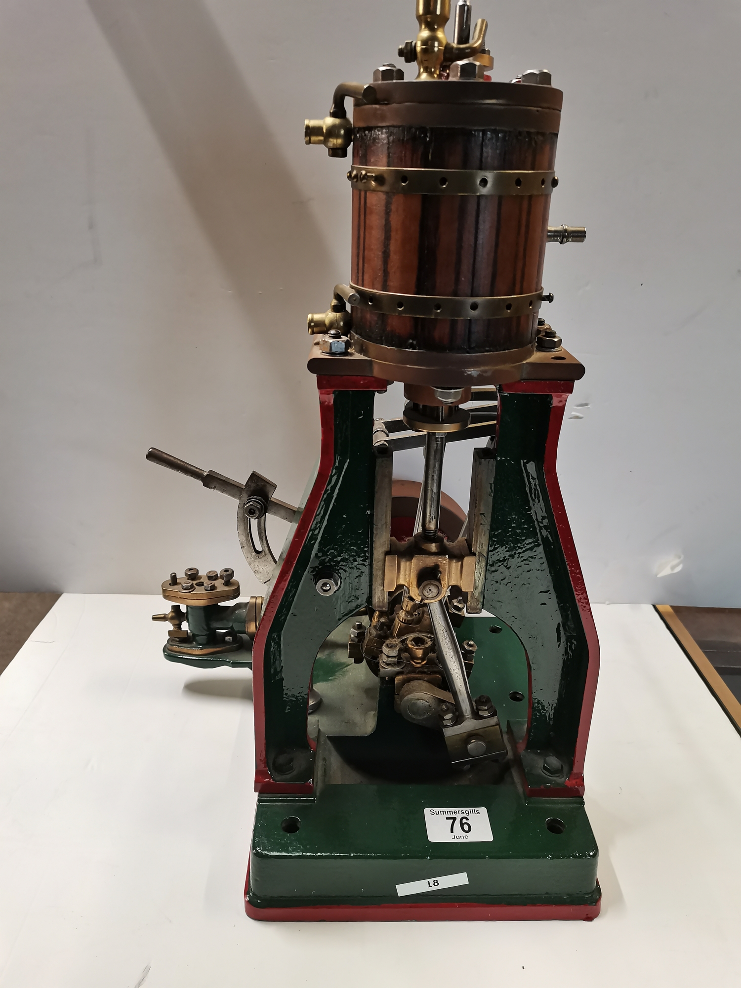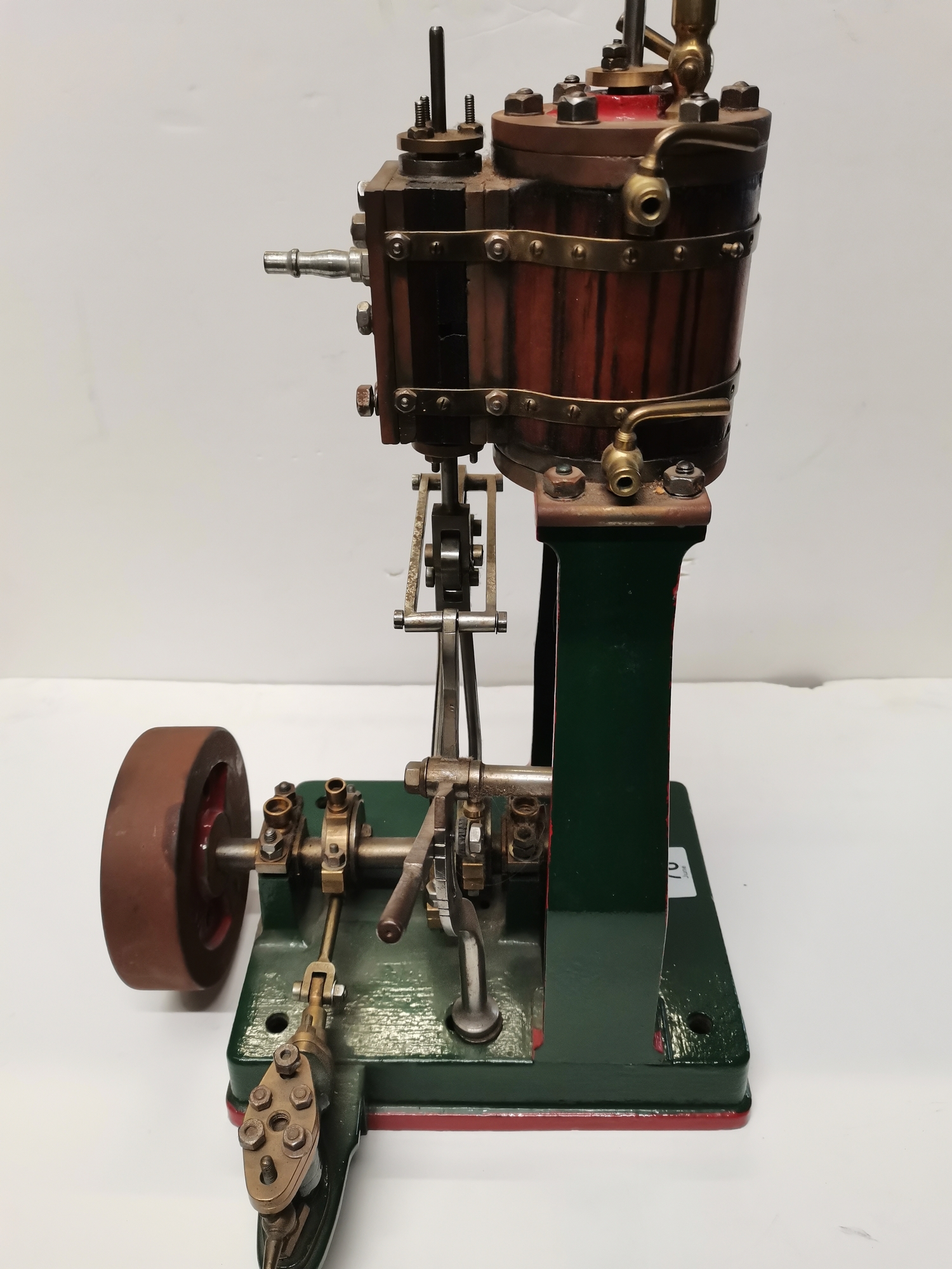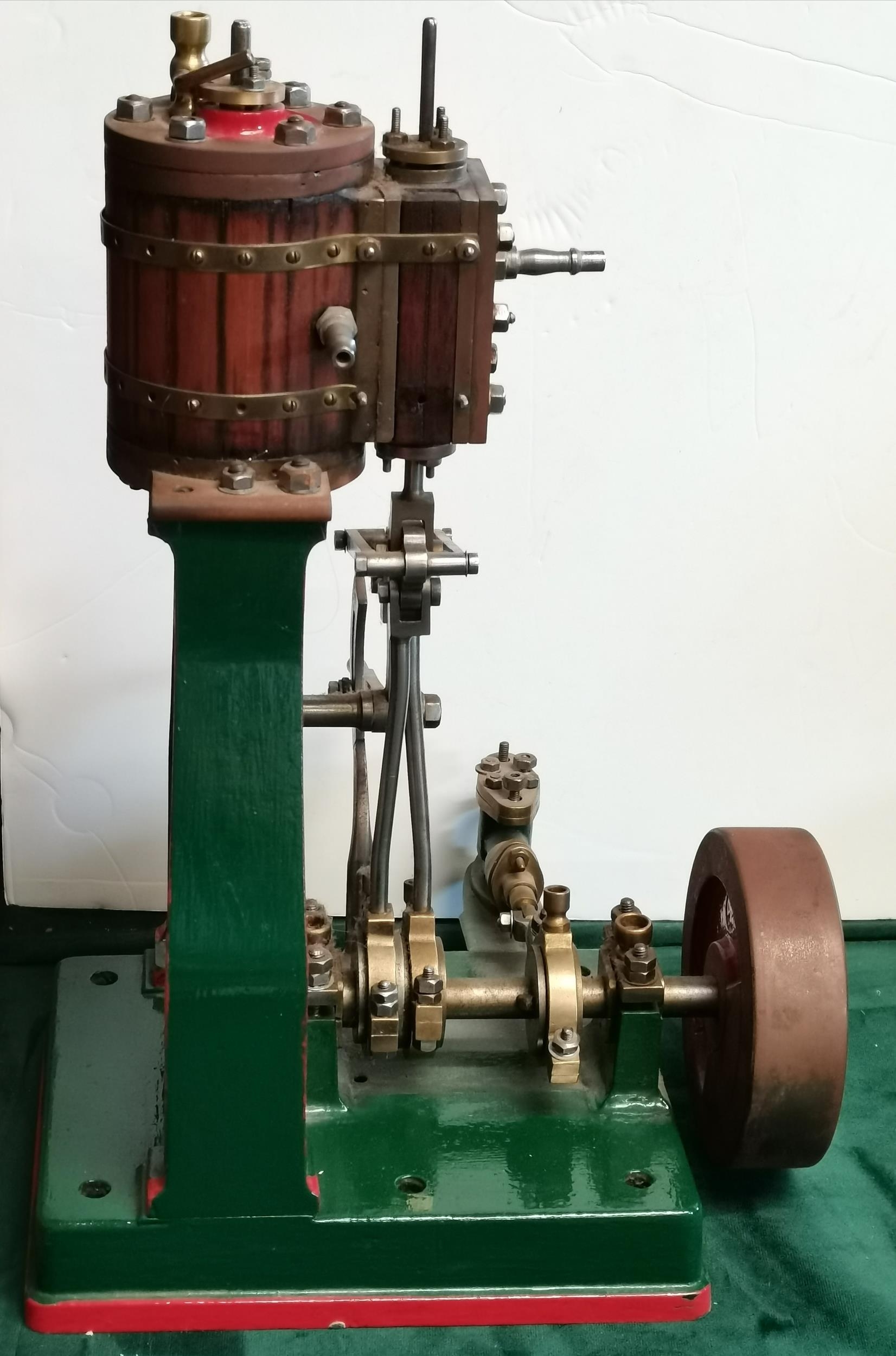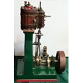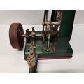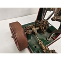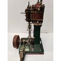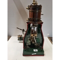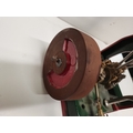 A vertical steam engine model locomotive with reverse, seemingly unmarked, the bodywork painted green with red edging. 47.5cm high overall