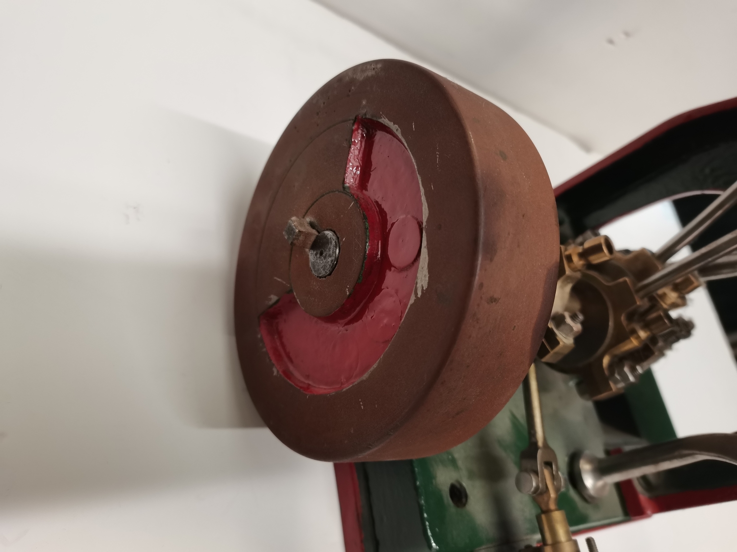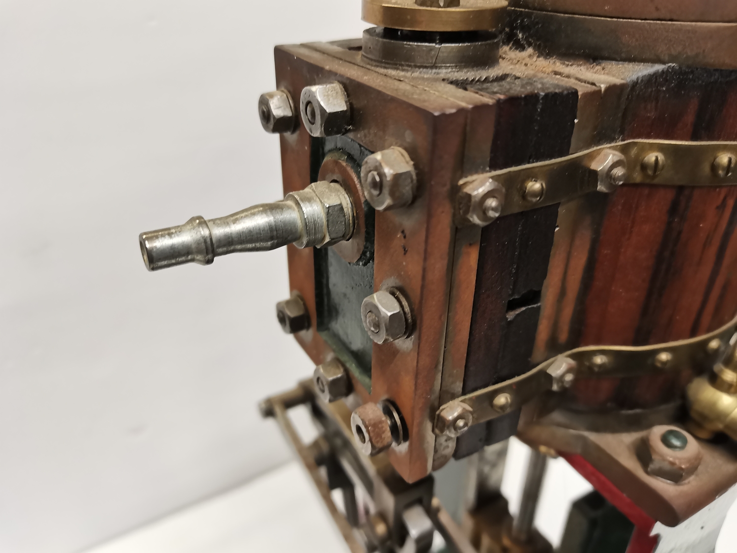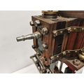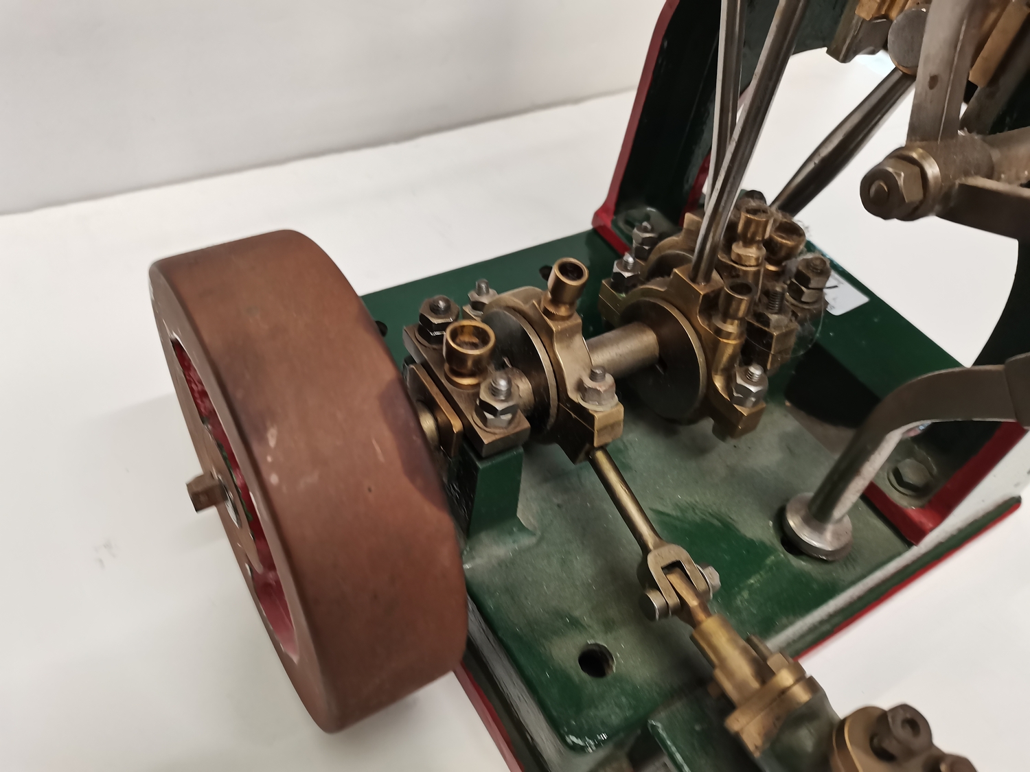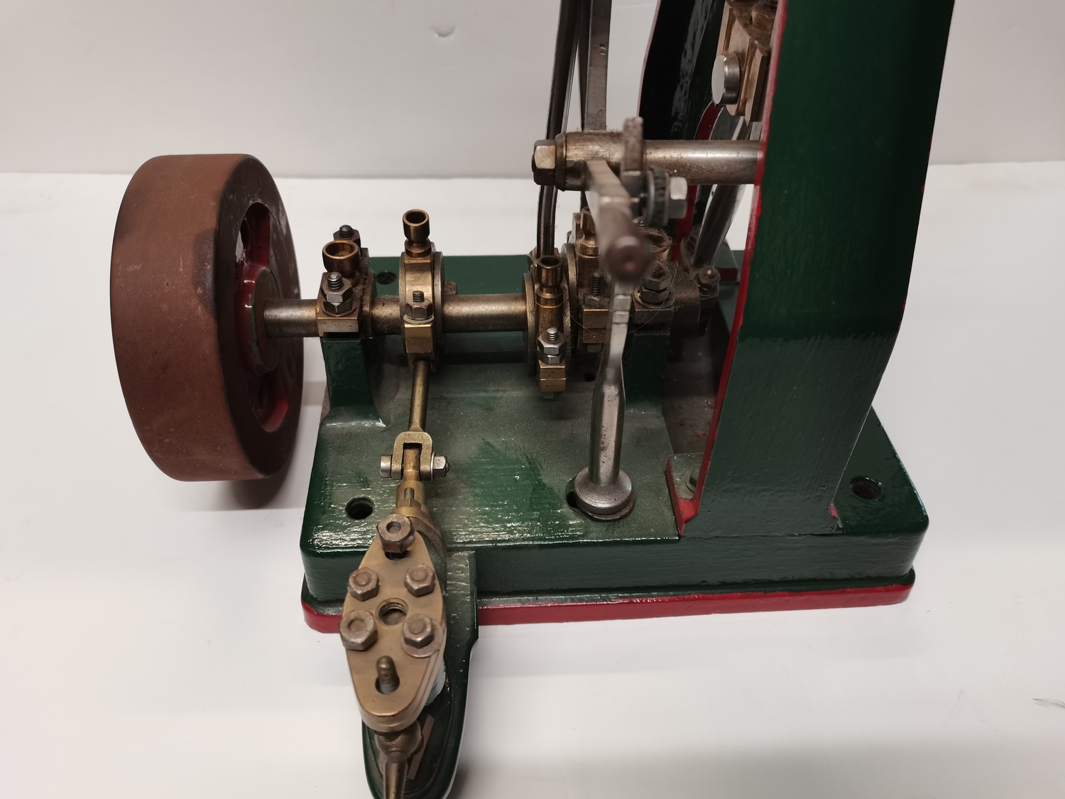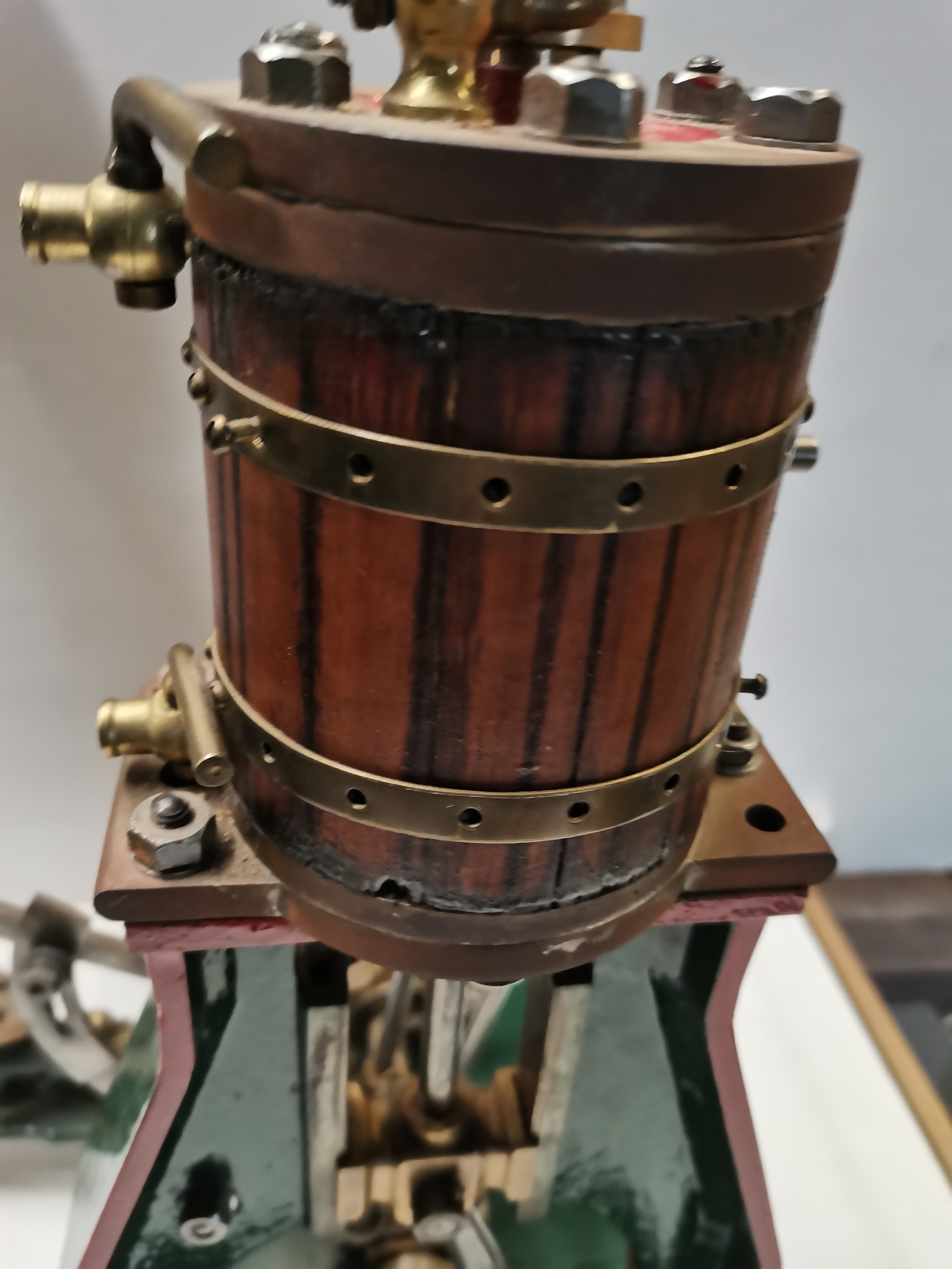 A vertical steam engine model locomotive with reverse, seemingly unmarked, the bodywork painted green with red edging. 47.5cm high overall