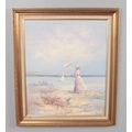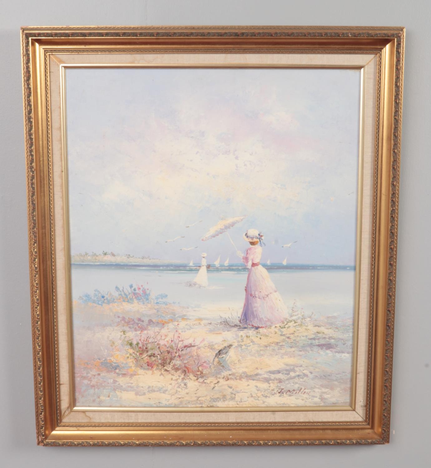 J.Miller, Gilt framed oil on canvas, beach scene with two figures. (60cm x 50cm)