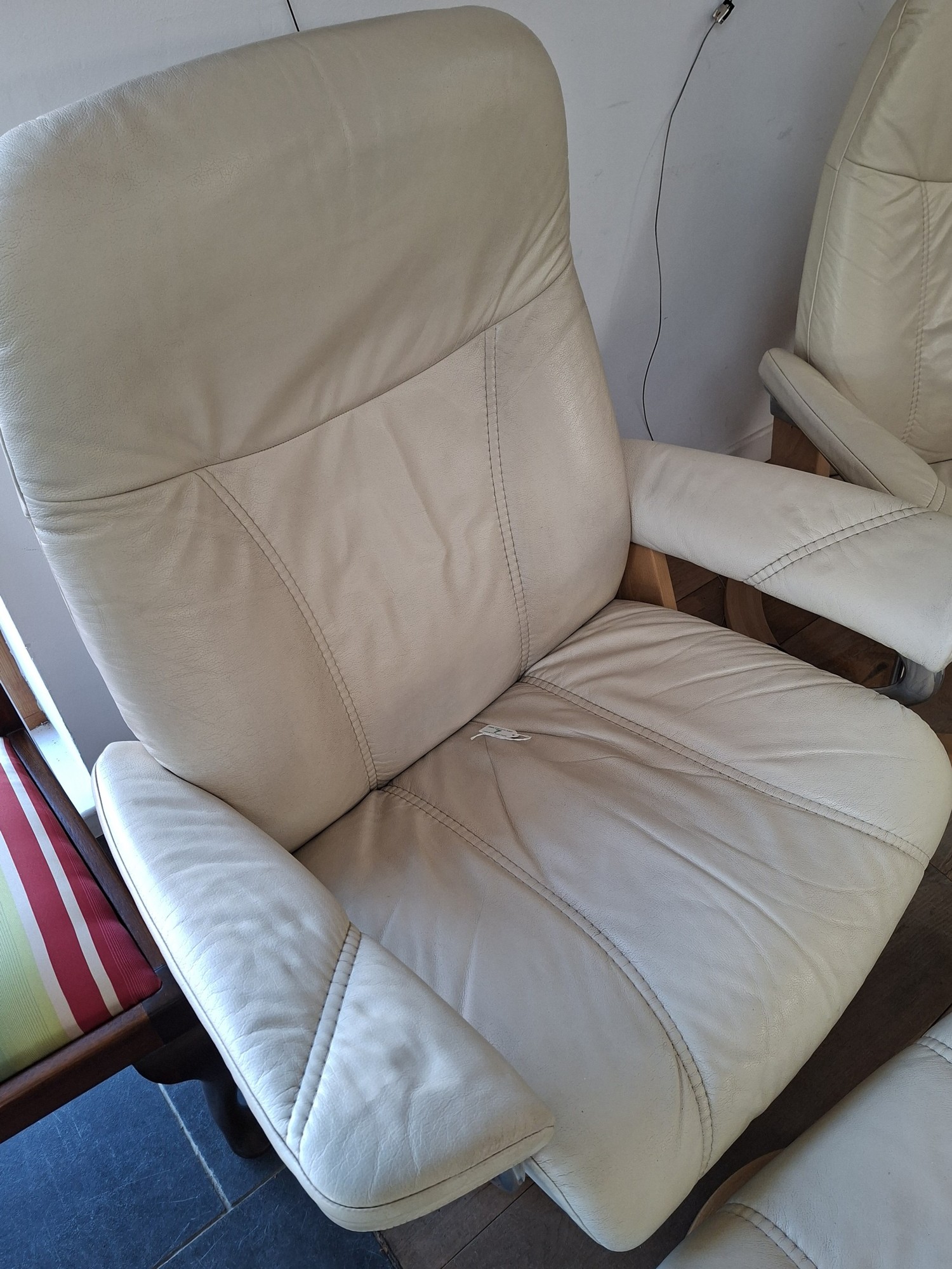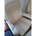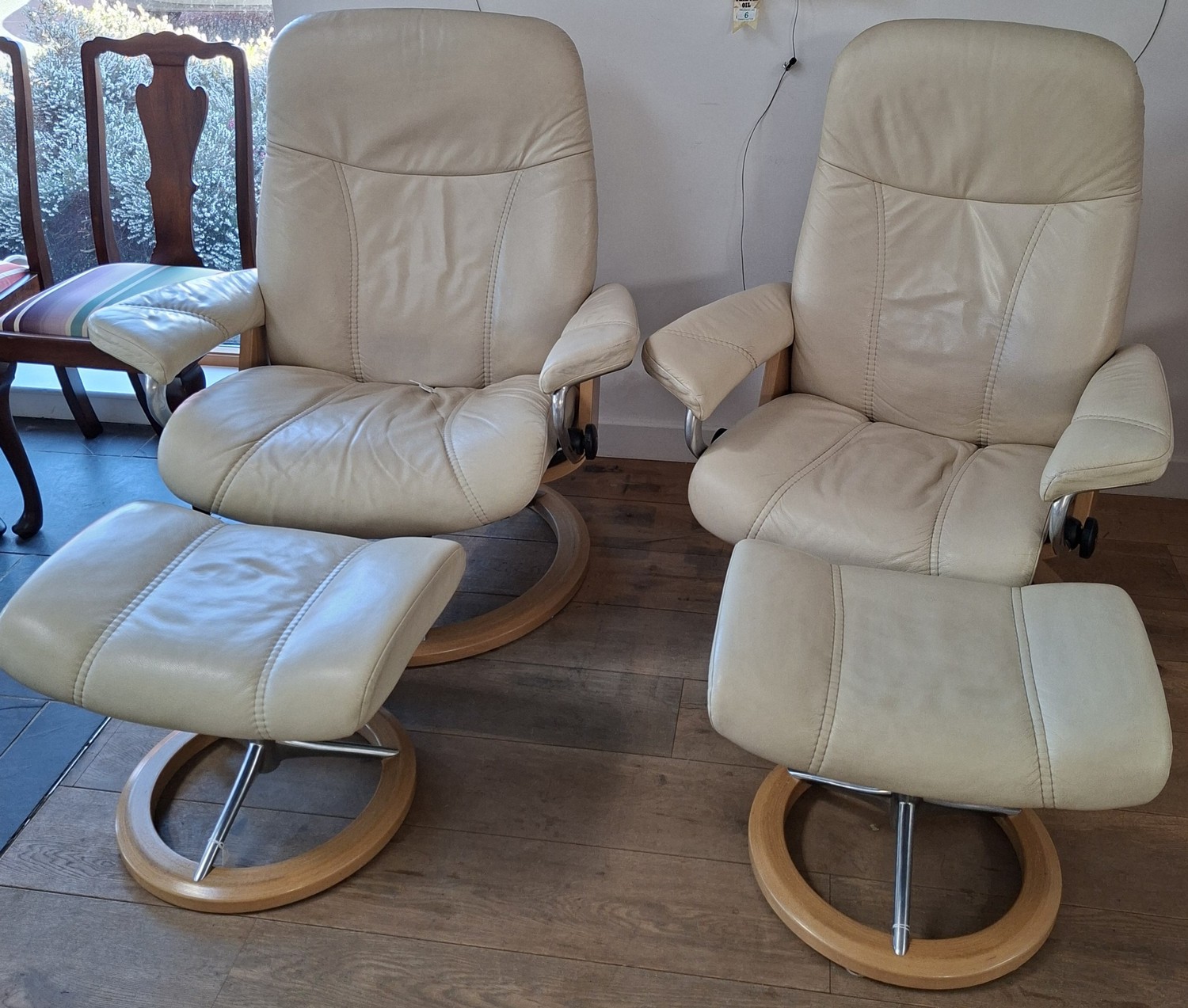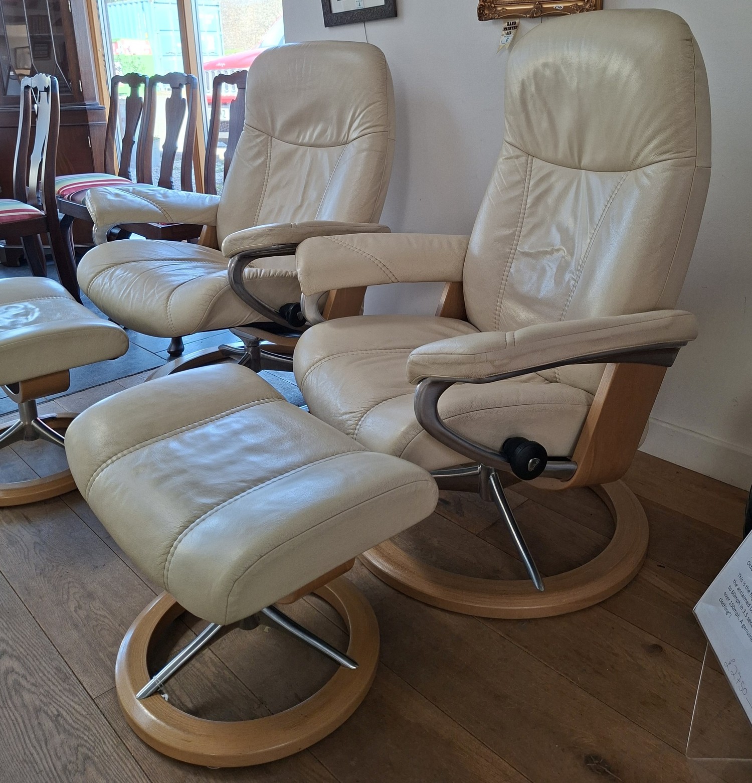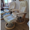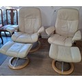 Pair of Ekornes stressless cream leather reclining chairs and footstools