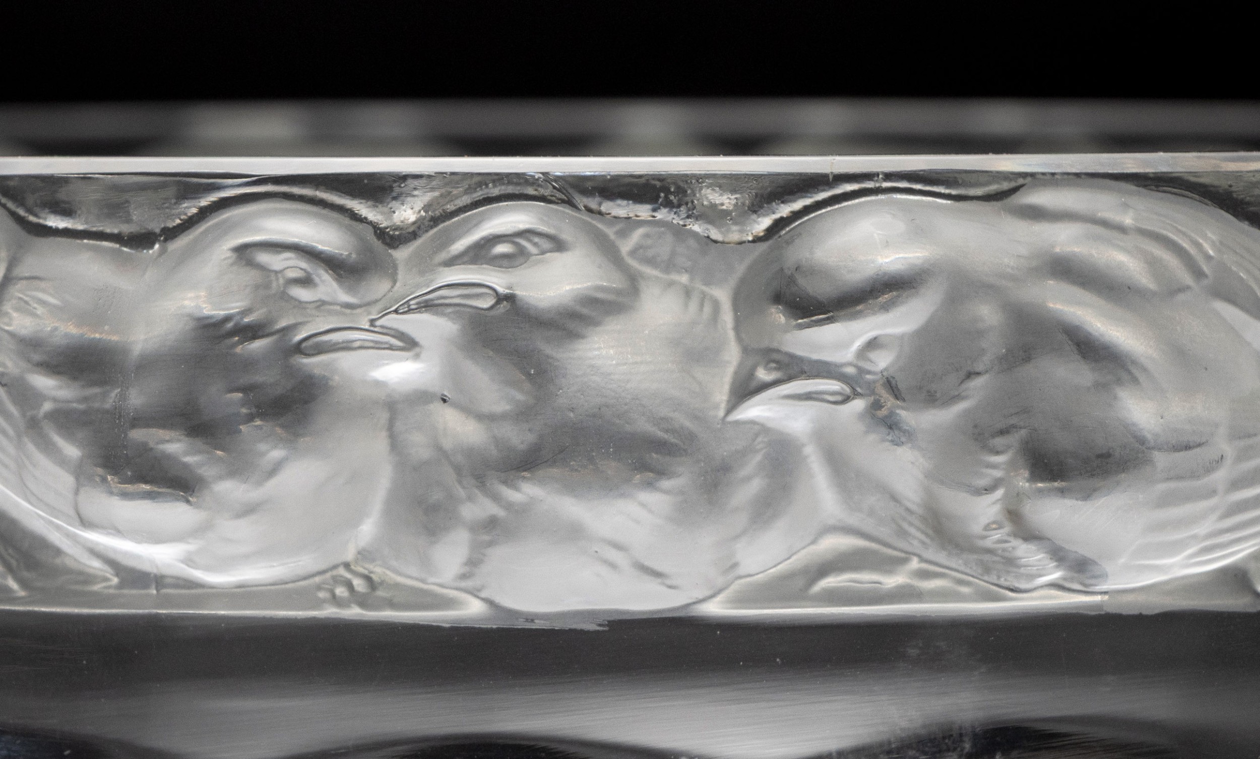 Circular, the the clear glass body with fluted facets below a frosted relief band of birds, engraved mark 'Lalique France’ on flat polished base, wear commensurate with age to base