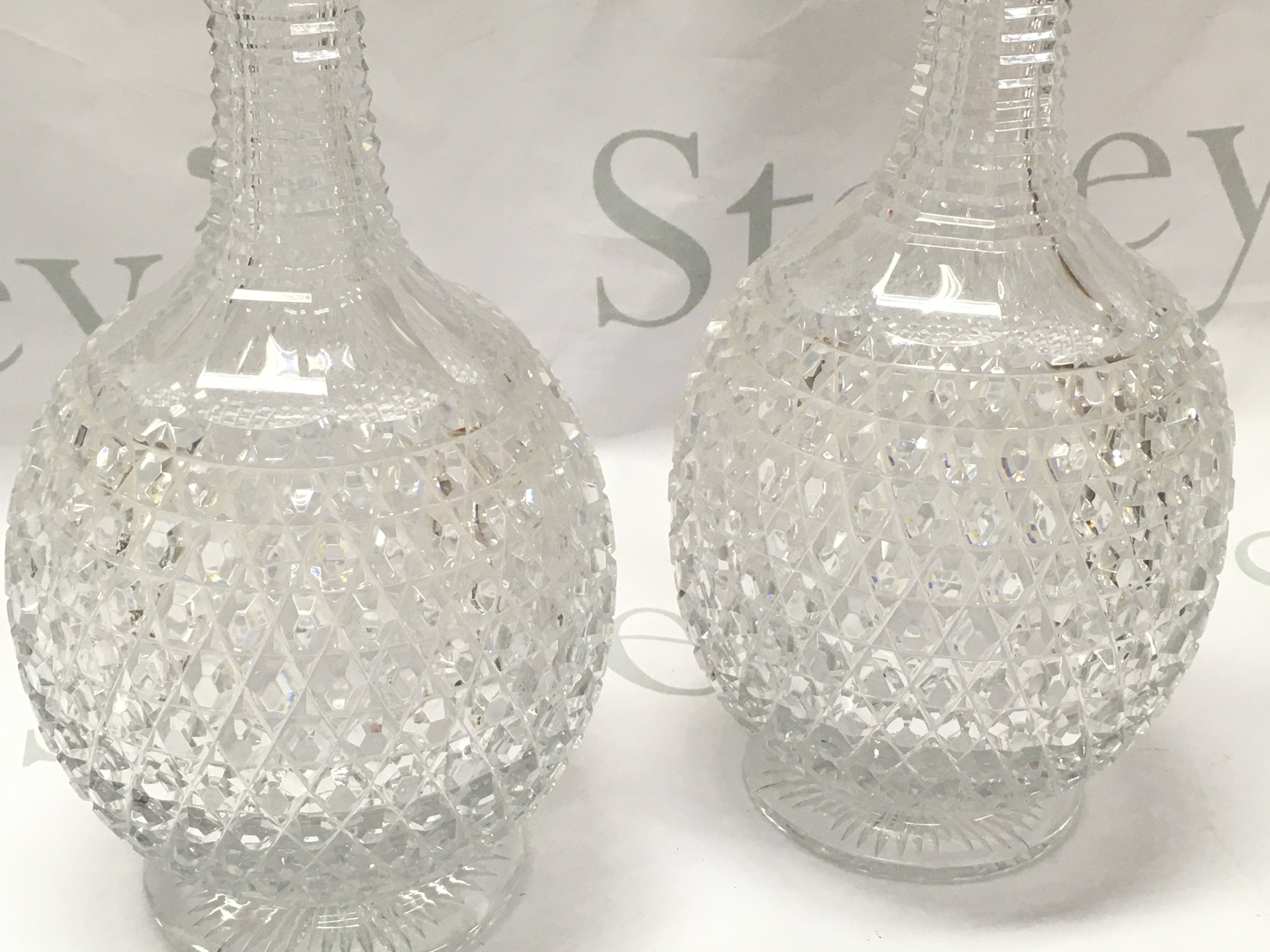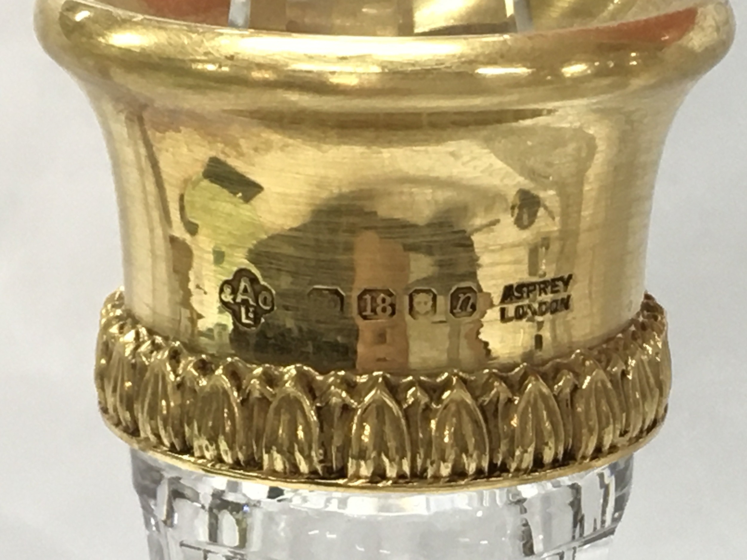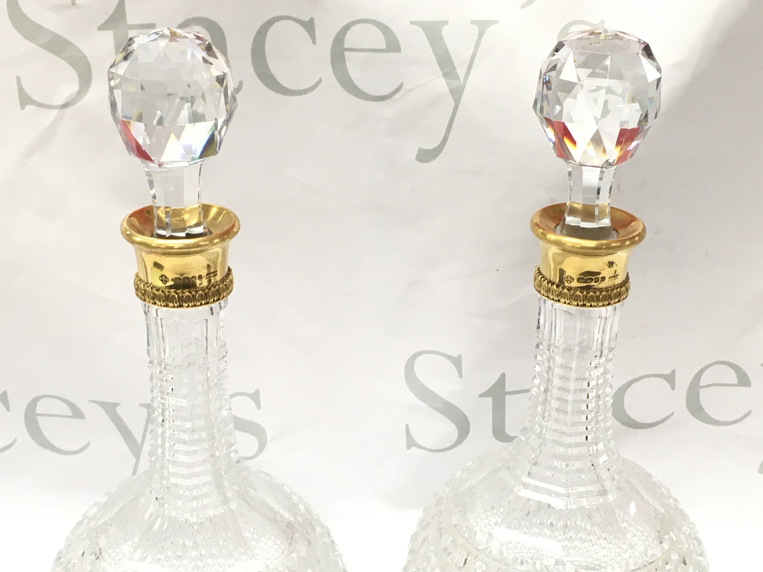 A pair of fine quality 18ct gold rim and cut glass Asprey decanters ,33cm tall. This lot cannot be posted